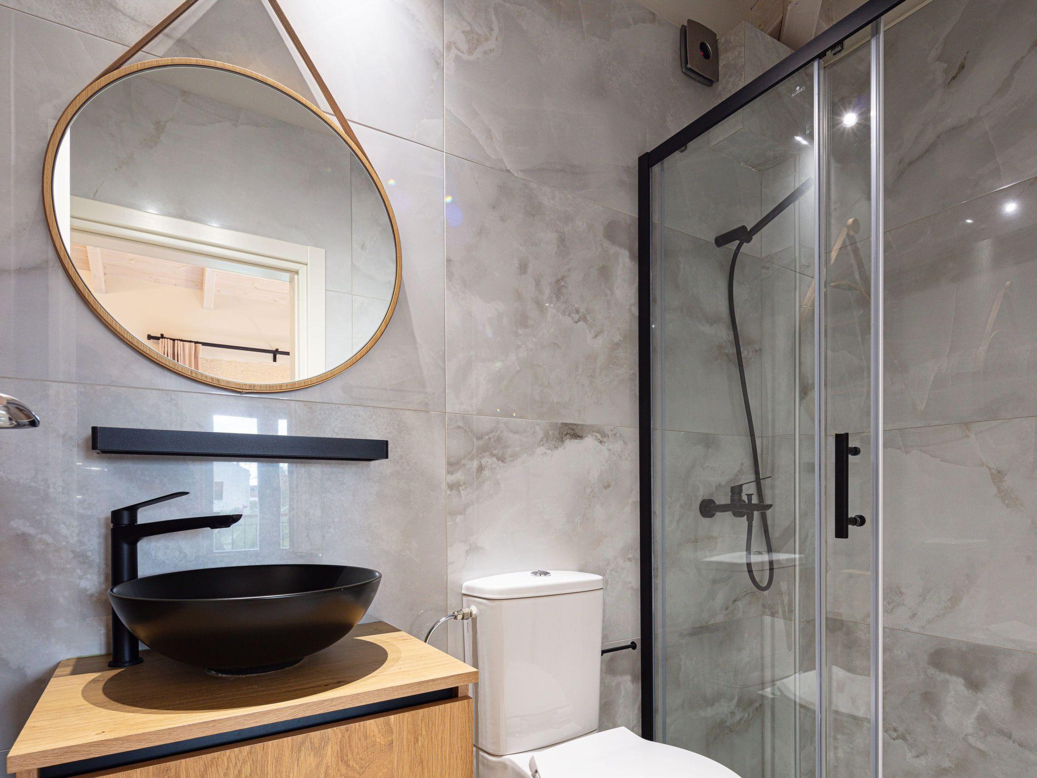 The ground level also hosts a serene bedroom with a king-size bed and a private ensuite bathroom with a walk-in shower. An additional communal bathroom with a shower provides extra convenience for guests.