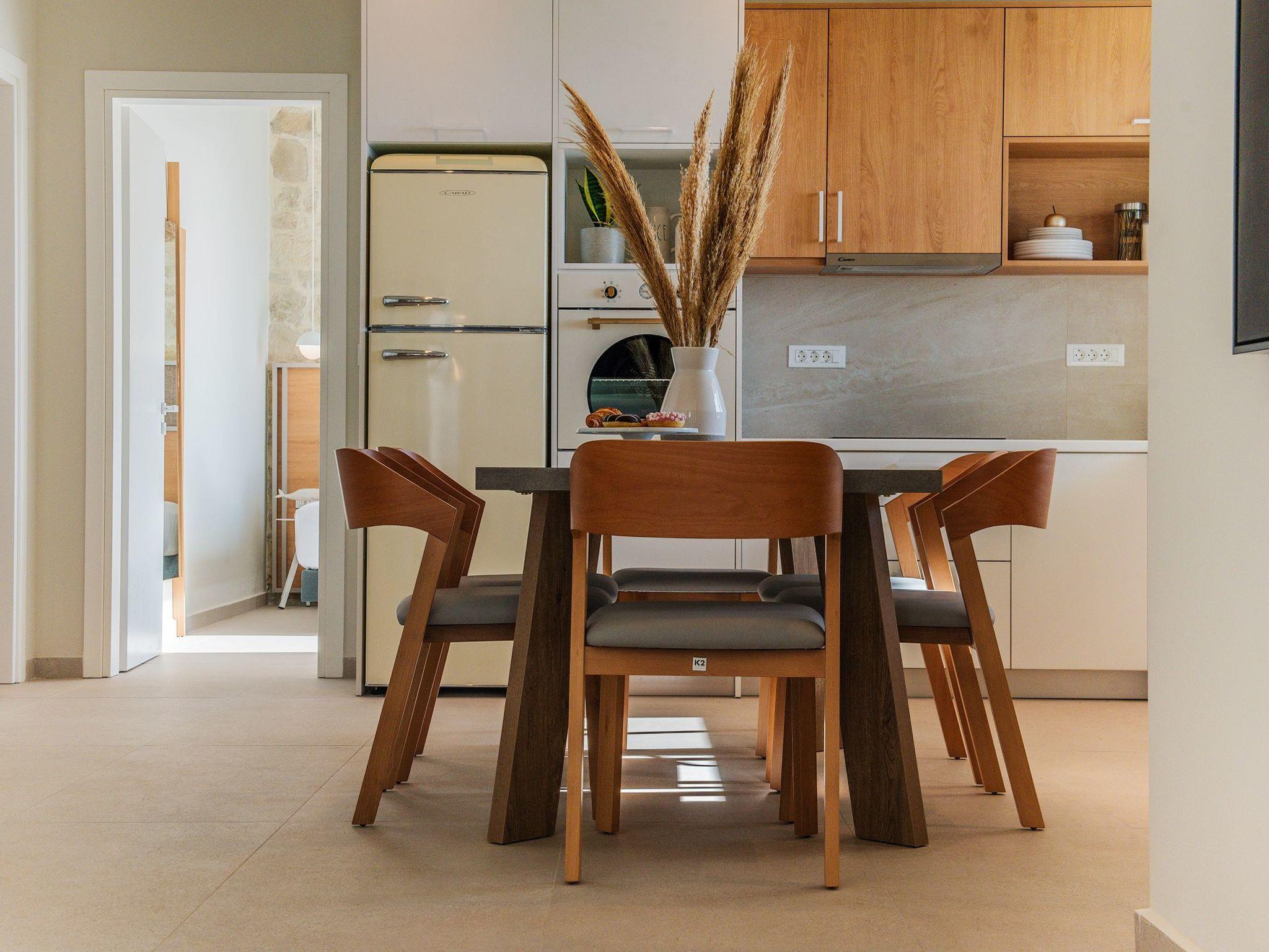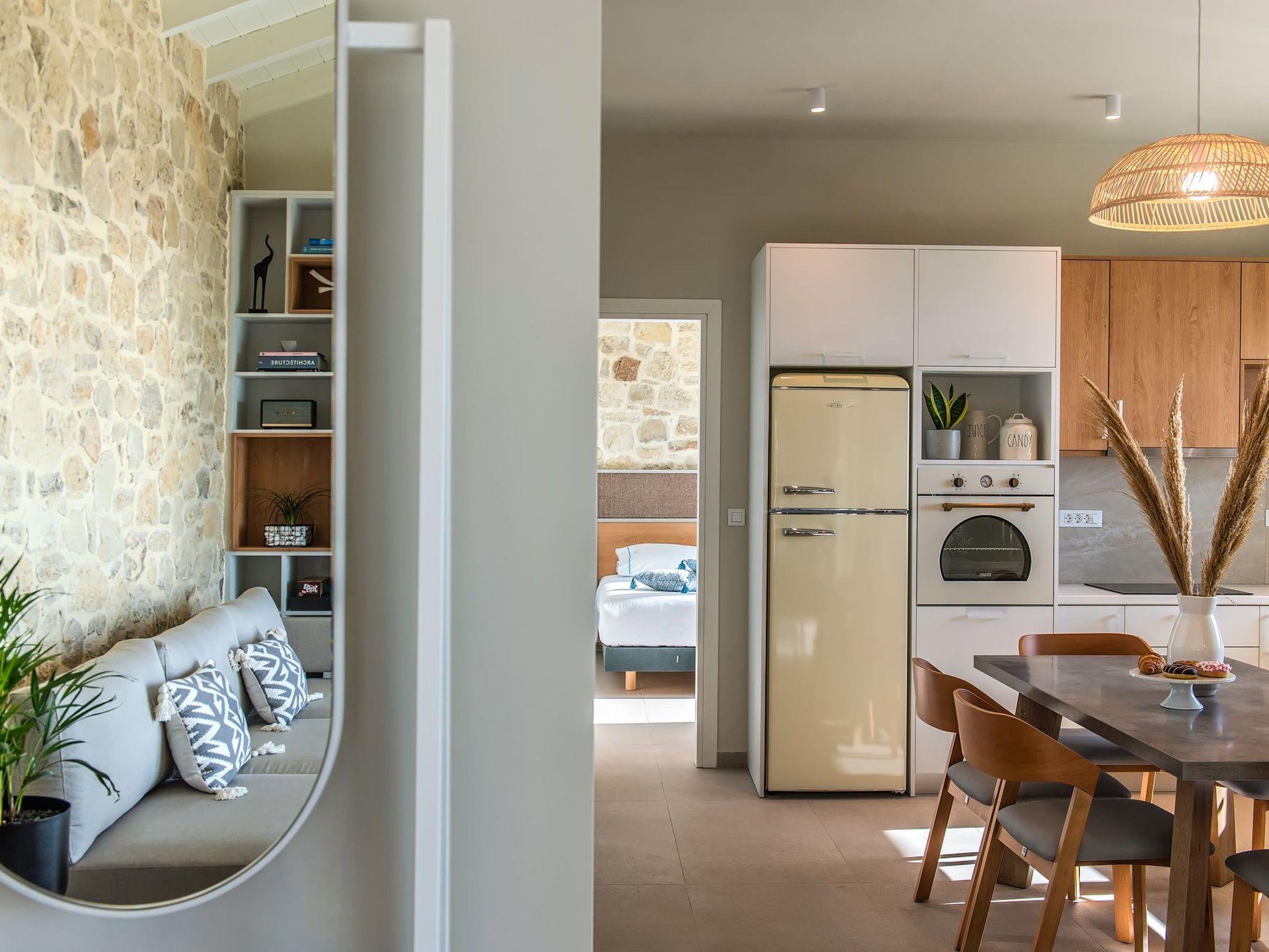The most dominant feature of the exterior area is a swimming pool and a lounge area with sofas making it the ideal spot to relax while gazing at the gorgeous sunset. Pretty close to the pool area exists a dining table for moments of relaxation for you and your family, a BBQ, and sunbeds to enjoy the Cretan sun. Don’t forget that a secure parking area is provided outside of the villa.
