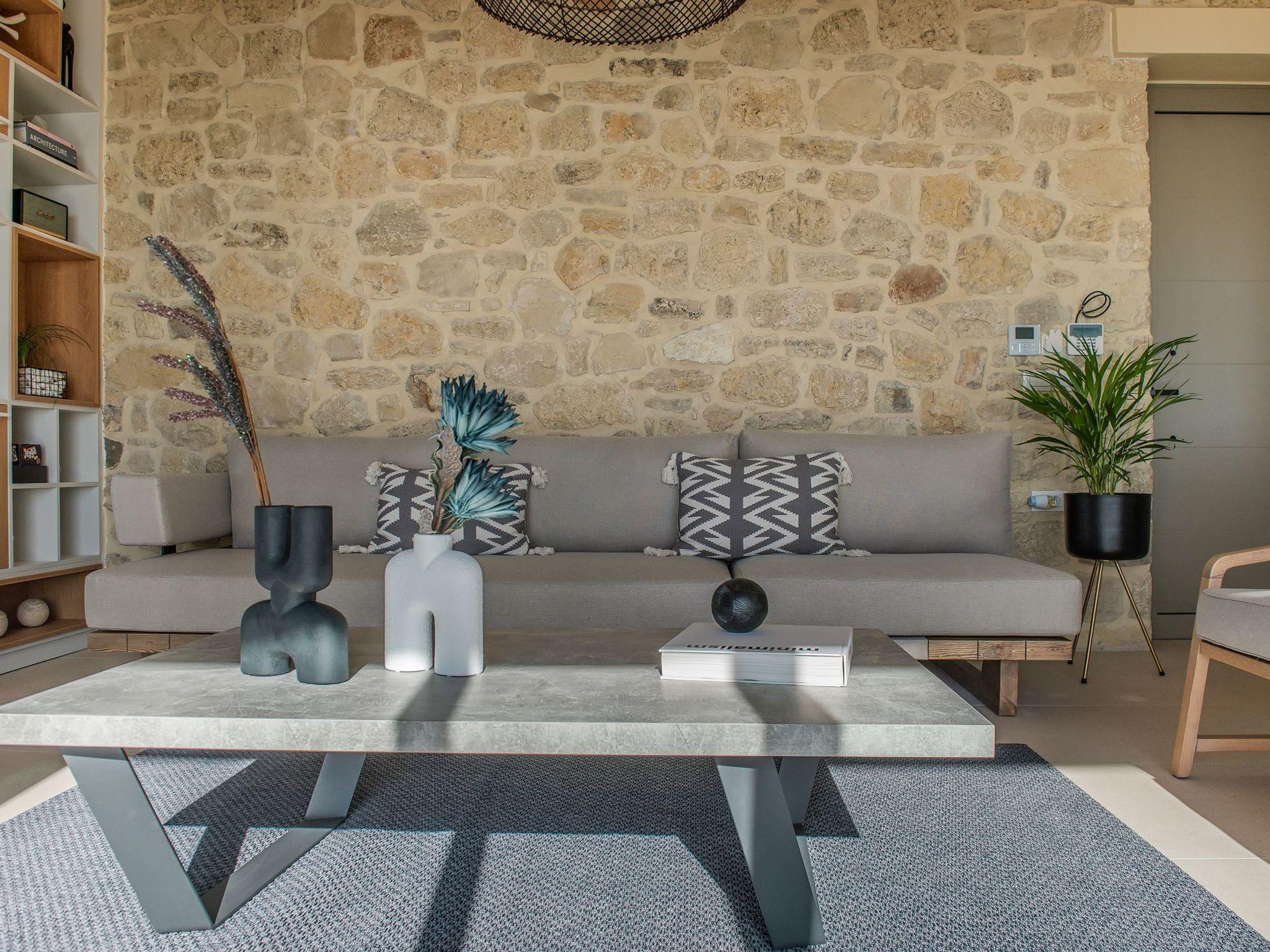 The most dominant feature of the exterior area is a swimming pool and a lounge area with sofas making it the ideal spot to relax while gazing at the gorgeous sunset. Pretty close to the pool area exists a dining table for moments of relaxation for you and your family, a BBQ, and sunbeds to enjoy the Cretan sun. Don’t forget that a secure parking area is provided outside of the villa with a charger for the electric cars.