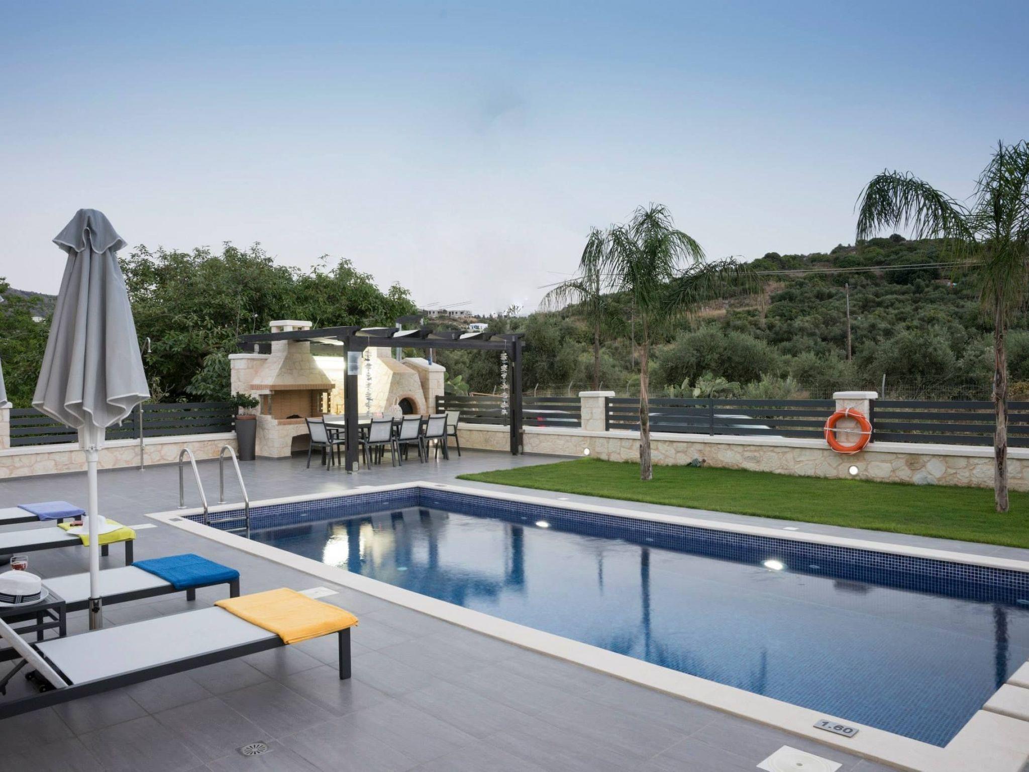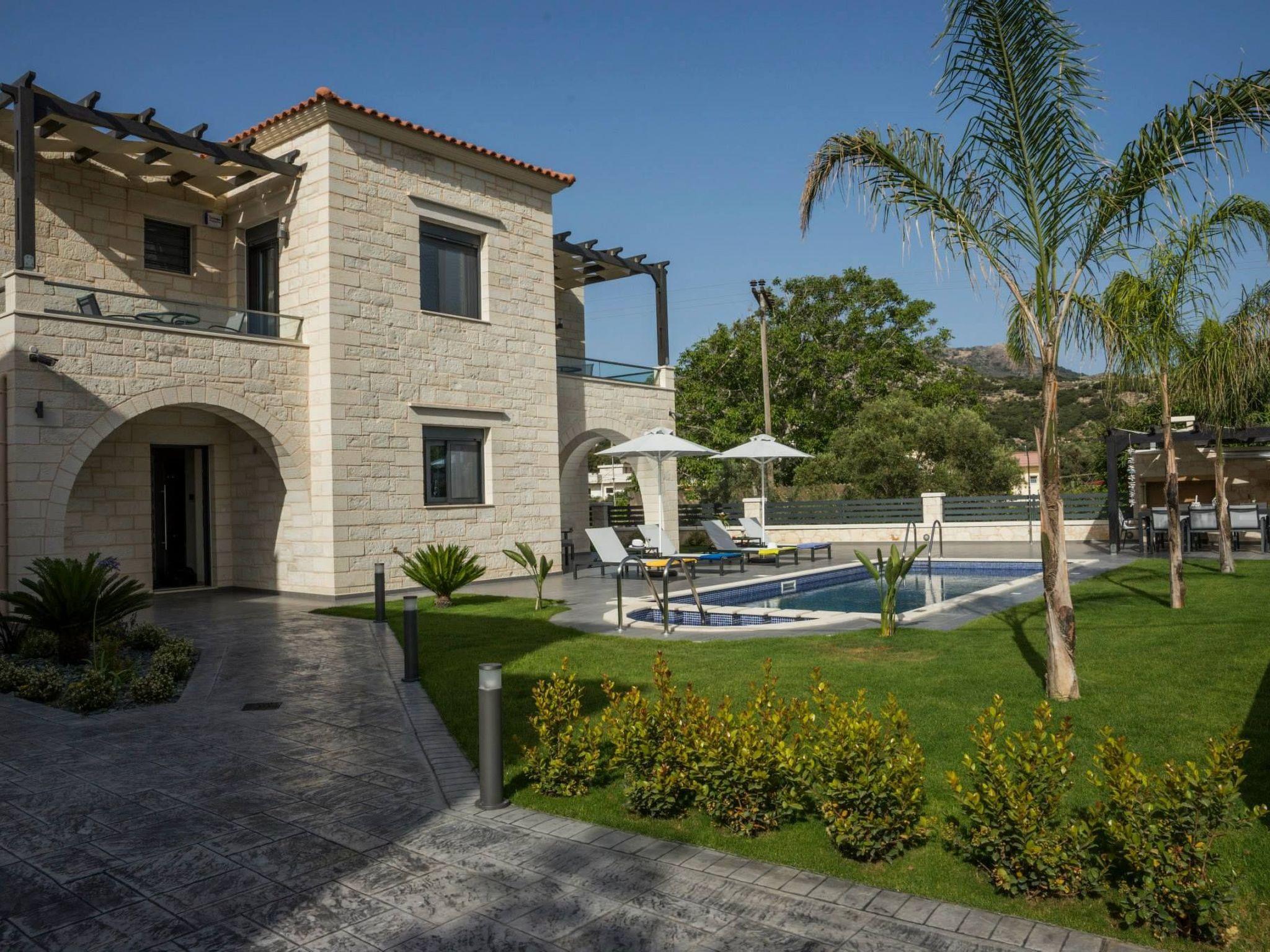 Villa Azalea is situated in the village of Almyrida at Chania, only a few meters away from the beach. The 160 square meters villa can accommodate up to 8 people in the 4 bedroom (3 double bedrooms and 1 twin bedroom) and 4 Wc (3 ensuite). At the comfortable dining table eight people can eat while in the kitchen you will find very rich equipment variety. The stone villa is decorated in bright and earthy colors , it includes BBQ facilities and an outdoor dining area with outdoor furniture and sun beds and umbrellas next to the swimming pool. The pool is suitable for younger ages. In all the villa areas is provided with free WiFi and rooms are air conditioned .The living room offers a fireplace, a 42 inches satellite TV and a DVD player with high audio quality. Guests can enjoy from their balcony mountain views, the garden and the pool. Bedrooms have safe and beds have anatomic mattresses, hypo allergic pillows and also clean towels-slippers are provided. It also includes a hammam. Upon arrival, guests are offered a treat. The villa has a private secure parking. Check out is 11:00 latest and check in is 15:00 earliest.