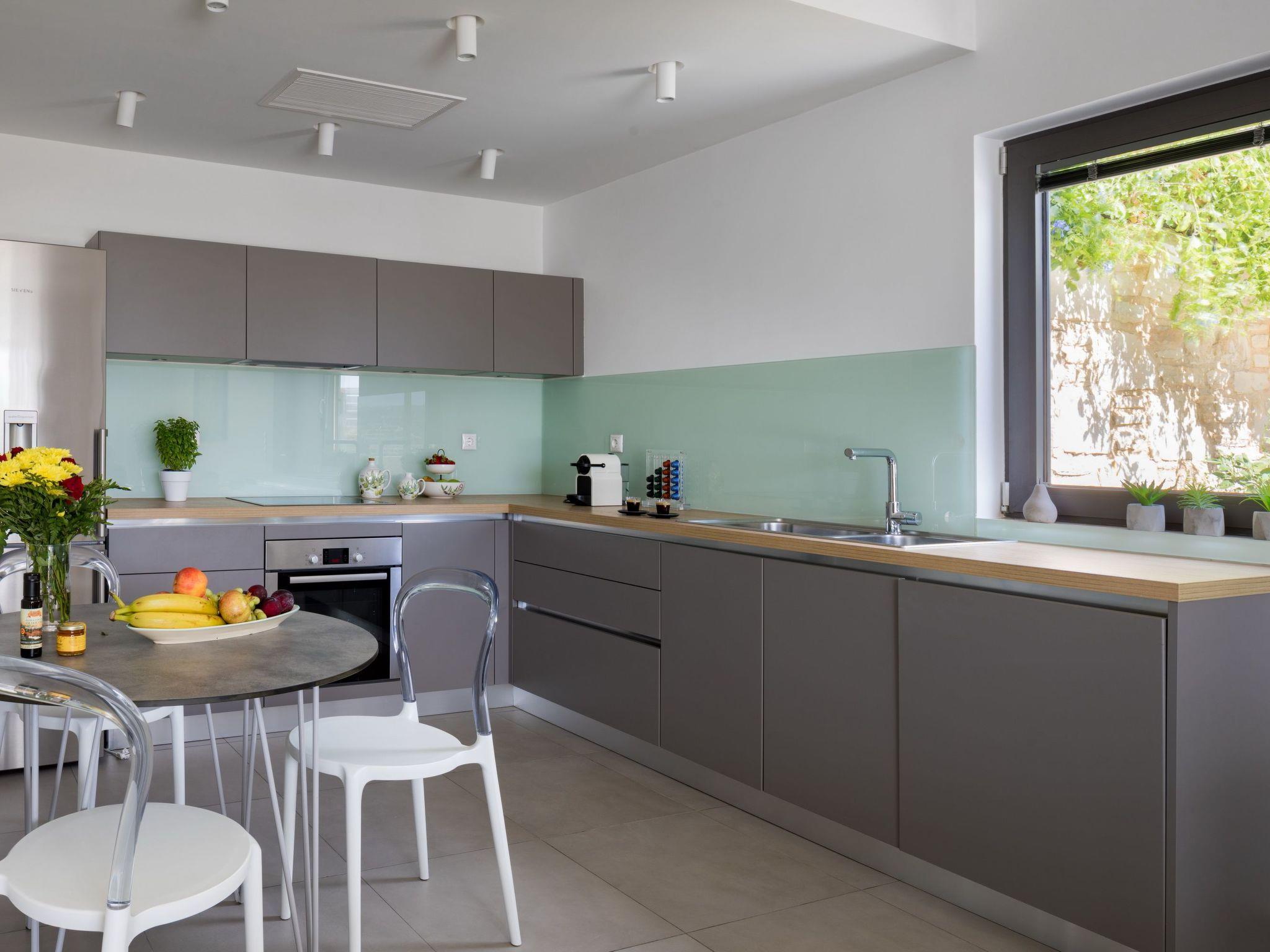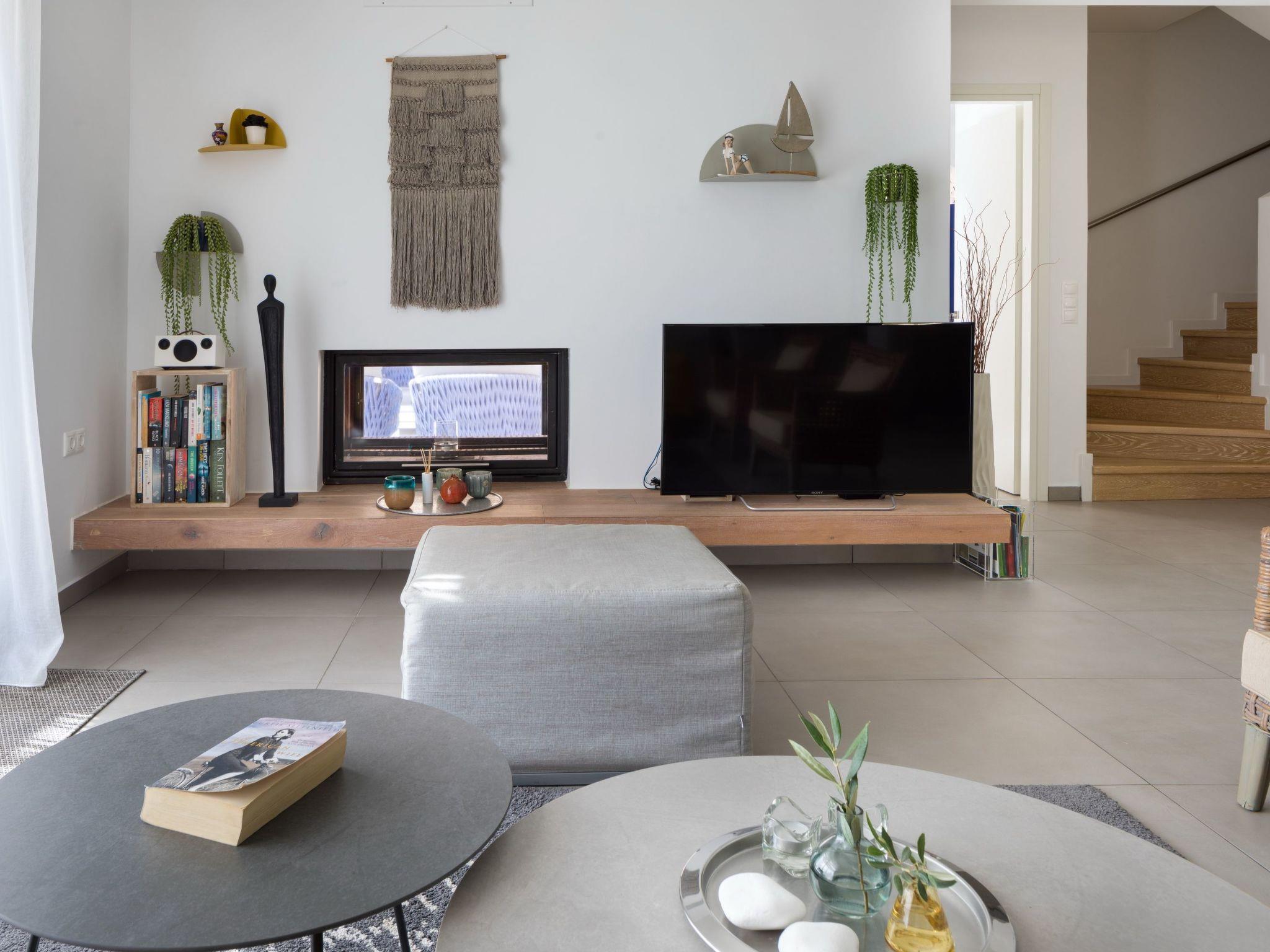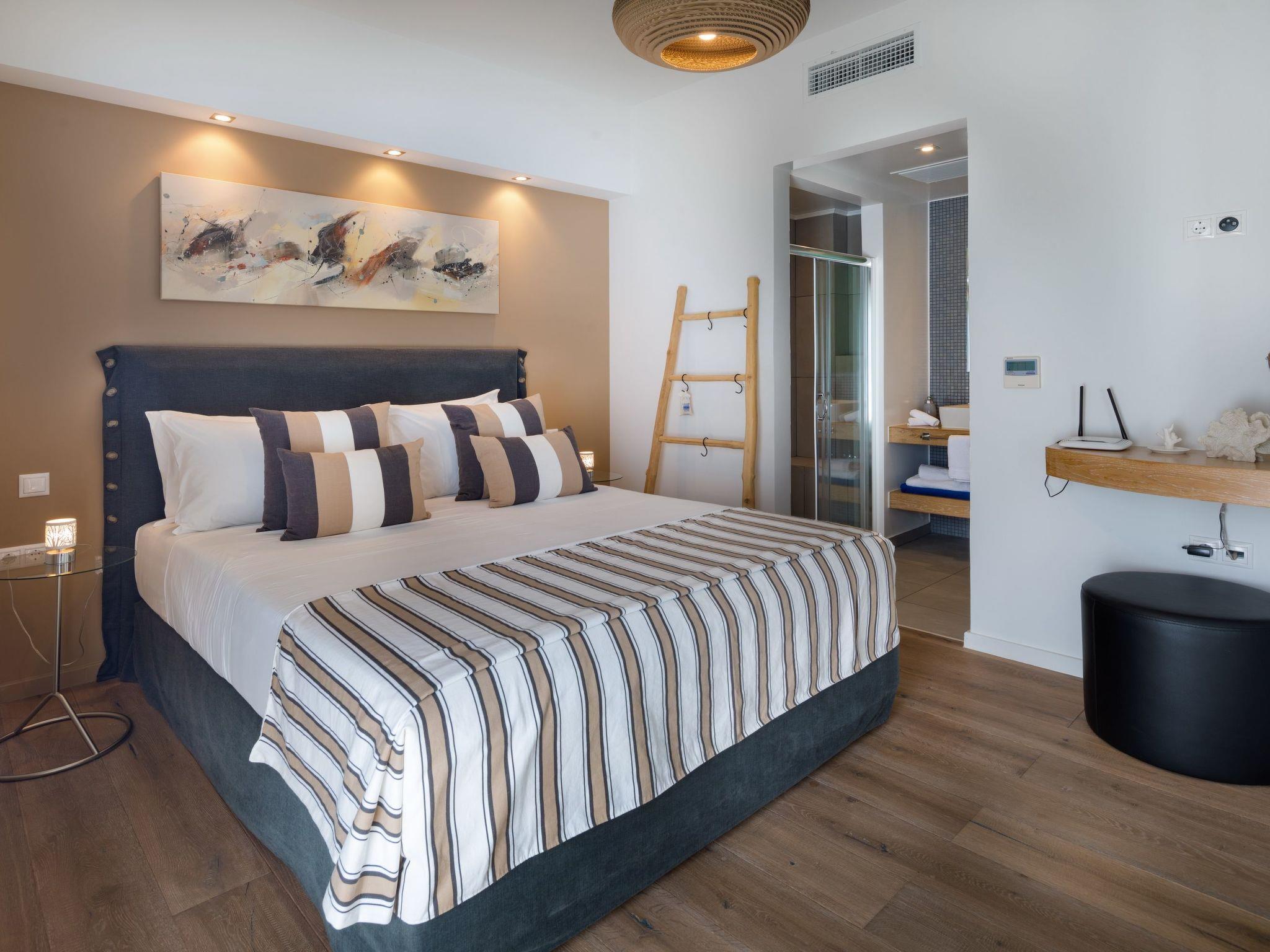 The villa's interior is a blend of elegance and comfort, featuring air conditioning, two bedrooms, and two bathrooms to accommodate four adults and a child comfortably. The masterful design incorporates stone, glass, wood, and warm colors, providing a sophisticated yet cozy atmosphere. The living room, complete with a fireplace, opens onto the pool area, inviting guests to unwind and enjoy the view. A fully-equipped kitchen with dining space allows for culinary adventures with fresh herbs from the garden. Comfortable bedrooms, equipped with double beds and the option for a child's bed upon request, ensure restful nights. Modern shower rooms add to the overall luxury of the villa.