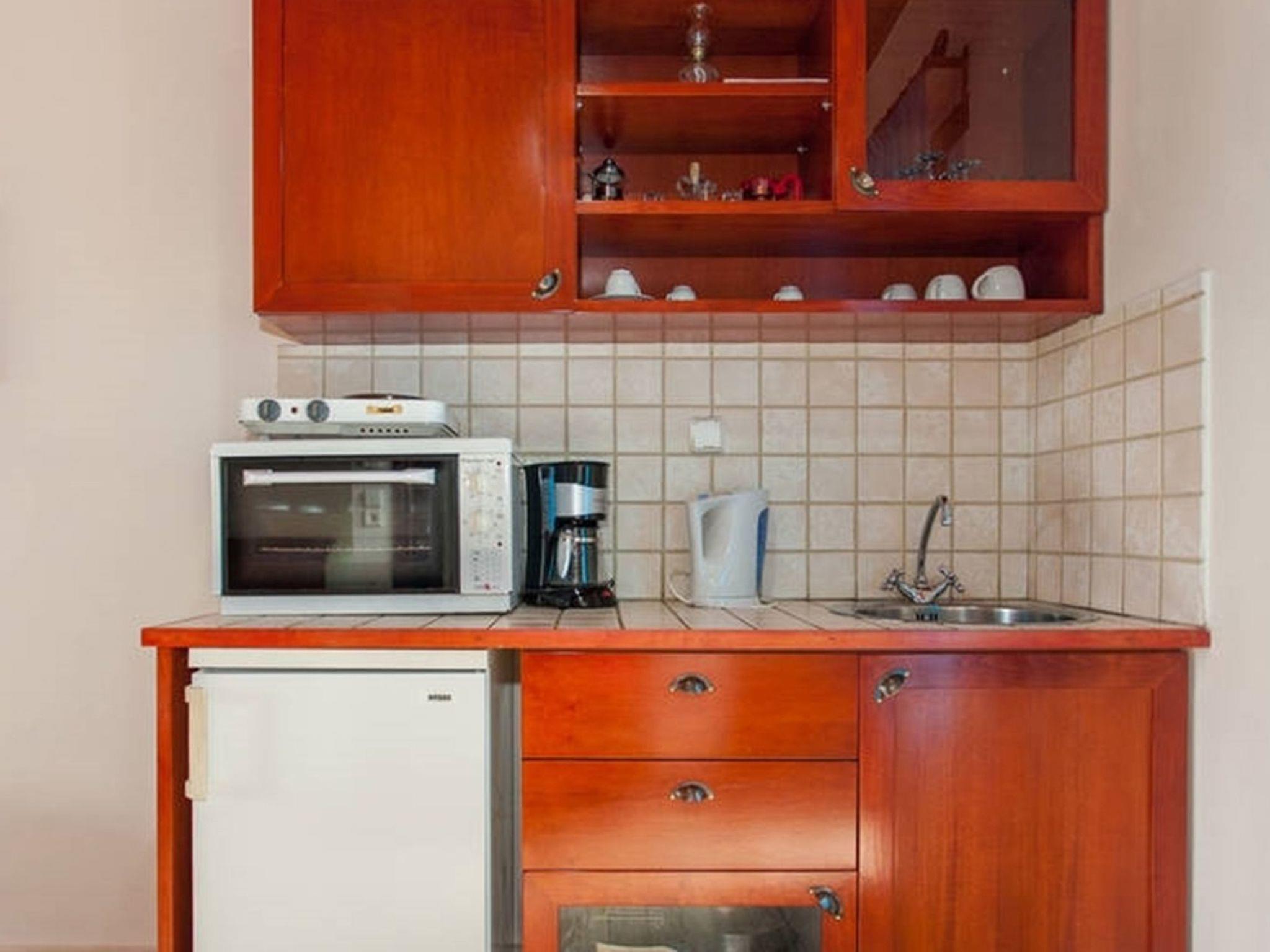 The air-conditioned holiday house is on two floors and can accommodate four people. The ground floor consists of an open living room and bedroom with a kitchen, providing two single beds and a dining table with four chairs. The kitchen unit is equipped with a two-ring hob, a fridge with a freezer compartment, a microwave, kettle, toaster and coffee machine. The bathroom has a bath, washbasin and toilet. Stairs lead to the upper floor with a bedroom with two single beds that can be pushed together and a wardrobe.