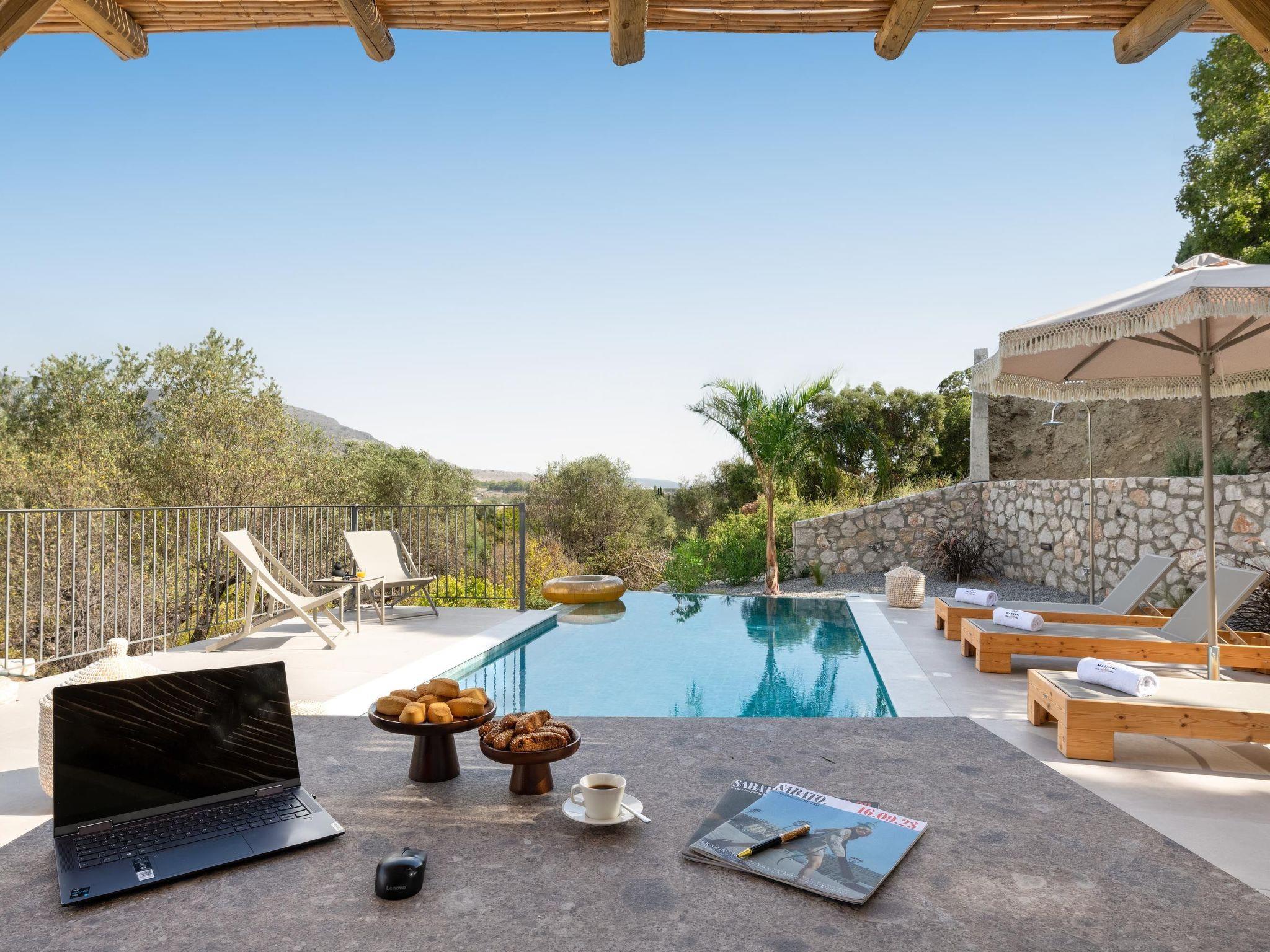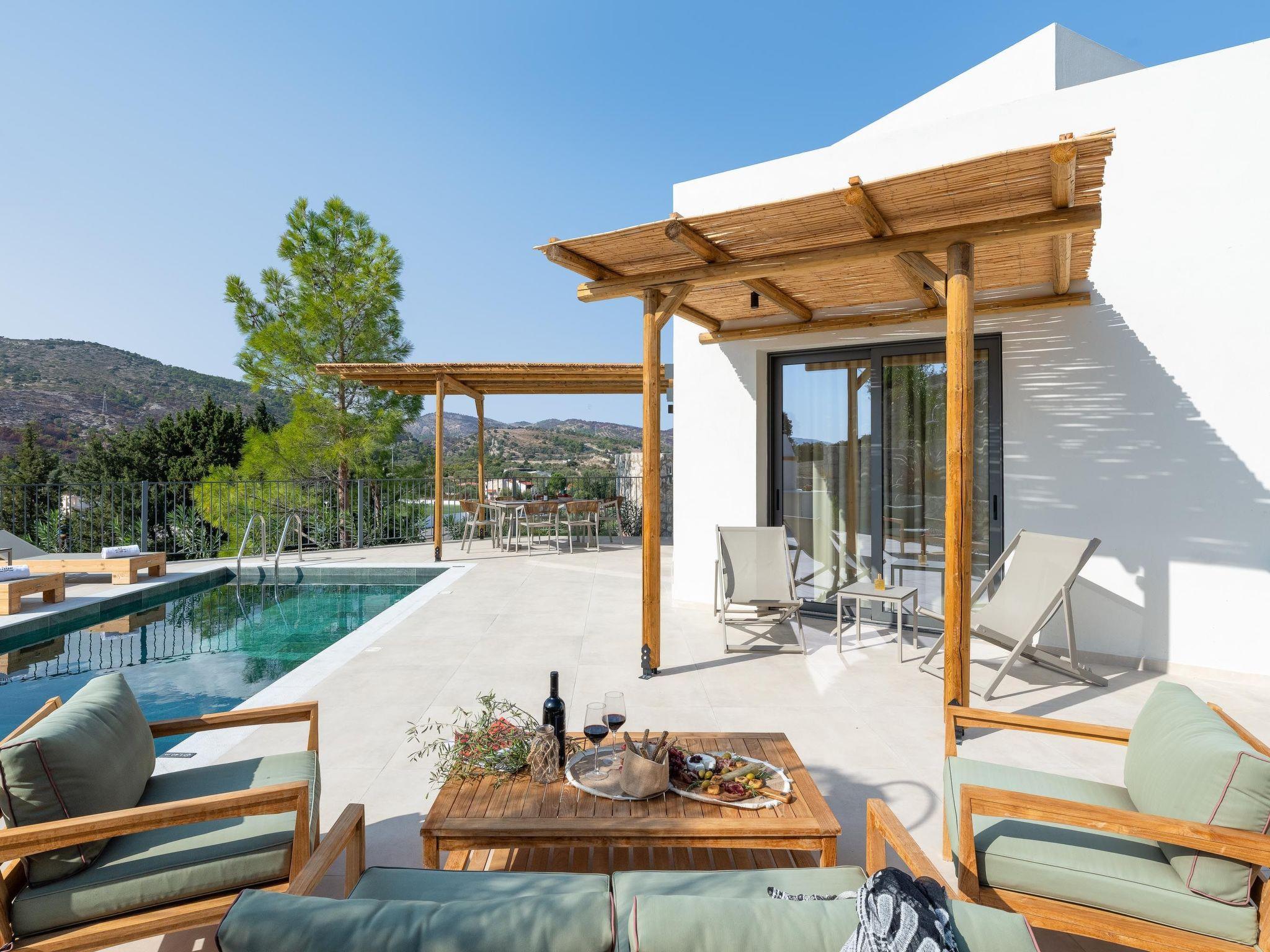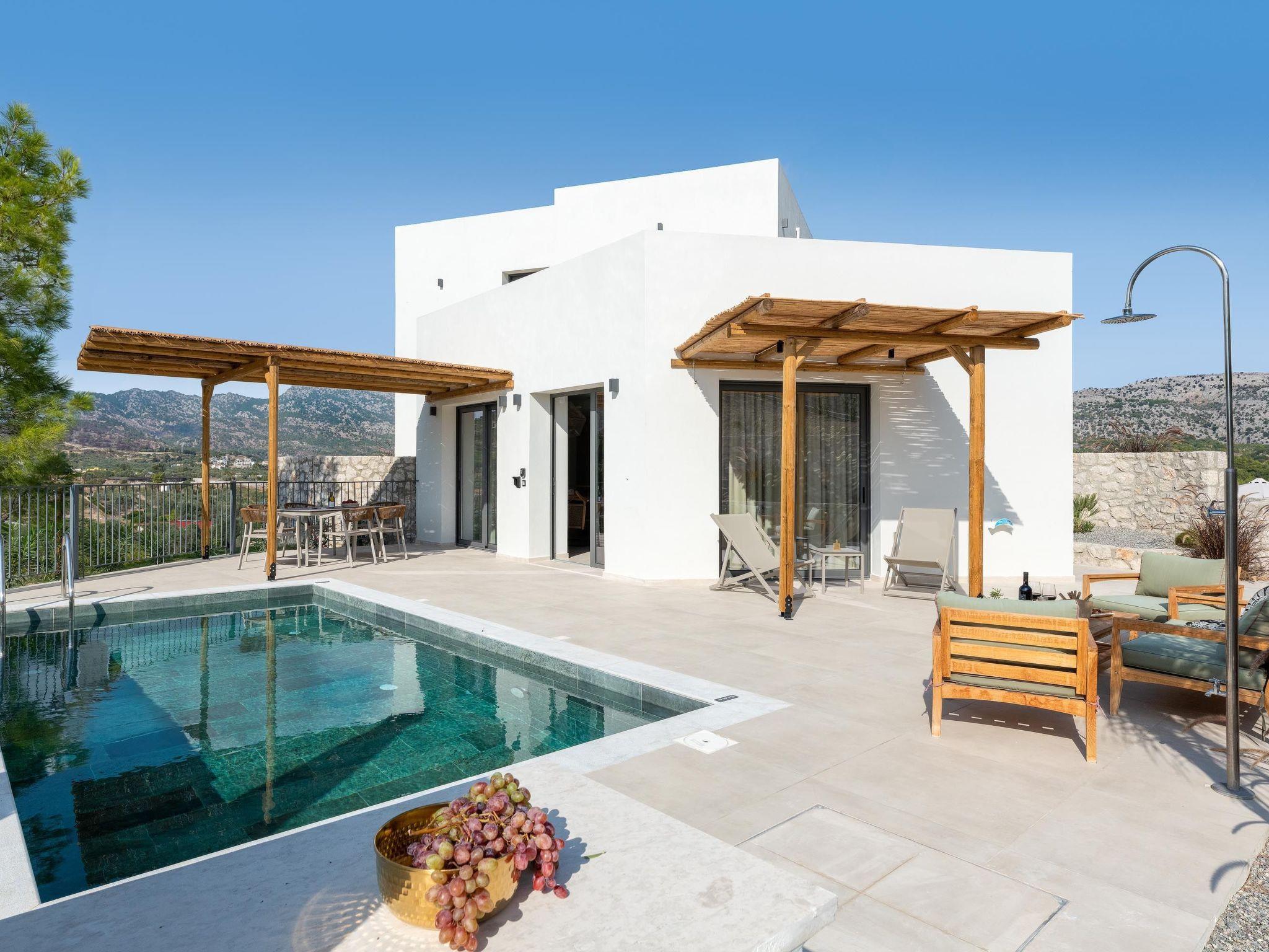 Massari Hills Luxury Living are 15 fantastic brand-new properties designed in unique minimal architecture with unique warm-colored details. They are located in Massari, only a 5-minute drive from Charaki beach. All of the modern villas provide you with all comforts, private swimming pools and patios in a unique design. There is an outdoor sharing gym and each villa offers a BBQ installation. Each property accommodates up to 8 guests.