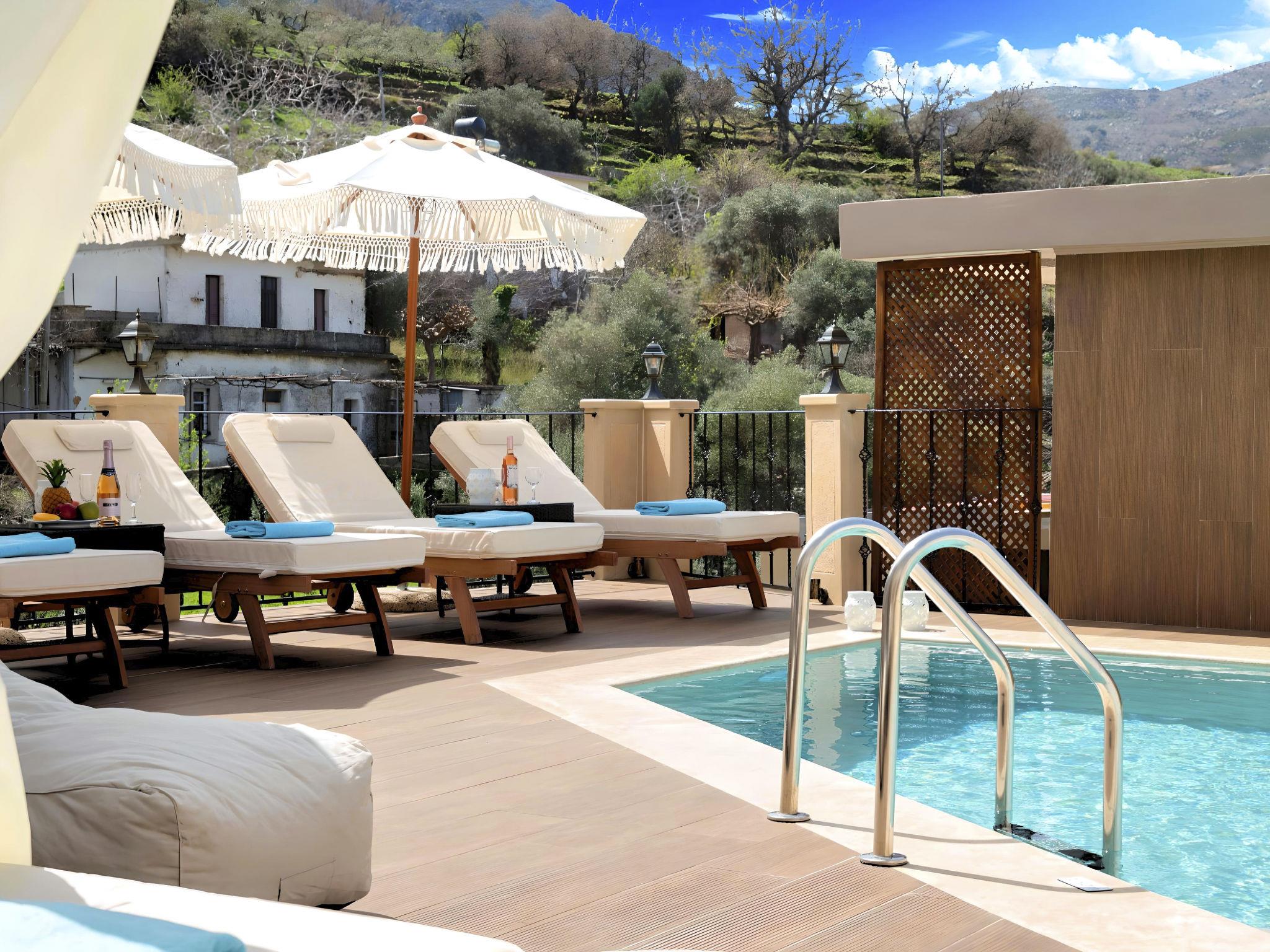 Outside, the mansion showcases its splendid traditional stone architecture, complemented by modern amenities such as a private pool, where guests can enjoy refreshing swims or relax by the poolside. The outdoor area is designed for ultimate relaxation and enjoyment, featuring a terrace and a balcony where you can unwind and soak up the serene surroundings. The mansion's positioning offers a unique vantage point amidst mountains and valleys, providing a tranquil escape from the hustle and bustle.