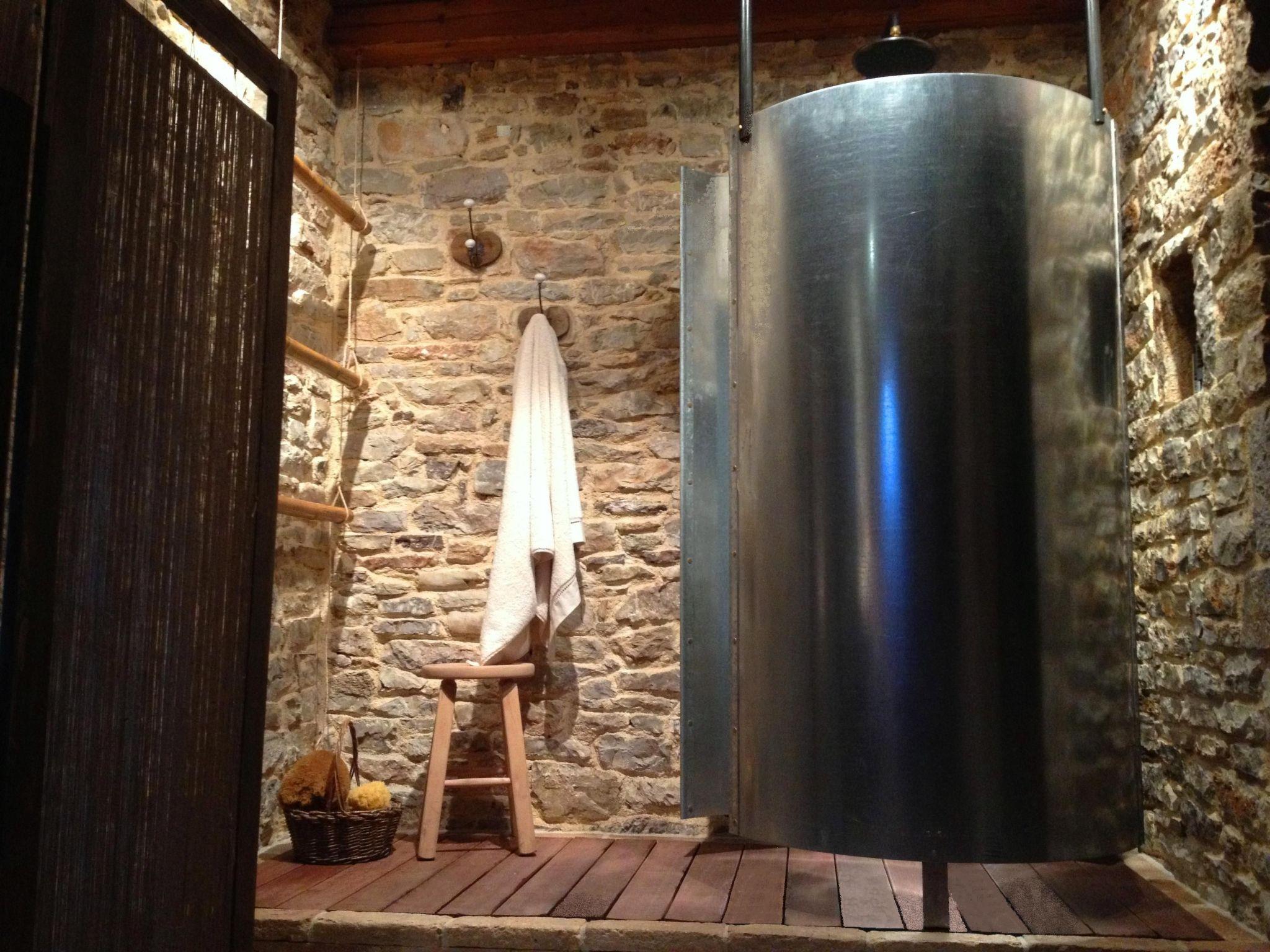 The upper floor consists of a large room (50m2) with vaulted beamed ceiling and fireplace, its 6 windows offering views in all directions. There is a sitting area focused on the fireplace and a large writer's desk. This room gives onto a terracotta surfaced terrace (35m2) which overlooks the garden and is ideal for al fresco dinners and star-gazing.