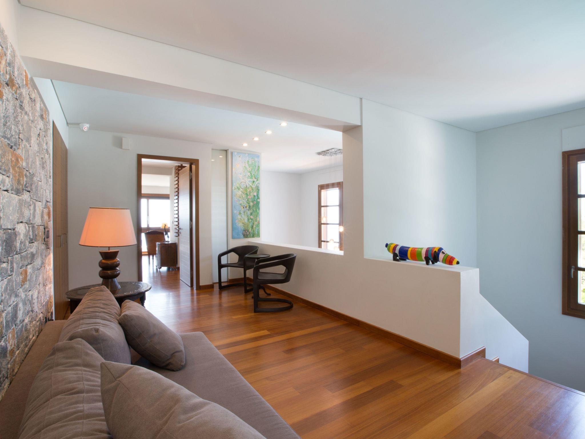 On the ground floor level there is a small, separate small studio consisting of a sleeping area with a queen size bed, an en-suite bathroom and a private living room with direct access to the swimming pool area. It can accommodate two more people if necessary with the use of a big convertible couch. Two separate living areas, the dining and the kitchen area are on this level too.