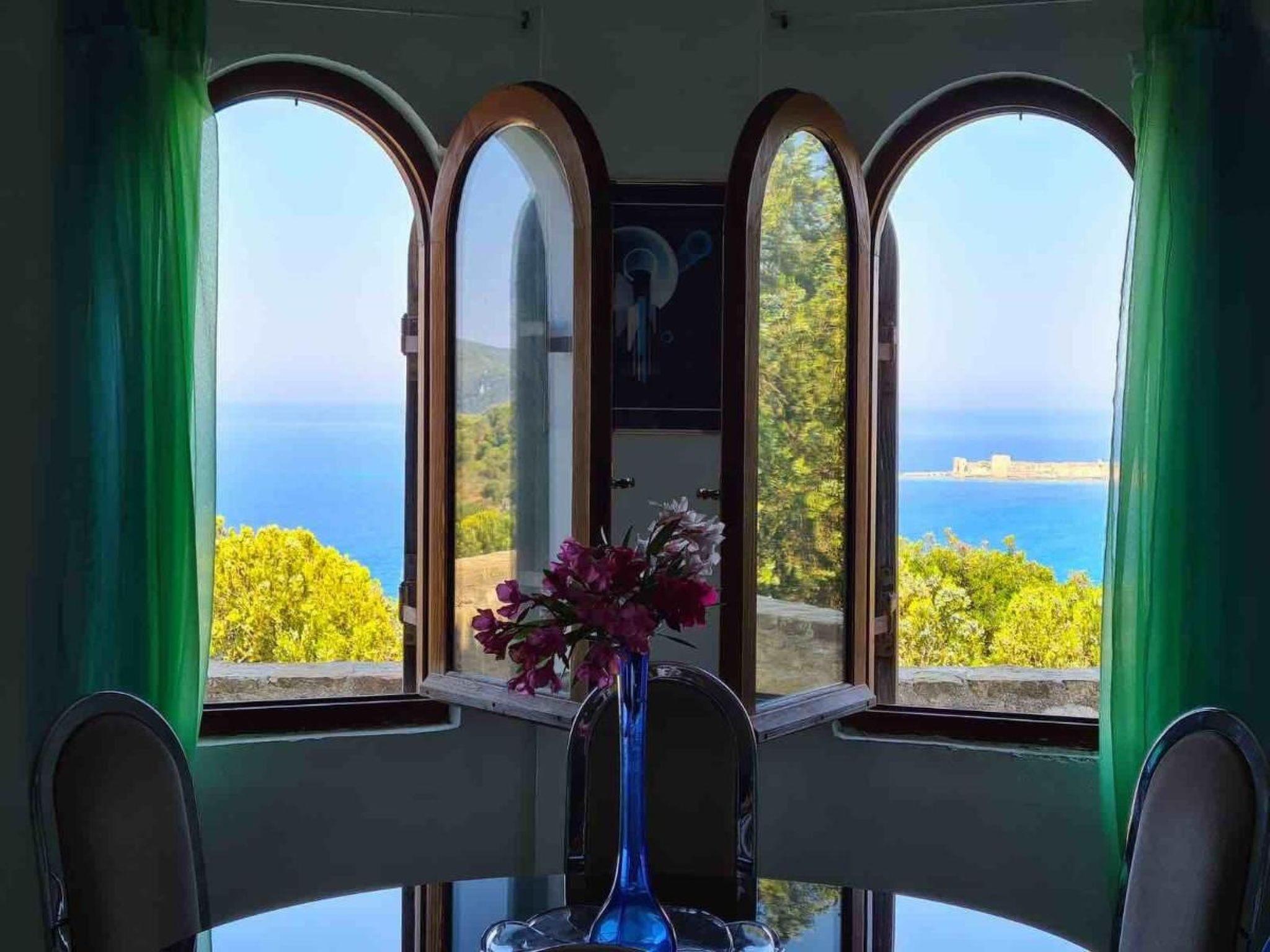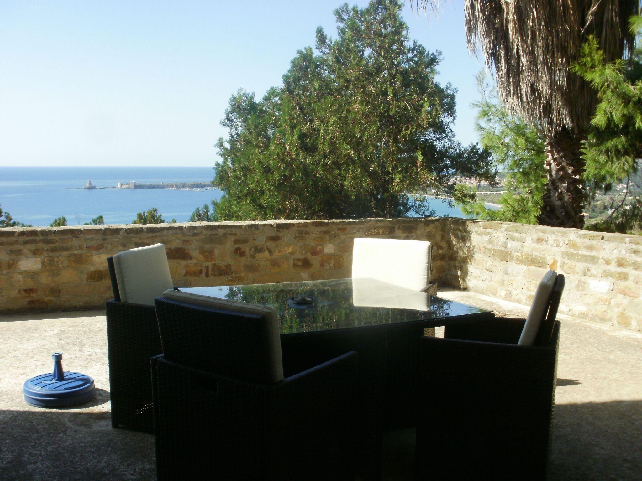 Villa convertible into 2 flats. Can be rented in its entirety for up to 13 holidaymakers. Panoramic view of the sea and citadel. Park-like garden. Ideally located, quiet, above-ground swimming pool, private pool bar for holidaymakers only, sun loungers, parasol, hammock. Large shady park with relaxation areas for personal reverie. Rooms tastefully decorated in the colours of the surrounding countryside, with sandy, pebbled and rocky beaches nearby. 3 golf courses within 15 minutes' drive, with superb views over the Bay of Navarino.