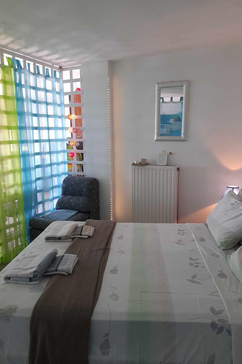 Open-plan kitchen with washing machine and dishwasher, living room with convertible sofa, dining room. The double bed is behind a beautifully decorated screen. In the bedroom with 2 single 115cm beds, a folding bed can be added if guests do not wish to use the convertible sofa for a possible 5th person. The bathroom is small but well designed with a walk-in shower. Fully air-conditioned. Bed linen and towels changed once every 7 nights. If you wish to stay more often, it is possible to rent