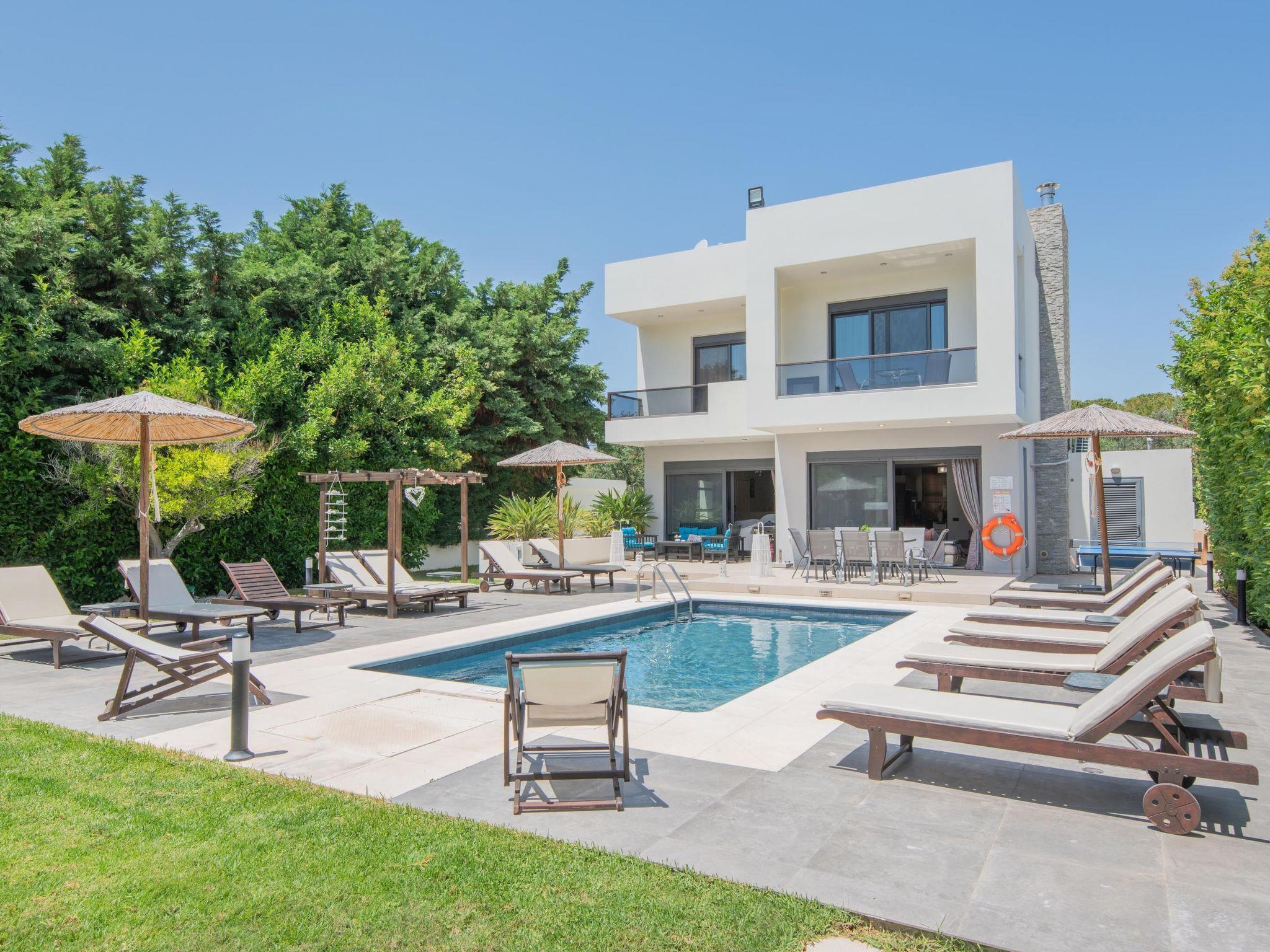 The villa’s interior offers comfortable and functional spaces with modern décor, creating a pleasant atmosphere, ideal to relax and enjoy your holidays. The villa offers 4 air-conditioned bedrooms, 3 double bedded rooms and one with twin beds. Two of the bedrooms include bathrooms. There are 3 bathrooms in total, one with a bathtub and 2 with a shower. There is a kitchen fully equipped for any meal preparation accompanied from the sitting area. Also, there is a comfy large living room with 2 separate sitting areas and a large flat screen TV with satellite channels and a game console. Outdoors, villa offers a private swimming pool with its sunbeds to relax in the hot summer days while working on your tan. There are also BBQ facilities where you can light up the fire and prepare a great meal for an evening gathering with family and friends.