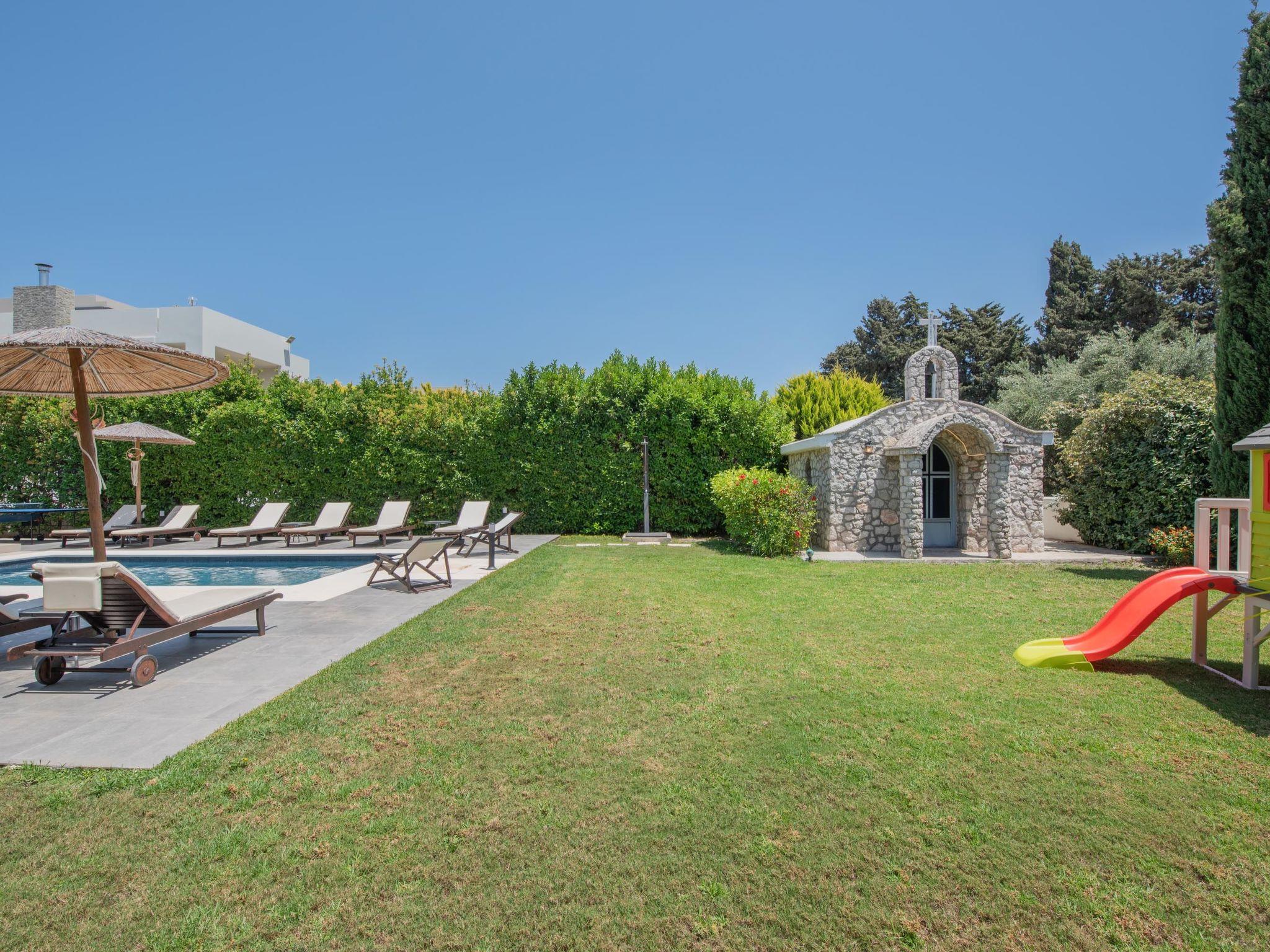 The villa is conveniently located within walking distance of a wide range of conveniences that you might need during your holidays in the area of Ialysos. Guests will find all the urban necessities such as supermarkets, restaurants, pharmacies and car rentals. Ialysos beach is found in a distance of only a 5 minute drive. The beach is great for anyone looking for beach related activities and at the same time an excellent place to enjoy an unforgettable, romantic sunset. Nature lovers and sight seekers will love Filerimos Mountain that is in close proximity of the villa and offers great hiking paths through the ancient forest to the top of the mountain, where you can visit the medieval monastery and enjoy the breath taking, panoramic view of the west side of the island and the Aegean sea. Airport of Rhodes is found less than 15 minute drive away from the villa. Also, you should consider visiting Lindos, which is found in a short distance of a 50 minute drive; Lindos Acropolis is the most exquisite archaeological site of Rhodes and has the dreamiest beaches. Also, visitors should explore the Old Town, a UNESCO World Heritage, in a distance of about a 20 minute drive away from the villa.