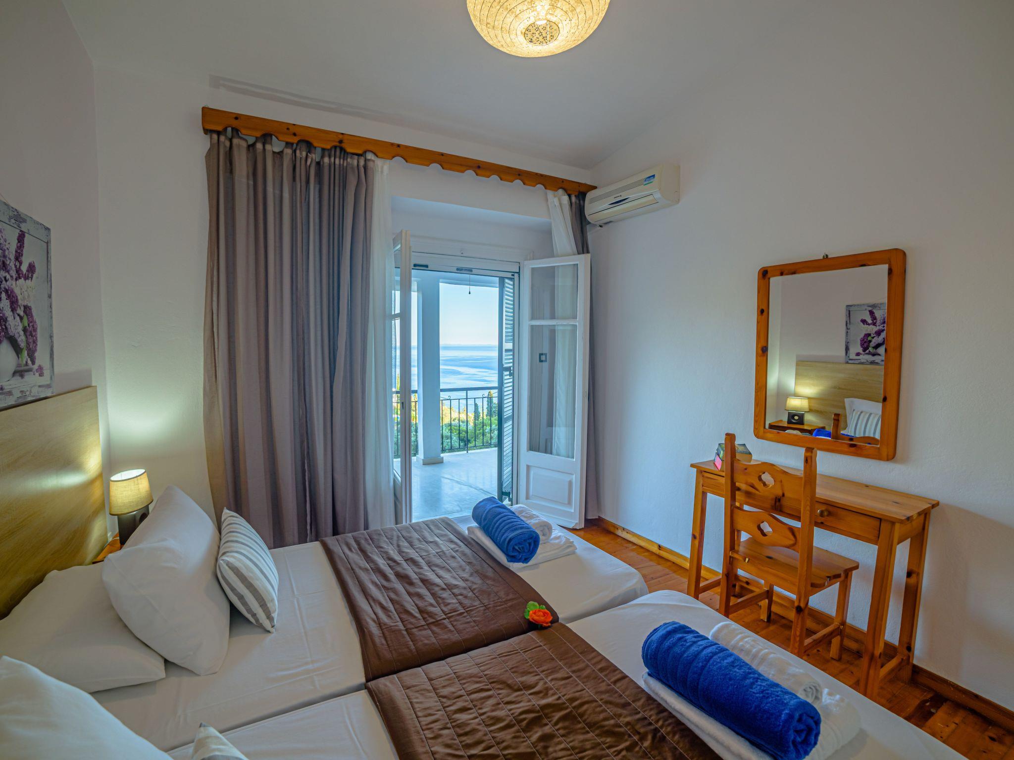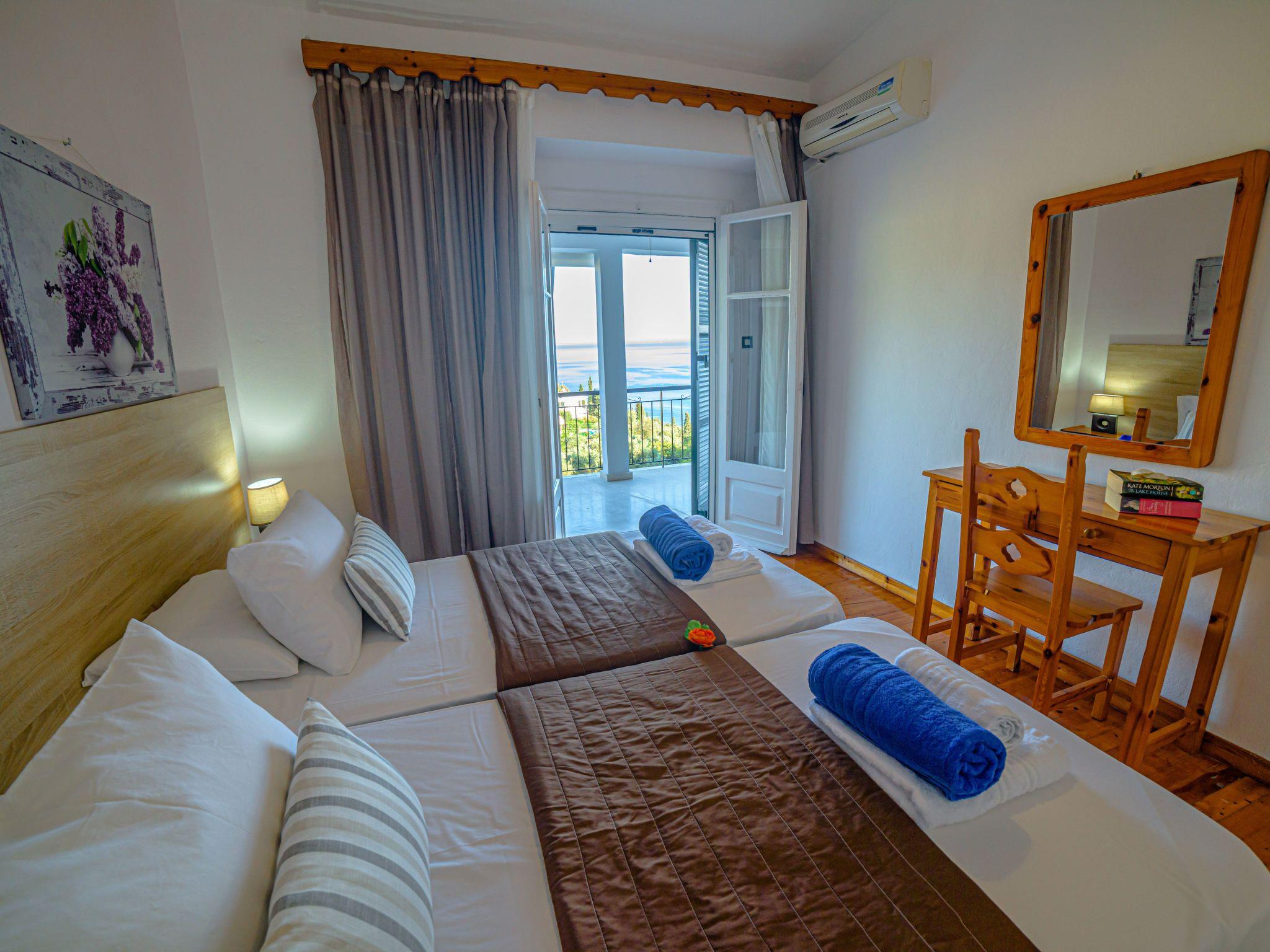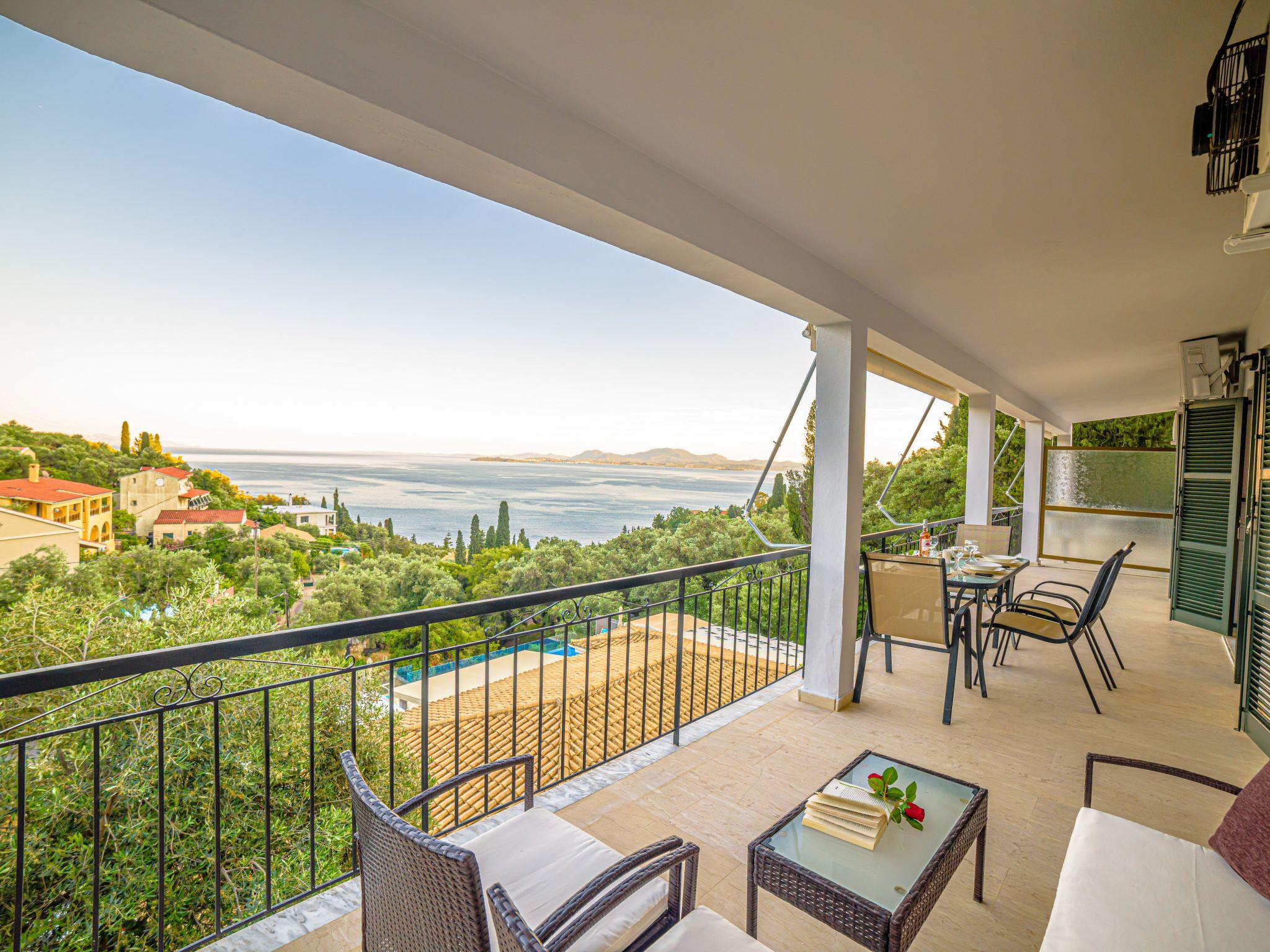 Combining a stunning wide view of the coastiline of Corfu Zeus 1 PRIVATE pool apartment (use only for one apartment) has 2 bedrooms, have been lovingly decorated - the master bedroom comes complete with double bed and en suite bathroom, whilst the remaining twin bedroom have use of its own bathroom with. Both bathrooms offer a hairdryer. Fully equiped kitchen,living room,2 bathrooms in perfect spot just 800 meters above Skinos Beach of Nissaki.