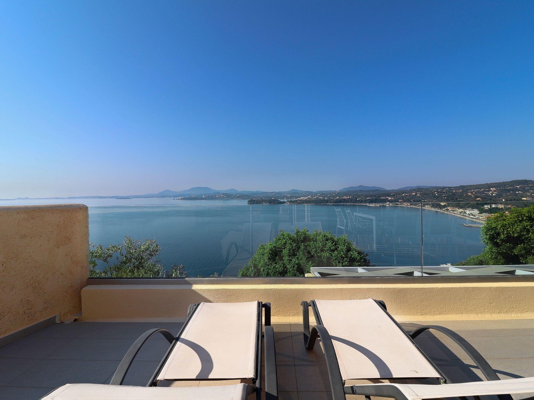 Villa Faiax in a peaceful location with uninterrupted sea views over the bay of Ipsos, two minutes’ walk to restaurant, cafe & bar (Grand Balcon & Off Town) and a 15 mins walk down to the Beach & Water Front Restaurants of Ipsos beach.Suitable for up to 10 people, ideal for large families and groups of visitors. Three storey building that consists of 4 bedrooms, all with ensuite bathrooms, large pool with panoramic sea view, fully equipped kitchen, smart TV, WIFI, AC. There is a spacious open-plan sunken lounge with comfortable sofas, huge wall-mounted TV and dining area all with French windows opening onto the very large patio areas with glass walls to enjoy the stunning views.On the second floor there is the spacious lounge with stylish modern furniture and atmosphere, Smart led TV, dining room and fully equipped modern kitchen. The large glass window offers plenty of light and coolness, while from the terrace of the lounge you can enjoy the magnificent sea view! The spiral staircase brings you to the top floor where there are three good size fully fitted bedrooms each with super comfortable beds ensuring a perfect night’s sleep (One King-size bedroom and two twin rooms with single beds which can be zipped together to form Super-Kings). Each bedroom has its own en-suite contemporary shower room, wall mounted flat screen TV, fitted wardrobes and safety deposit box.The large fully equipped kitchen is there for you to prepare your meals and breakfast. With microwave oven, Nespresso coffee maker, refrigerator, dishwasher, ceramic hob, oven, toaster and kettle.Going out, the pool dominates the area with its exhilarating tranquility. You may even want to spoil yourself with a traditional Greek meal using the B.B.Q. The large dining area there can accommodate barbecue or cocktail nights, enjoying the magnificent view. There is also outdoor showers and small fridges, serving the pool area. Finally, a spacious garage area offers shade up to two cars.The location allows for great privacy while being within walking distance of the beautiful beach of Ipsos. The strategic location of the villa gives you the opportunity to visit Corfu Town, the largest water park on the island as well as its most popular beaches within 20 min drive.