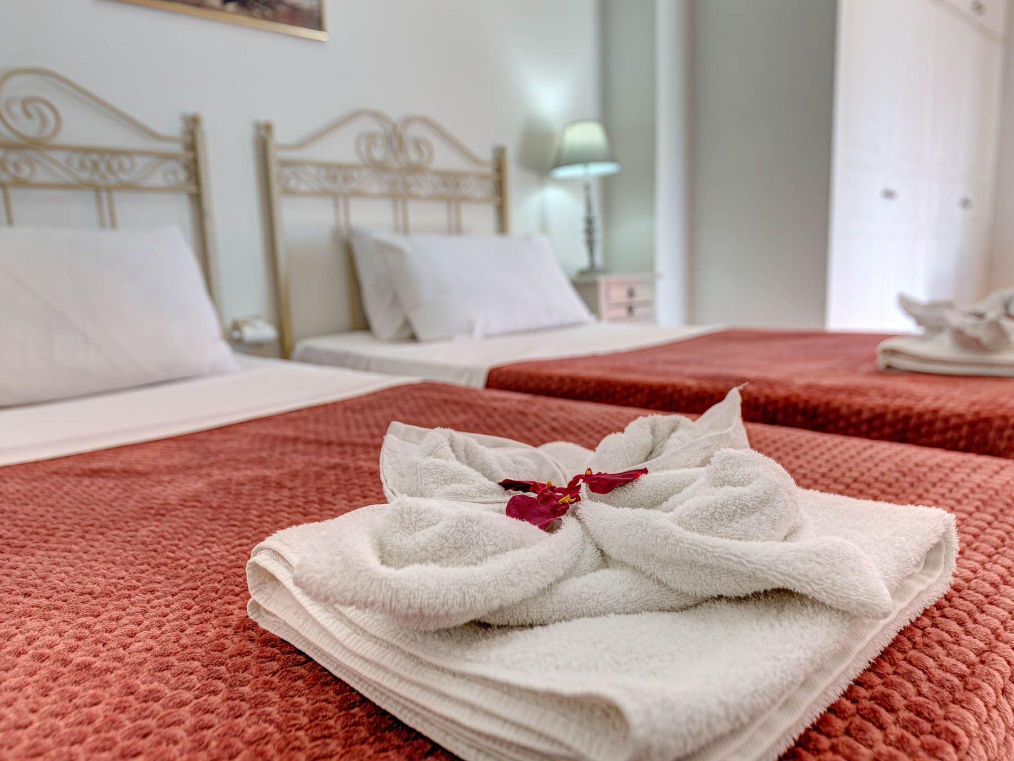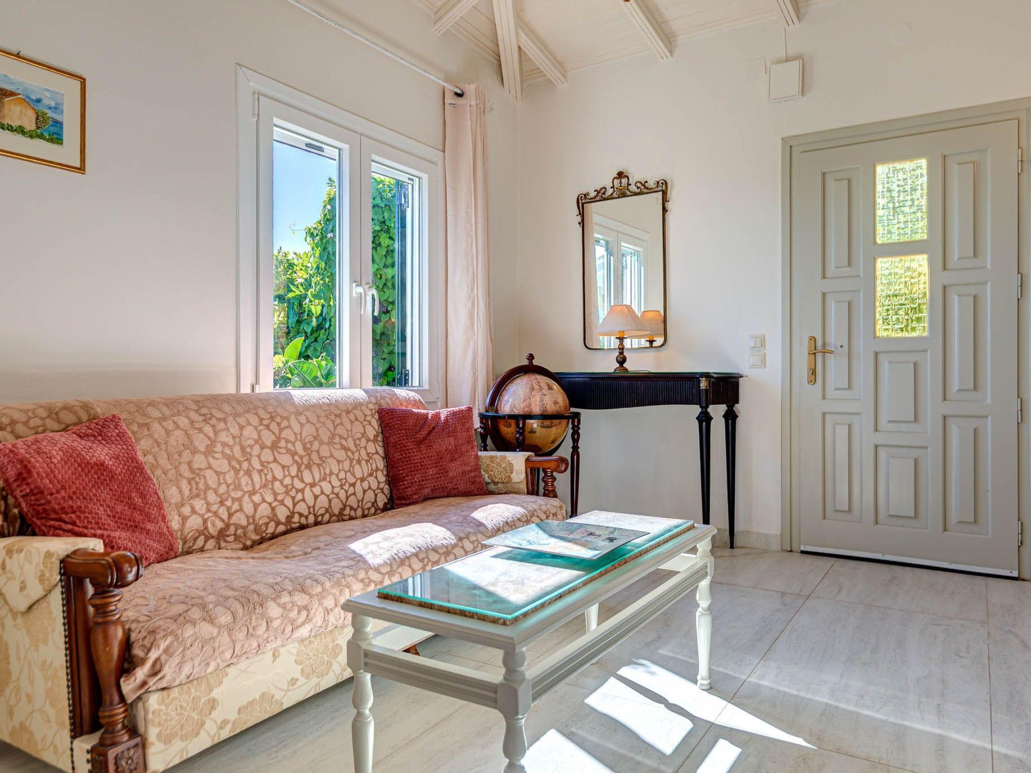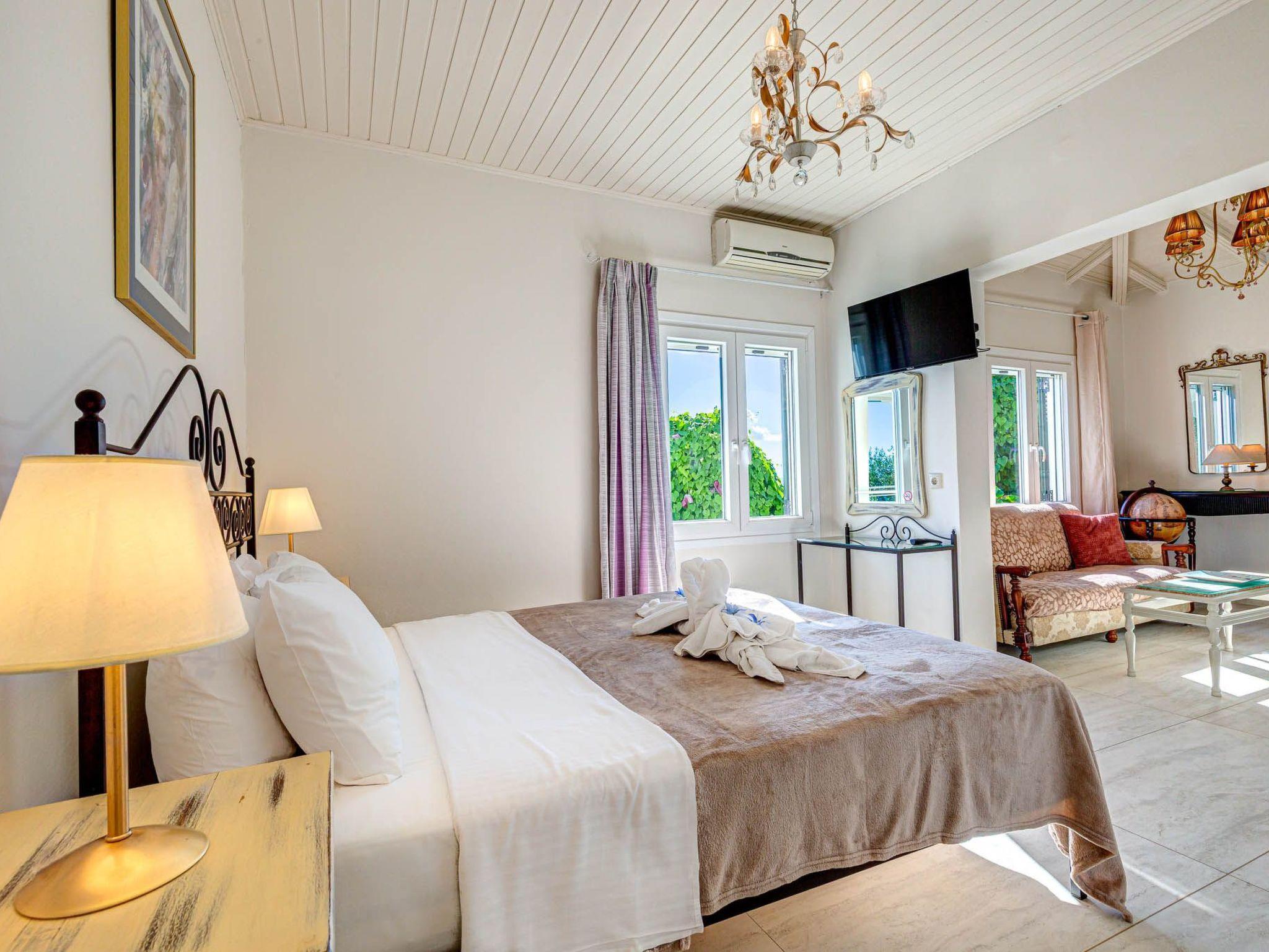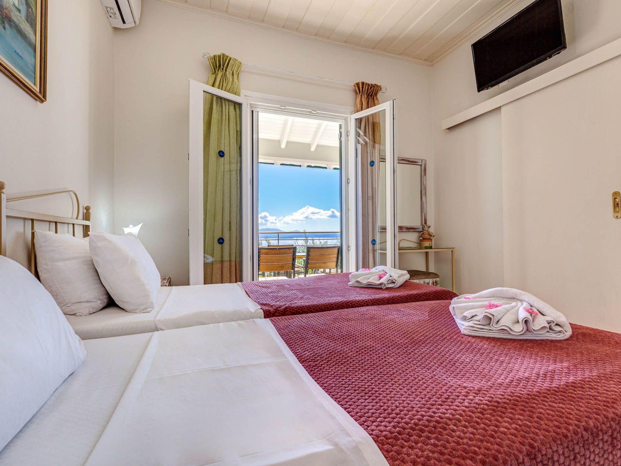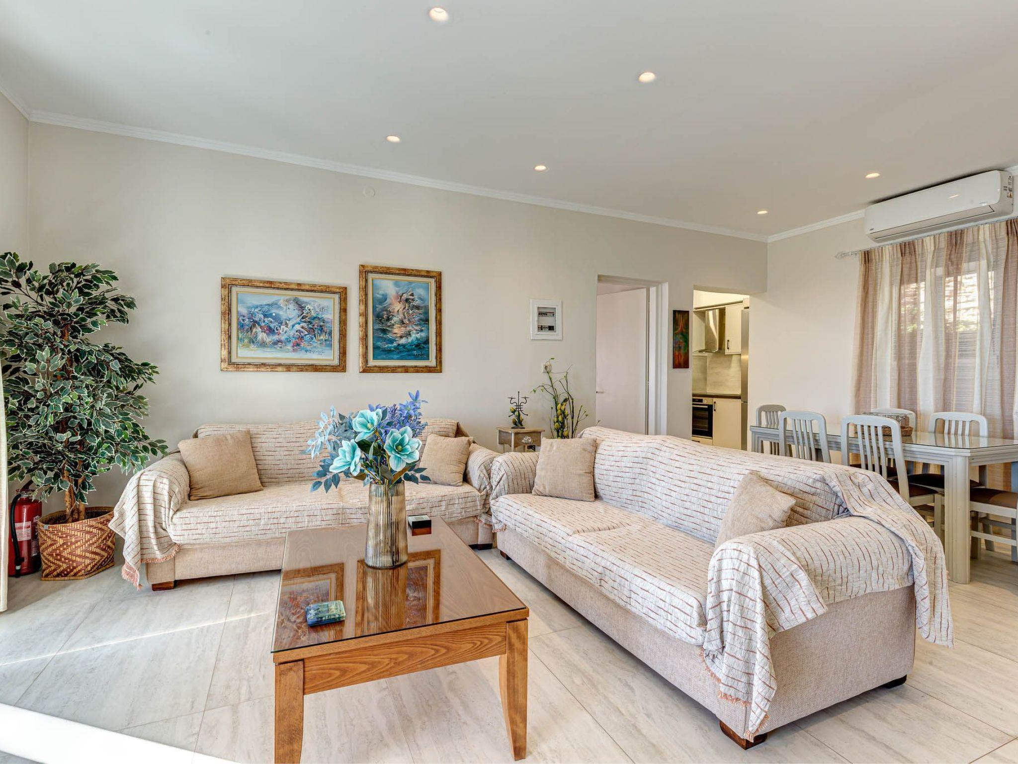 Villa Nafsika accommodates six guests across three thoughtfully arranged bedrooms. One bedroom features a double bed, while the other two have twin beds that can also be converted into double ones. One bedroom enjoys a private en suite bathroom, and the remaining two share a spacious, light-filled bathroom designed for comfort.