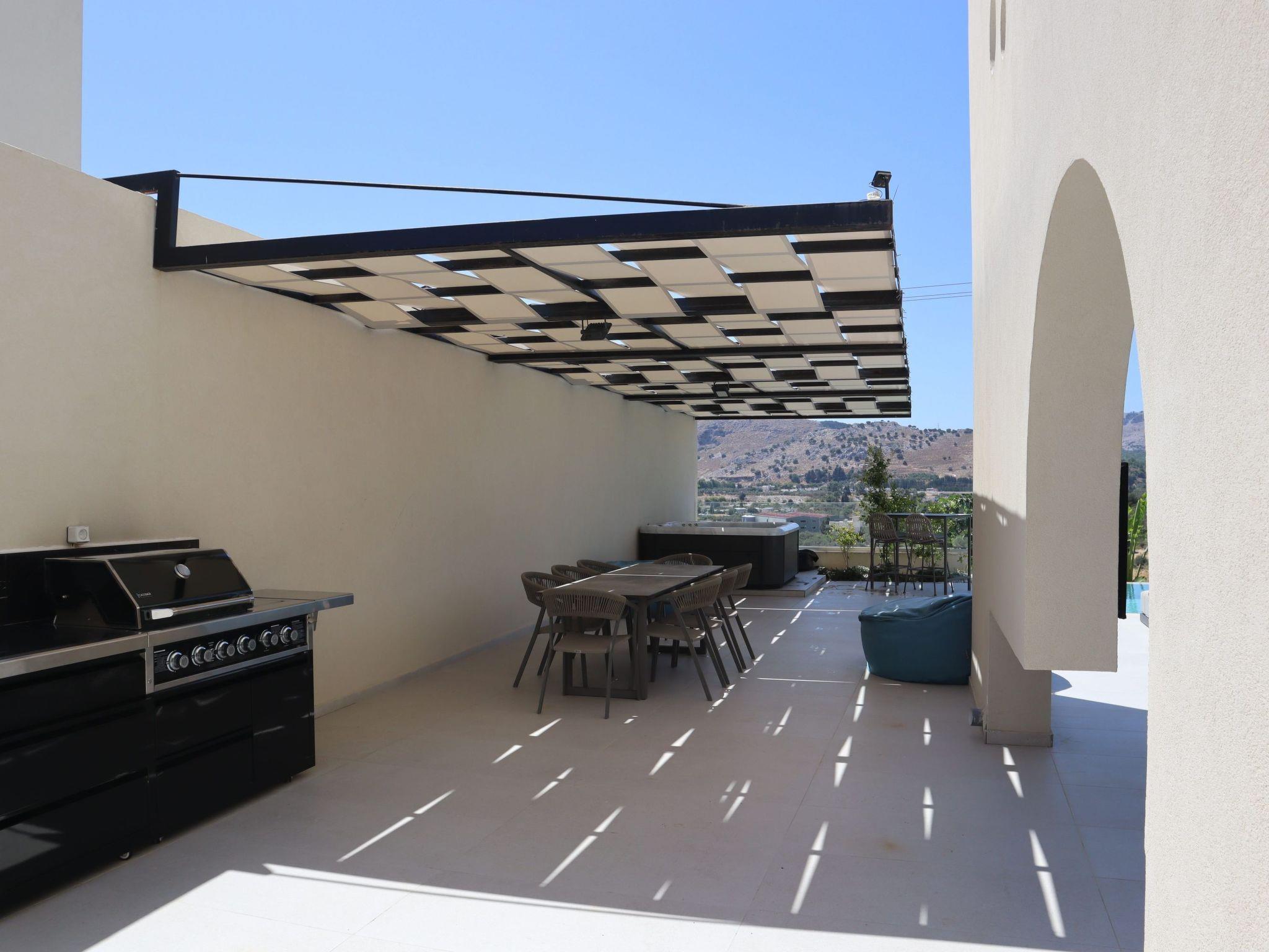 Welcome to the magic luxury living of Trapezia Villas. Trapezia Luxury Living boasts a stunning design that combines modern aesthetics with timeless elegance. Every detail is meticulously crafted to create a sophisticated and luxurious atmosphere. They offers expansive living spaces, including large living rooms, dining areas, and three fully equipped bedrooms with en-suite. The high ceilings and open floor plan enhance the sense of grandeur and provide ample room for relaxation and entertainment. All Trapezia villas are equipped with top-of-the-line amenities to ensure an unparalleled experience of luxury. From a fully-equipped outdoor gourmet kitchen to a private swimming pool and spa, every aspect of comfort and indulgence is taken care of. Trapezia Luxury Living is the epitome of opulence and sophistication, offering a truly exceptional living experience for those seeking the finest in accommodation.Type A villas are two floor luxury detached villas that hosts up to 6 guests.There are 3 fully air-conditioned bedrooms with unique decorations. All of the bedrooms offer ensuite bathrooms with a shower. There’s a fully equipped kitchen in warm colors, suitable for any meal preparation accompanied by the seating area and the living room. There’s a smart TV and free WIFI access throughout the property. Outdoors, there’s a private swimming pool and jacuzzi with sunbeds and a seating area where you can relax under the rays of the Aegean sun. The amazing outdoor kitchen with the dinning are promises memorable dinner’s under the Greek sky. You can spend your time by your private swimming pool or enjoy a fresh meal prepared in the BBQ installation. This amazing property and the beautiful location make the perfect match for a memorable stay and unforgettable holidays in Rhodes!