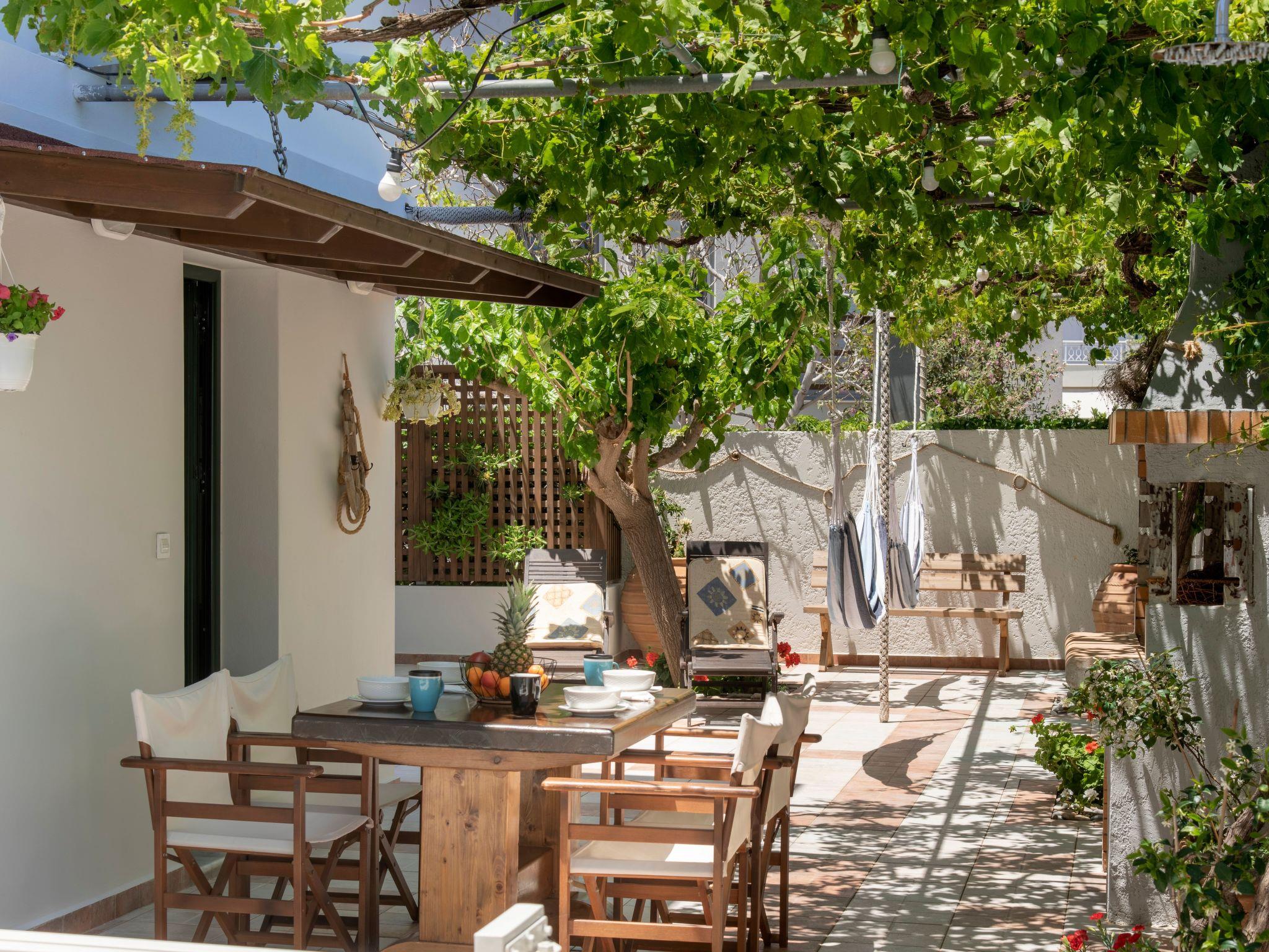 A recently (2020) renovated 2-bedroom with large patio underneath grape wine with hammocks, swing and lounges. Krevatina (=Vineyard) is one of 4 Paradisos villas, a gated area of relaxed serenity next to beach and village center. Paradisos villas are located in Koutsourás, a quiet, agricultural village in South-Eastern Crete. It is less than 2 km west of the tourist town of Makry Gialos, 23 km east of Ierapetra, and 33 km from Sitia. Located only a few minutes’ walk from a local pebble beach, bakery, and coffee shops, patisserie, super markets, bars, restaurants, and pharmacy, the villas combine romantic seclusion with proximity to modern comforts.