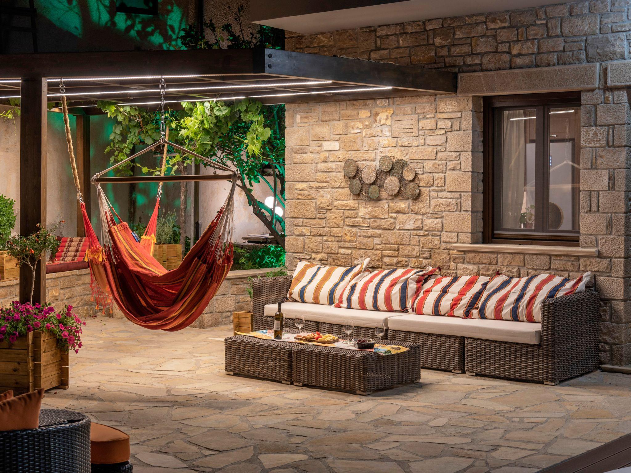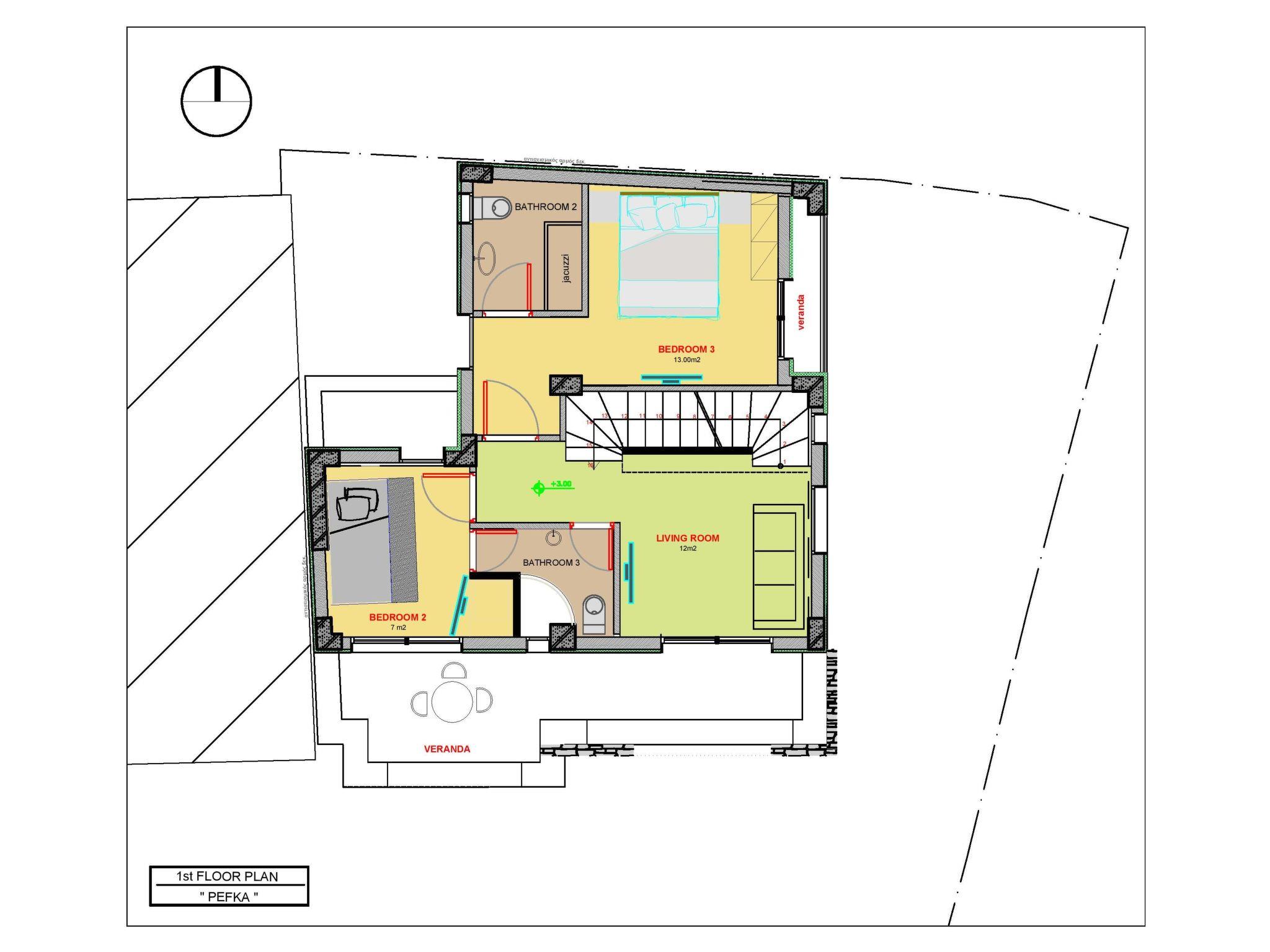 Pefka (pine tree) is newly-constructed and modern. It is situated next to 2 tall pecan trees and across 2 huge pine trees that provide ample shadow during the hot summer days. It features 2 master bedrooms with en suite bathrooms situated in the quiet part of the villa facing the gardens away from the pool, a pool-facing third bedroom with en suite bathroom, a fully walled, private loft with double bed and en suite bathroom, as well as two living rooms with chair and sofa beds able to sleep more. First and second floors have sea views.