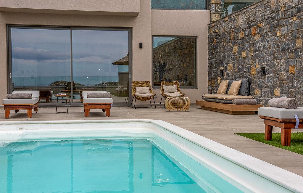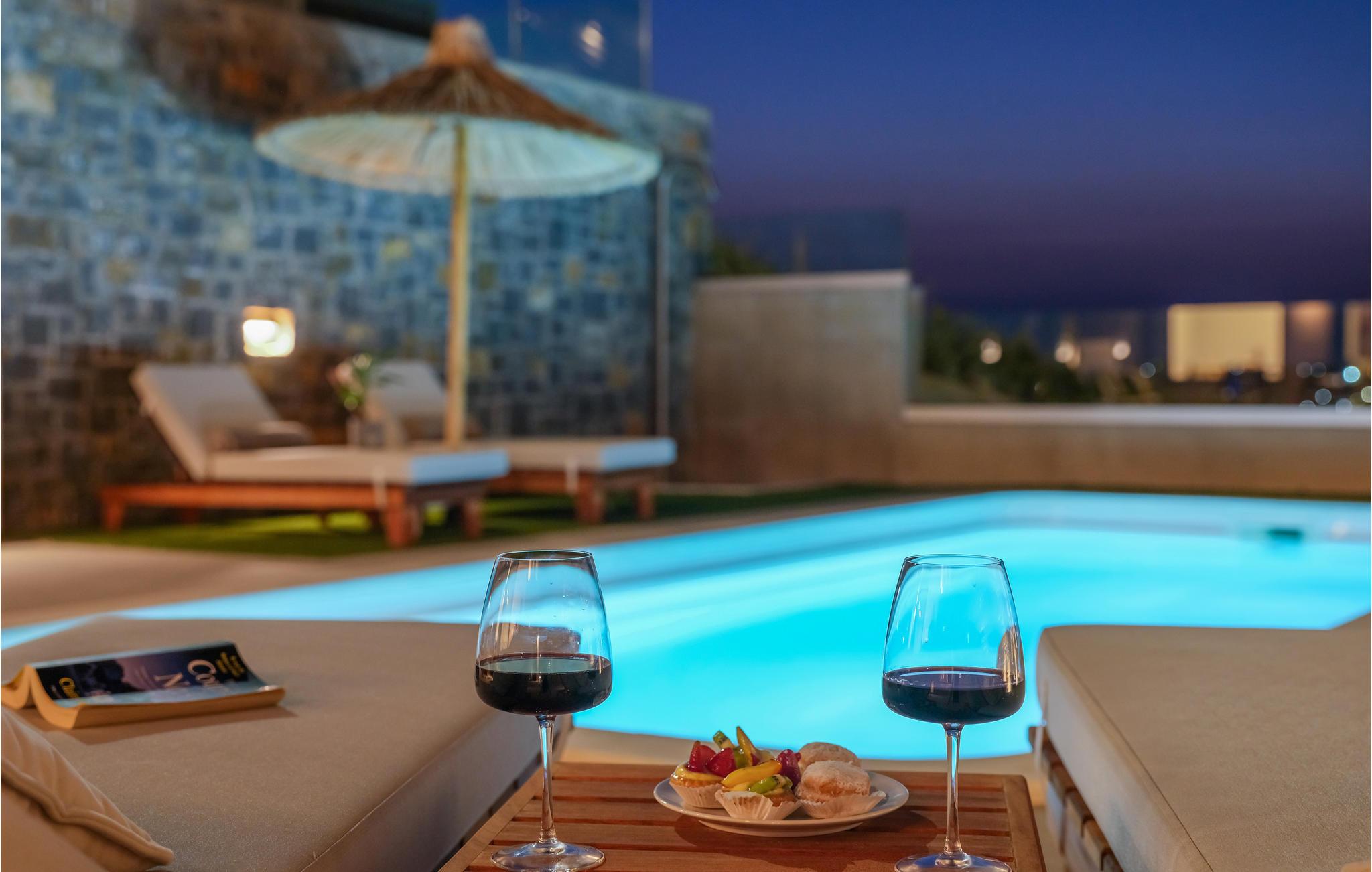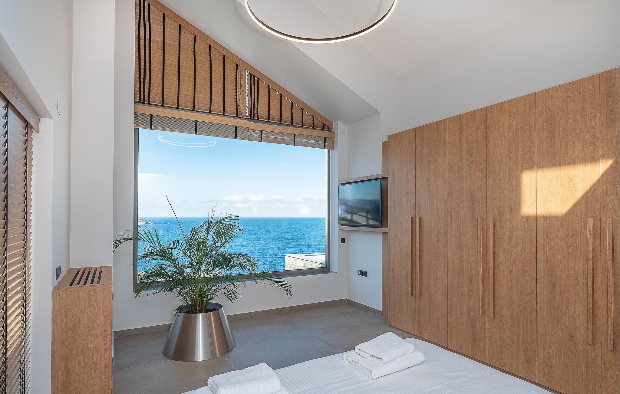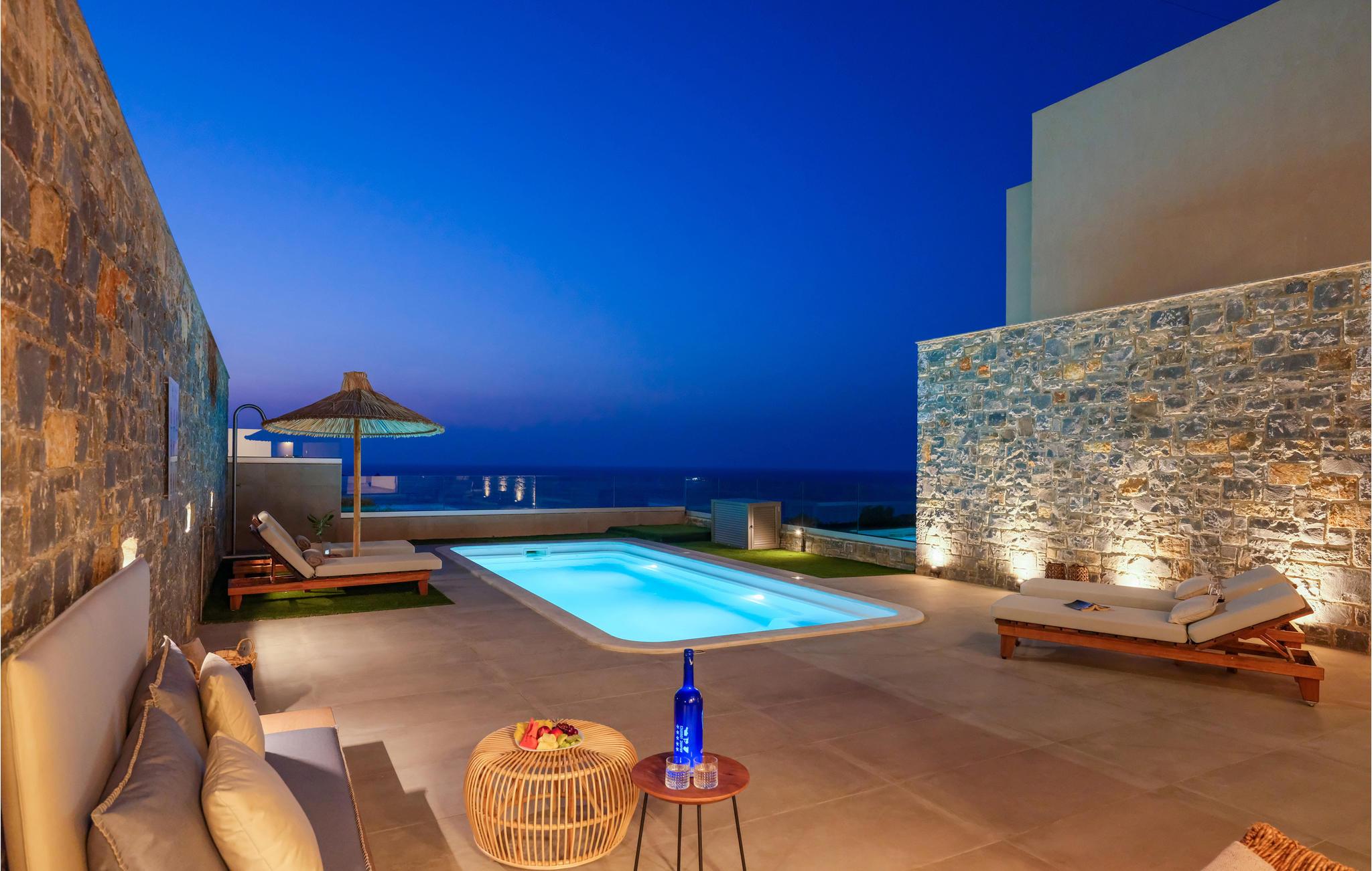 Tilbring en uforglemmelig tid i dette eksklusive huset, der du kan nyte en unik utsikt over Kretahavet både inne og ute. Huset er bygget av naturlige materialer som tre og stein. Her kan du slappe av i en stilfull atmosfære, og sofagruppen i stuen innbyr til å sitte komfortabelt sammen lenge etter en herlig dag på stranden eller på oppdagelsesferd på øya.