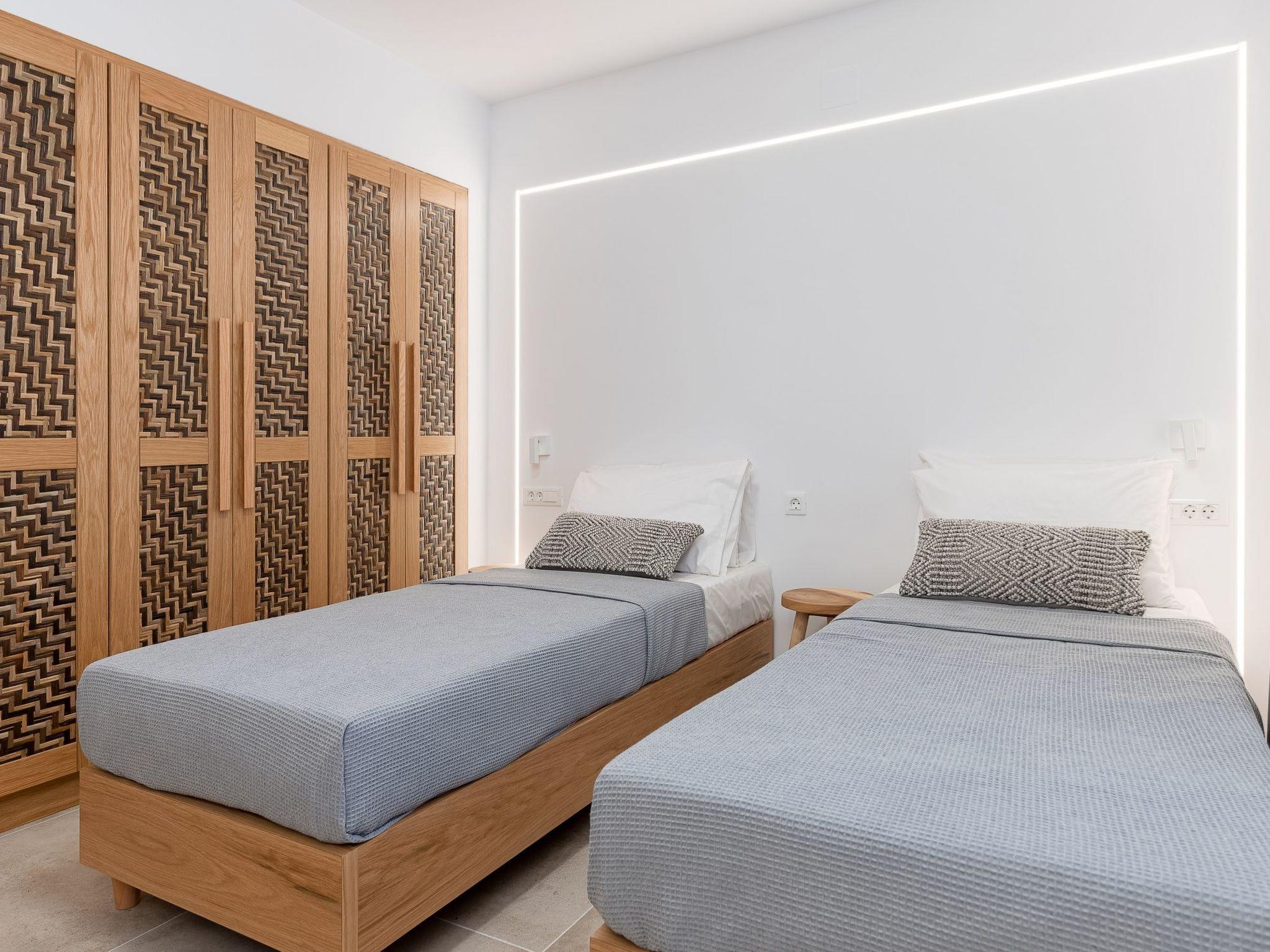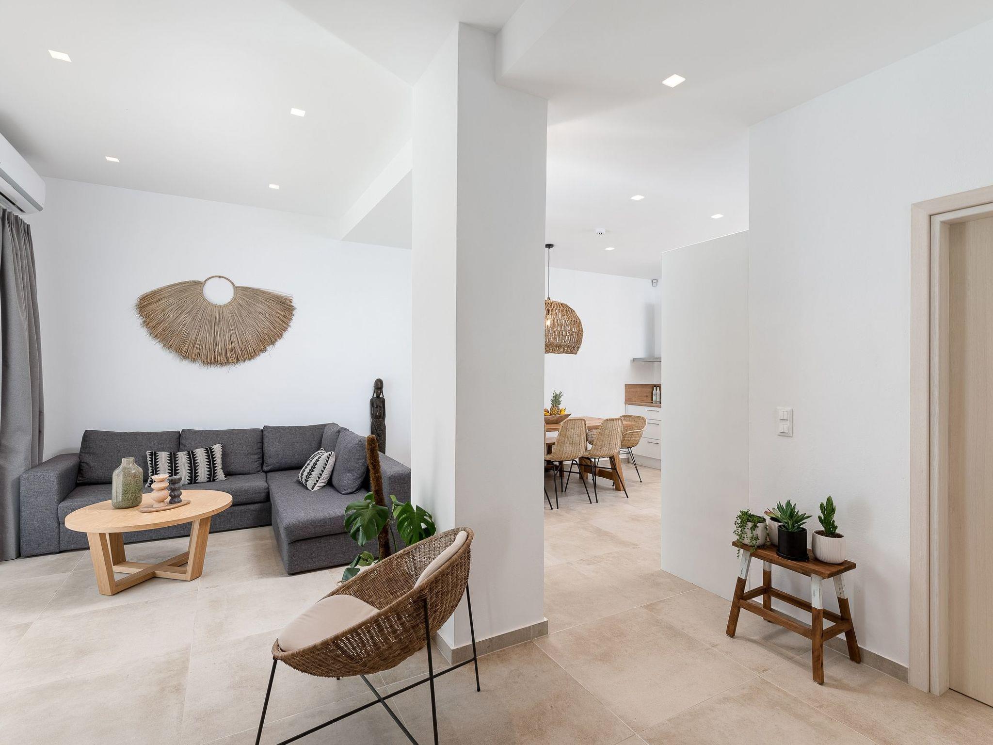 Modern boho style villa with pool for up to 8 people! VILLA Calma 2021! 4 bedrooms, 3 bathrooms, garden with fruit trees, parking for 3 rental cars, on the outskirts of Kamilari in a quiet location with sea views!Fully and comfortably equipped with all the amenities of a holiday villa: SAT-TV, free W-LAN, oven, grill, BBQ, microwave, hairdryer, dishwasher, washing machine - dryer, bed linen, hand-shower-pool towels, bathroom cosmetics, heating, air conditioning, mosquito screen, max. occupancy: 8 persons: 8 personsLiving area with couch, kitchen fully equipped for 8 personsBeds: 4 bedrooms, comfort 2 - layer CocoMat mattresses,Bathroom: 3 bathrooms, shower, WC, washbasin4 SAT-SMART-TV, large swimming pool with sun loungers, suitable for 8 persons, open complete kitchen with dining room and adjoining cosy living room, SAT-Smart-TV. Spiral staircase, 4 bedrooms, 2 en suite shower rooms, 1 shower room on the ground floor, (layout of the bedrooms: 2 bedrooms on the ground floor, separate shower room, laundry room, 2 spacious bedrooms with en suite shower room on the first floor, 1 balcony, 1 terrace, 1 children's play area, sea view of the bay of Messara, view over the village, Psiloritis mountains, large garden, barbecue/fireplace Outdoor living area new in Kamilari, a neighbouring village of Pitsidia and Kalamaki.On the edge of the village in a very quiet side street, 3 private parking spaces, steps to the house not suitable for the disabled, sheltered from view, in a quiet location, large vegetable garden, natural stone border.