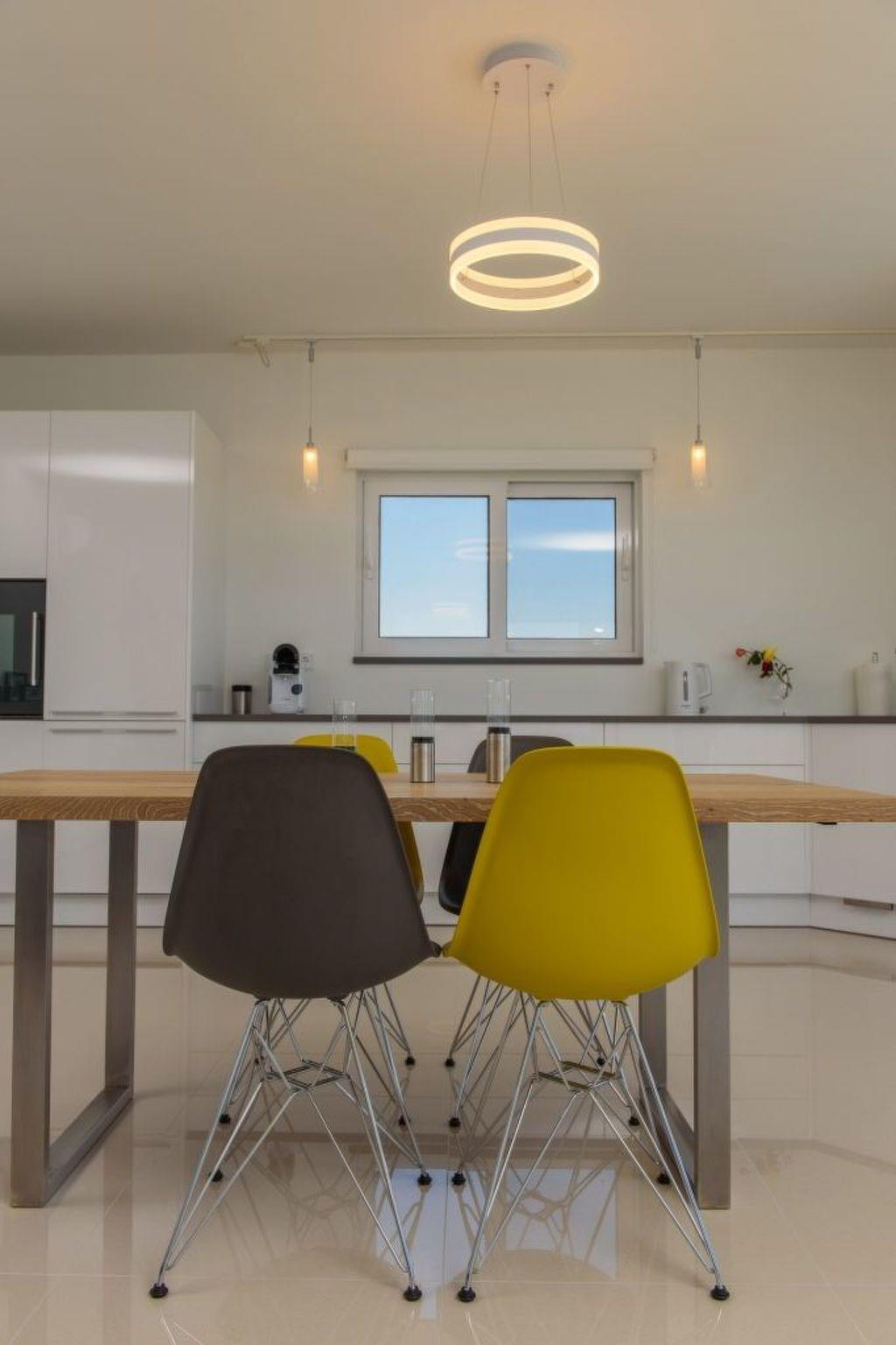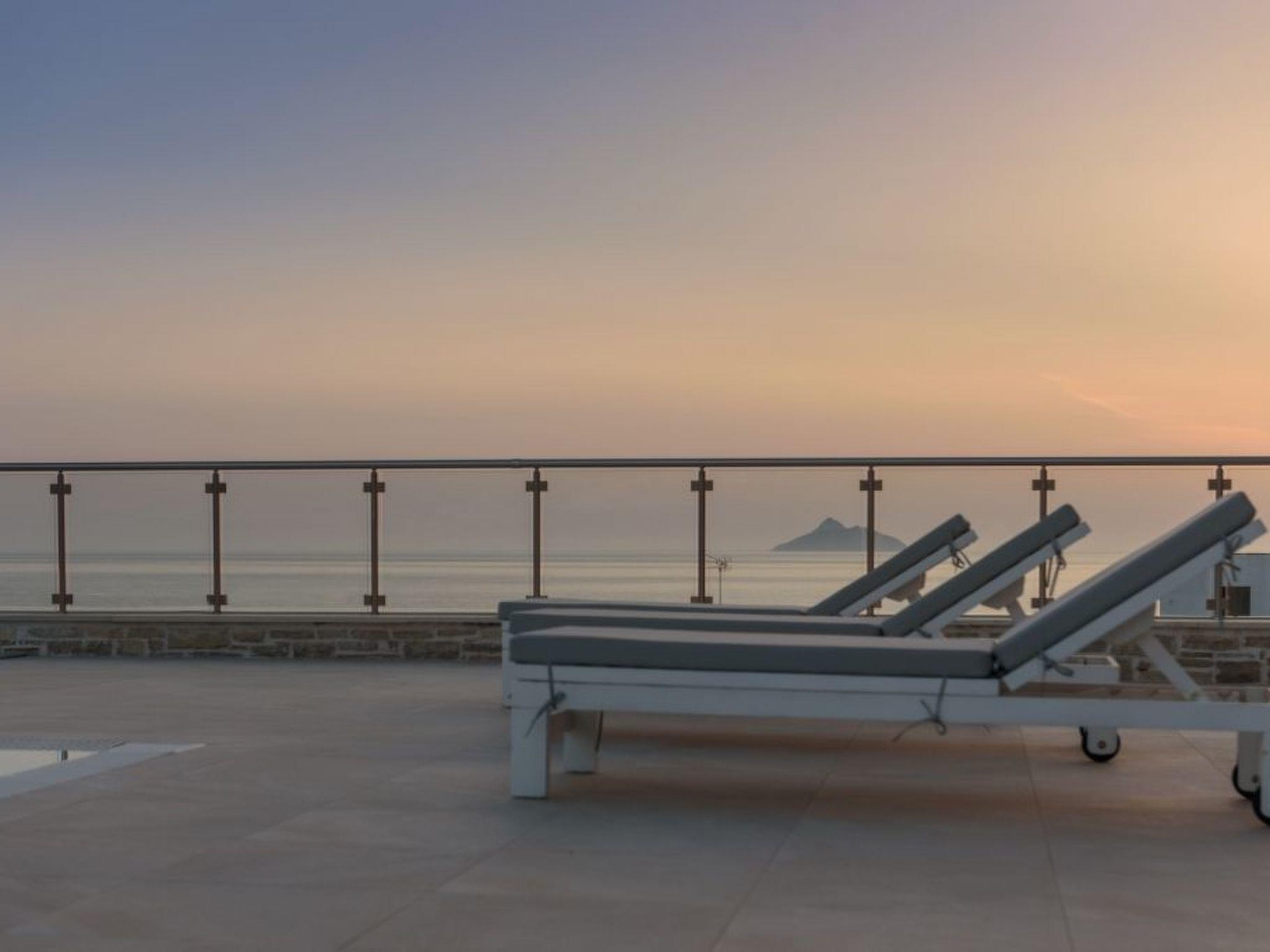 Villa Delfini 3 is a spacious luxury villa on a plot of 1,500 m² with many exclusive details. The villa is equipped with the latest "Smart Home Electronic" and W-LAN. Kitchenette, fridge with freezer compartment, hob and oven, kettle, toaster, crockery and utensils you need for 4 people. The living room has a spacious sofa landscape, underfloor heating, coffee table, satellite TV, round off the overall picture not only visually tasteful but let you enjoy the view over the sea cosy and harmonious. A spiral staircase takes you to the lower living area. The exclusive bedrooms are individually furnished with a 1.60 m x 2.00 m double bed, wardrobe, bedside cabinets, desk and air conditioning. The bathroom has a walk-in shower, WC, bidet, double washbasin, hairdryer and plenty of hand and shower towels. Pitsos washing machine and tumble dryer can be found under the staircase. From the bedrooms you have direct access to the sun deck with sun loungers, one of the many relaxation areas the house has to offer.