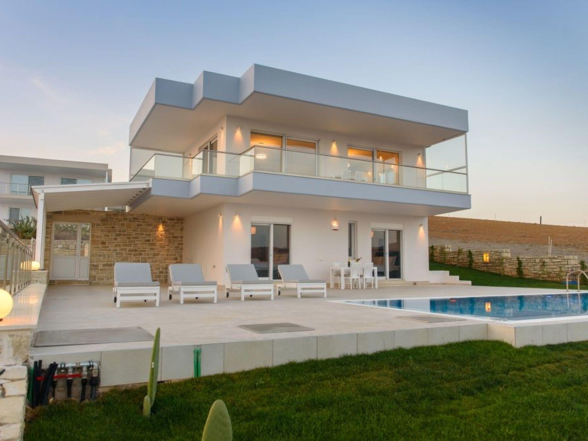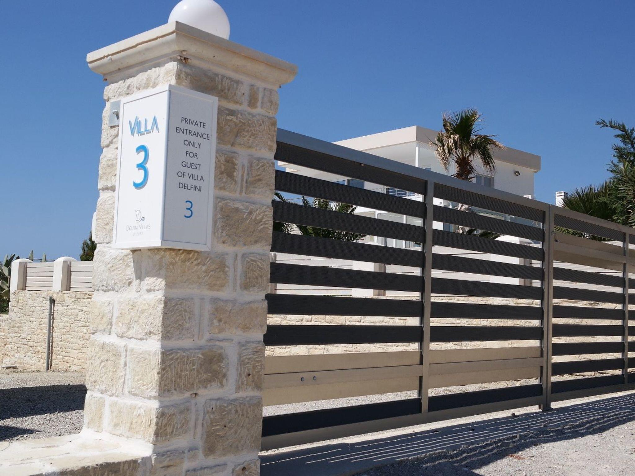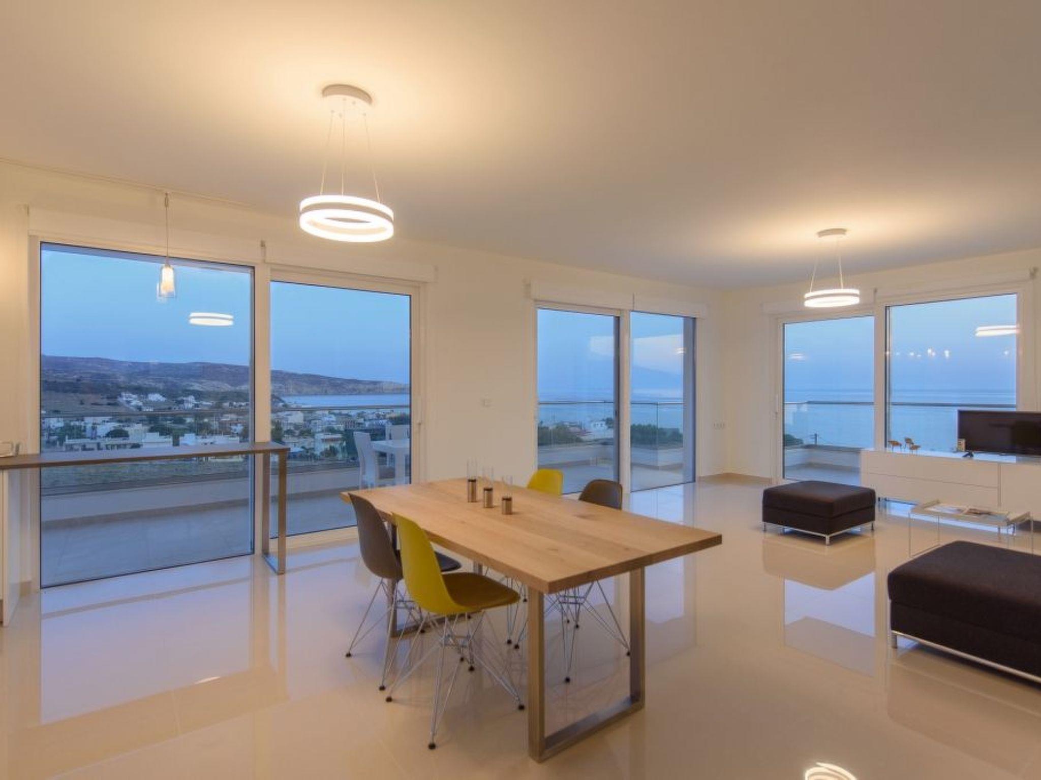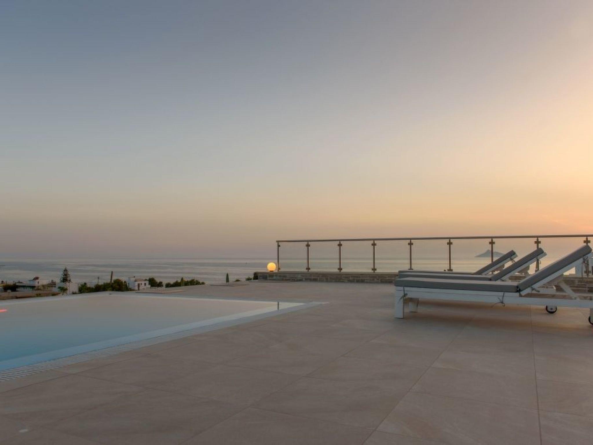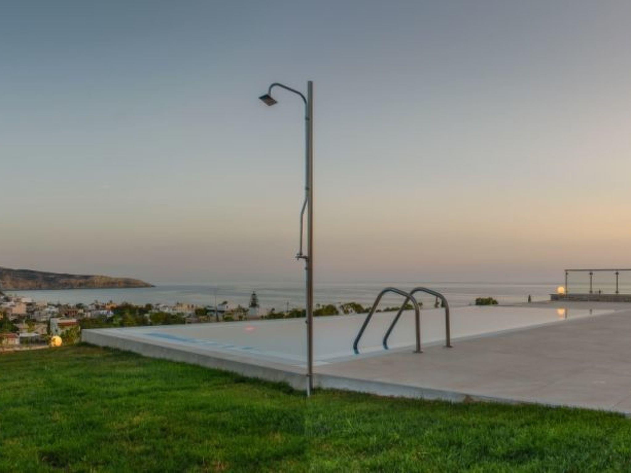 Luxurious, sea view, central heating, saltwater pool, up to 4 persons Kalamaki south coast Heraklion Crete, close to the beach, only 100 metres from the sea, surrounded by trees, bushes and a natural stone wall. The house and the garden area are private and can be completely closed off by an electric gate. Villa Delfini 3 is tastefully and uniquely furnished and equipped. The villa will make your stay pleasant and unforgettable. A small staircase at the entrance area leads to the upper open-plan living area, which gives you a breathtakingly beautiful view of the interior as well as the landscape and the sea.