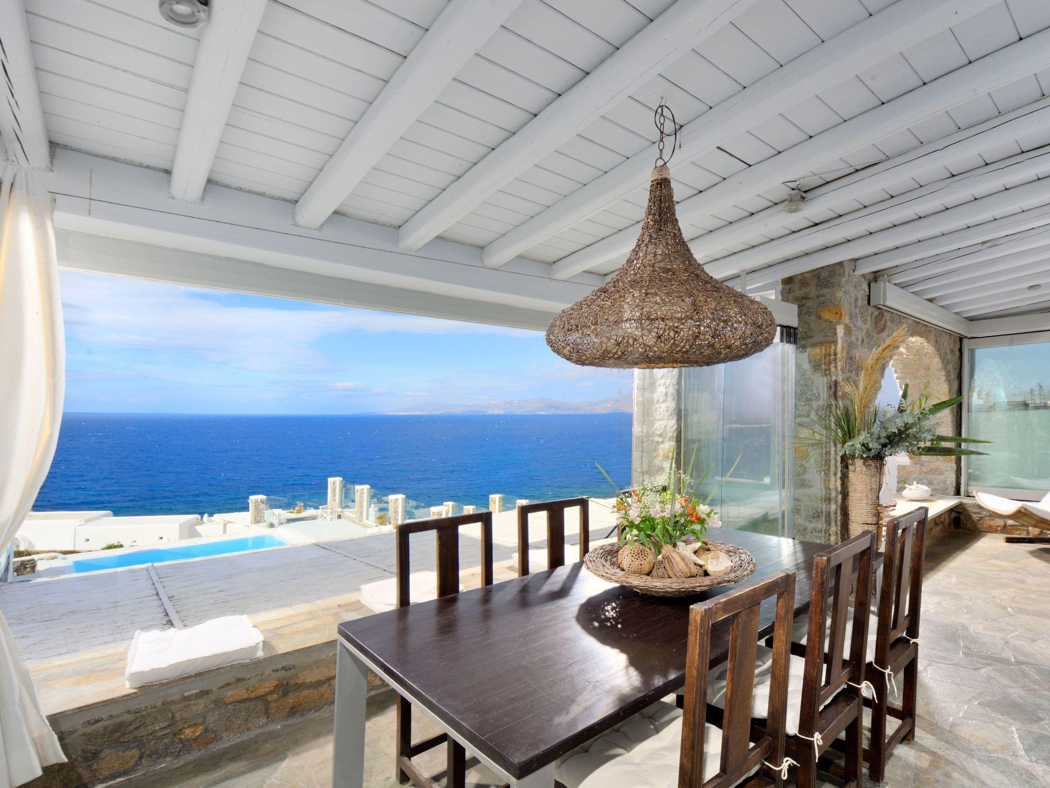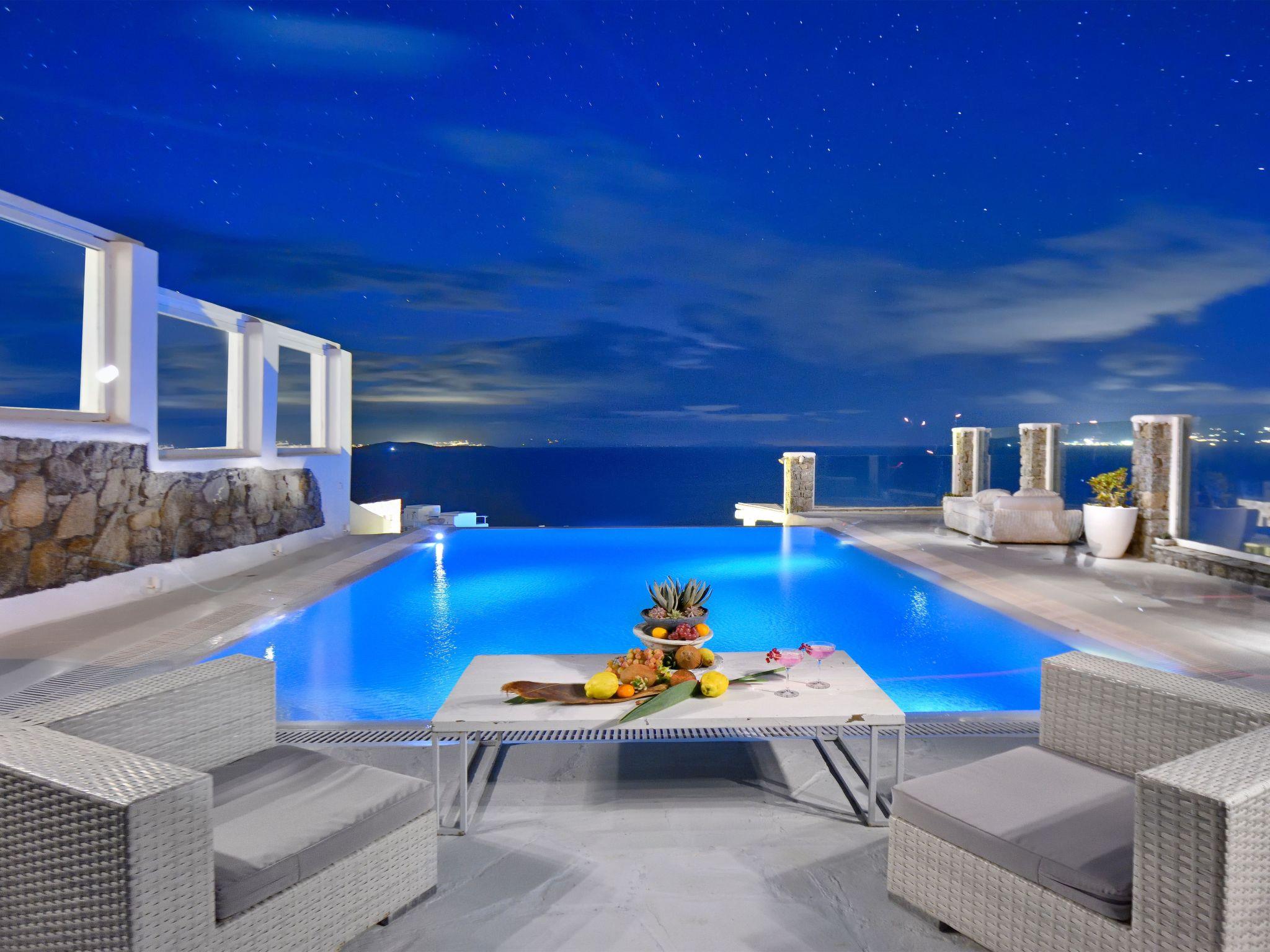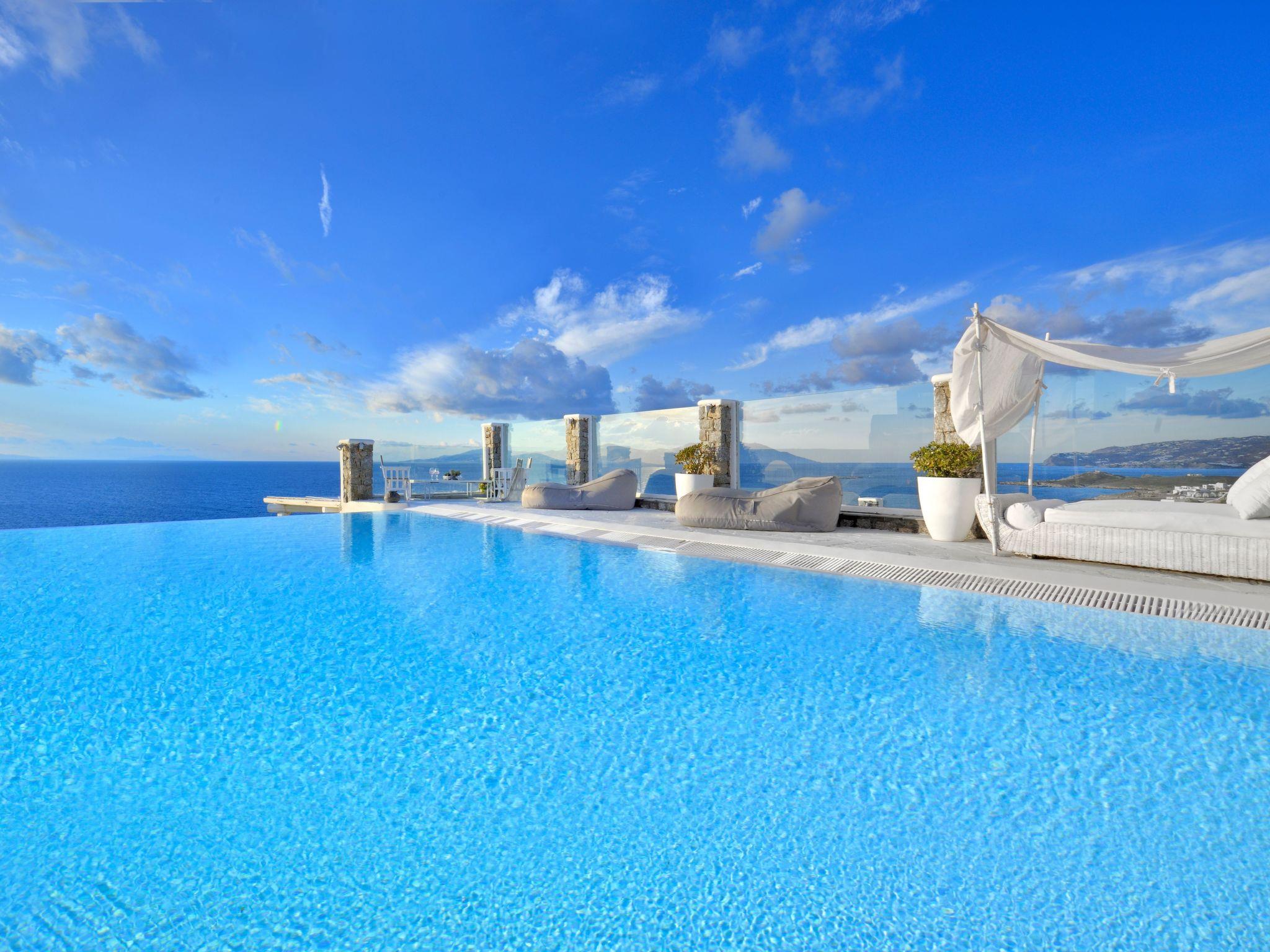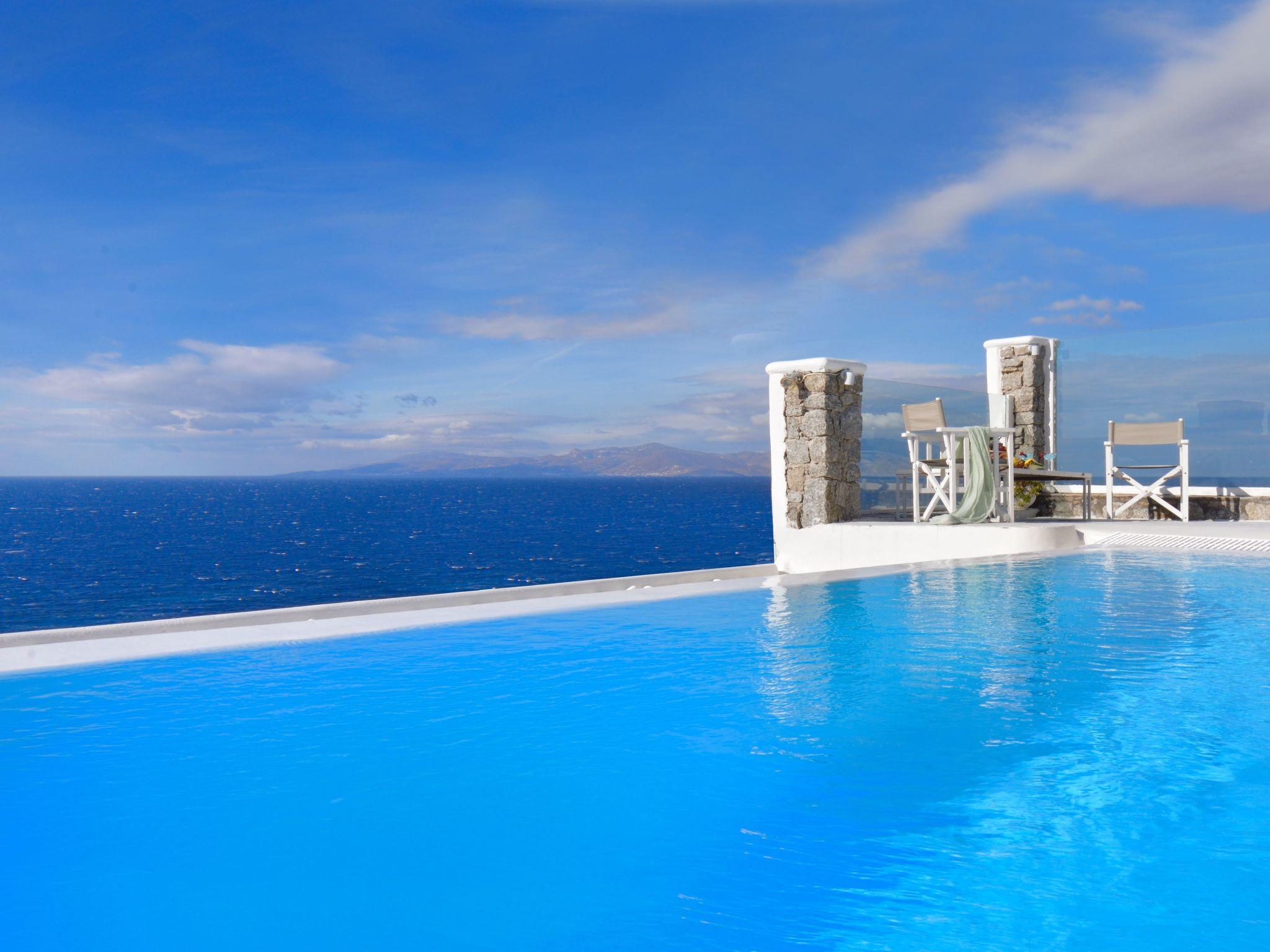 The property is located in one of the most distinct areas of the island with uninterrupted views of the Aegean Sea and the Cycladic Islands of Delos, Syros, Tinos with 180 degrees views having a large infinity edged swimming pool.