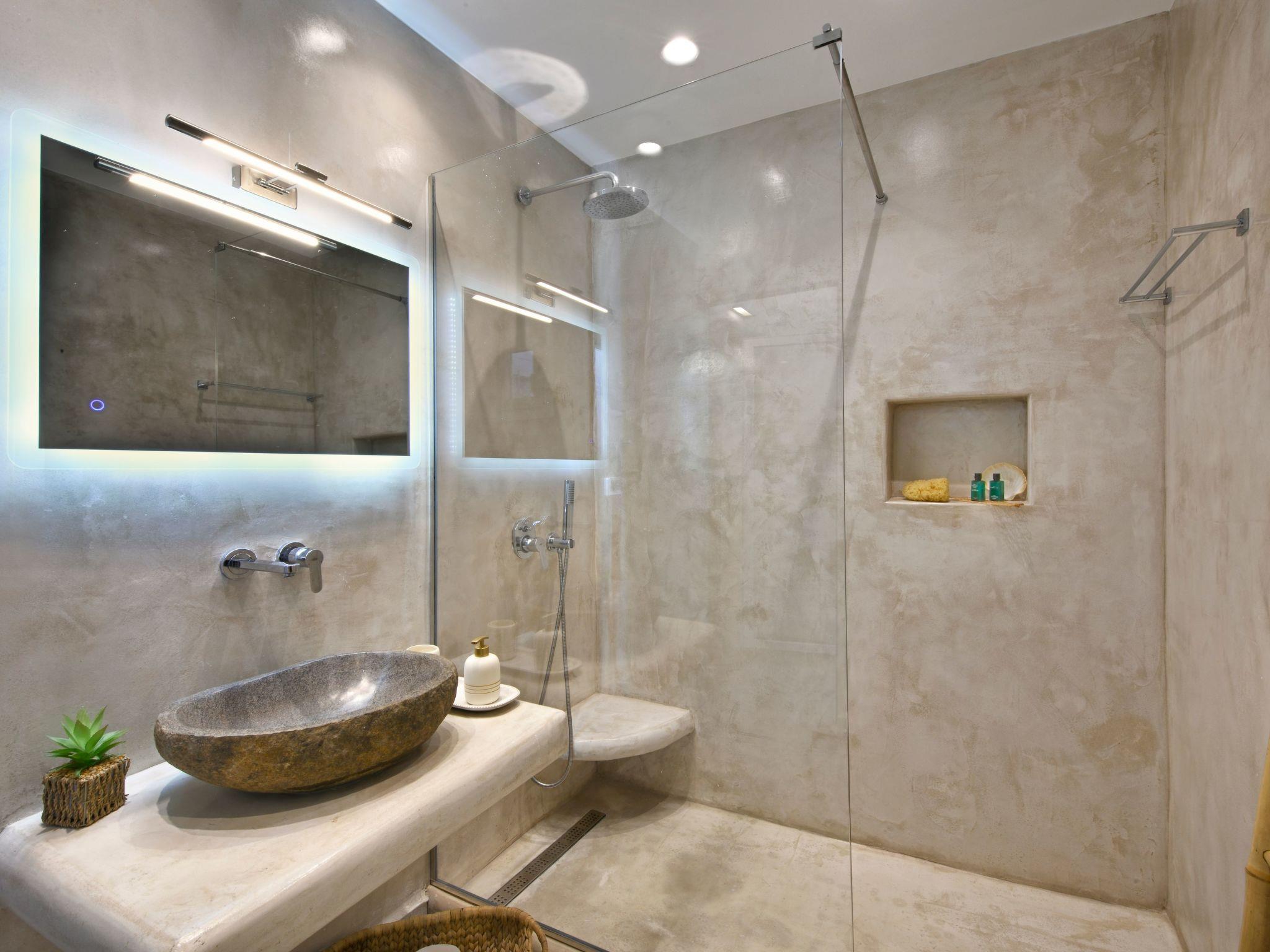 The outdoor area offers a 180° all-round view and several furnished terraces, an infinity pool with comfortable sunbeds and a roofed dining space, a big stone dining table for 20 people, and two big sitting areas. In front of the house there is a little garden with a grill and a sofa, offering an exceptional sea view. This is also where the parking space is.