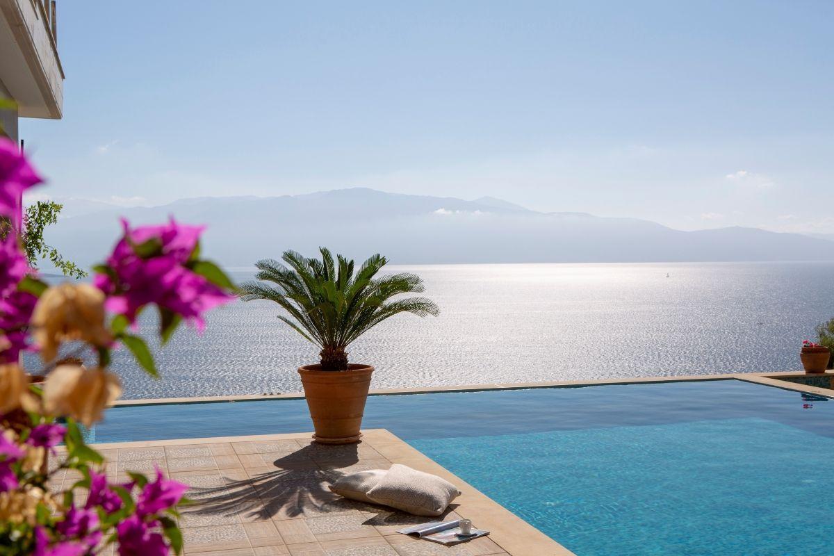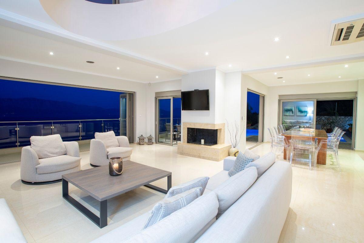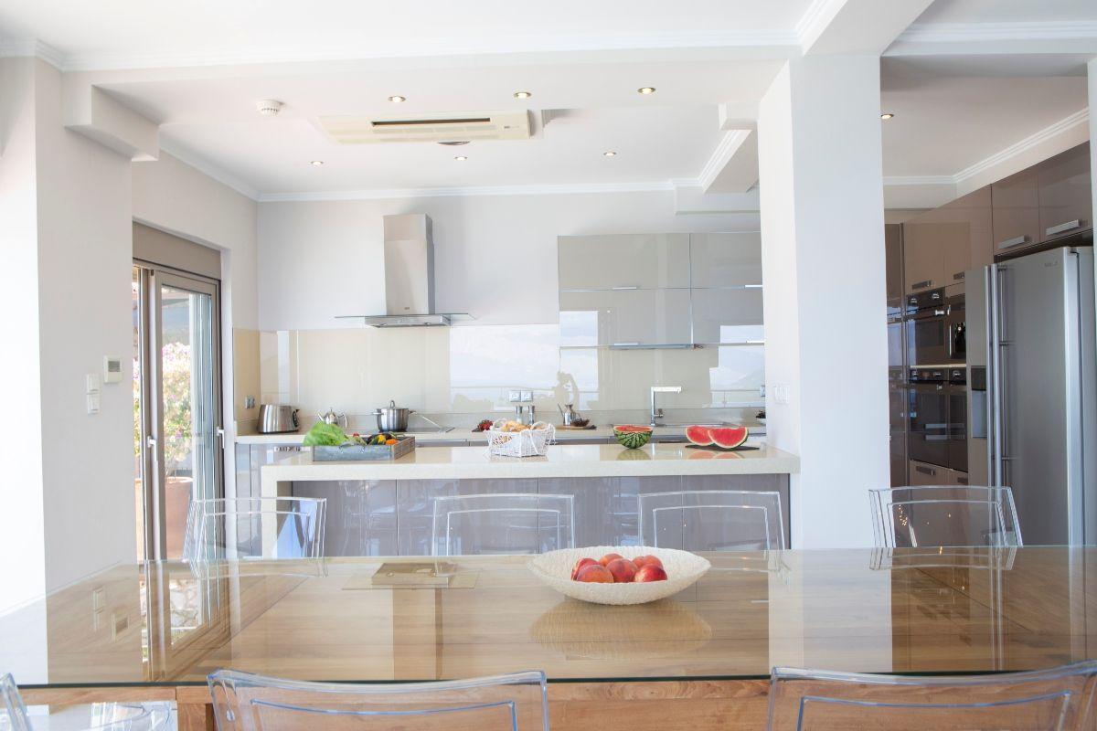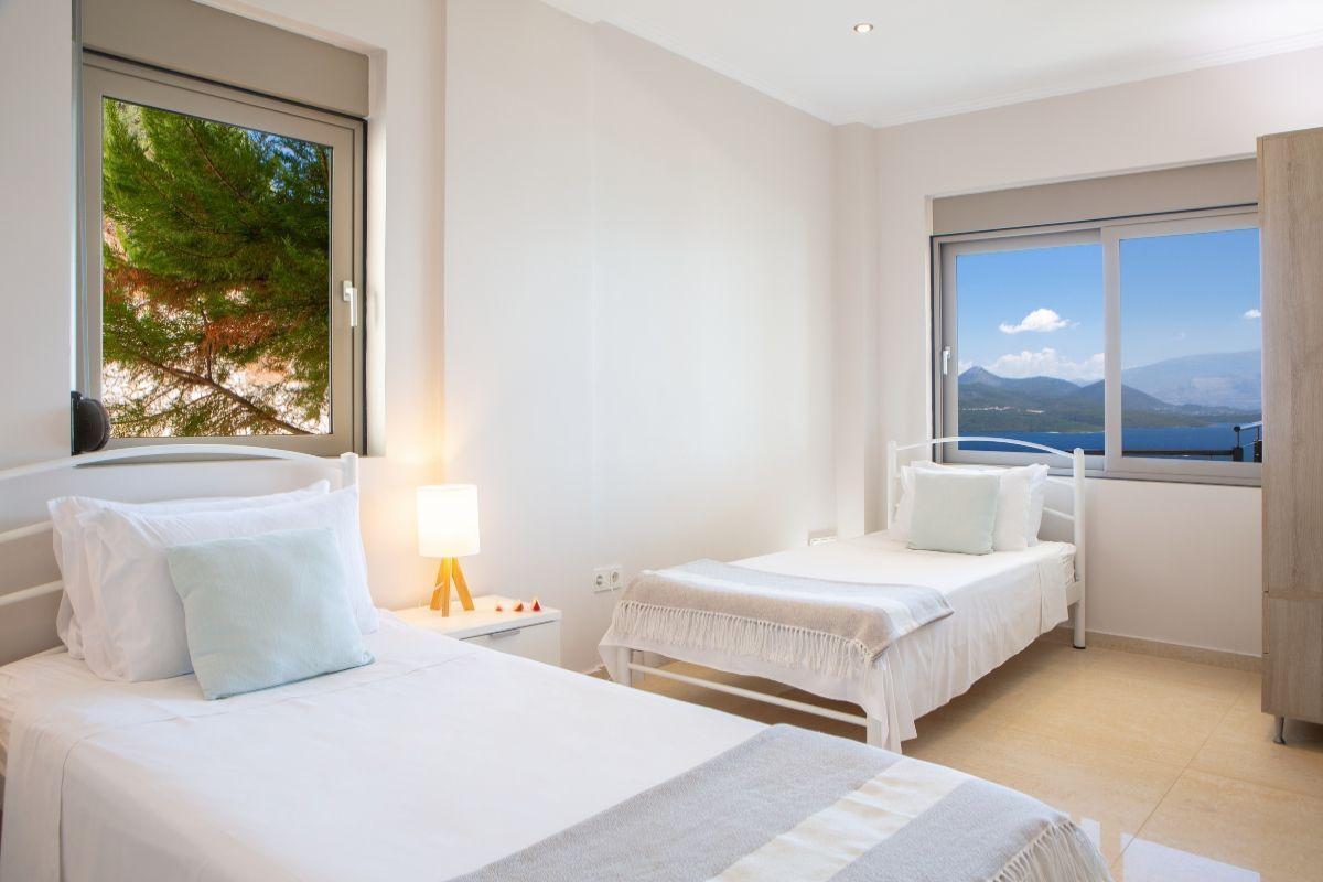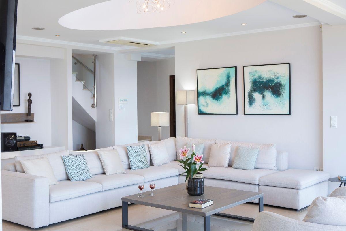 The interior of Villa Lilaea has been thoughtfully designed to offer comfort and elegance. The main living space boasts an open plan kitchen and living room with expansive sliding glass doors that seamlessly blend the indoor space with the outdoor pool area, allowing guests to fully enjoy the stunning sea views. The villa features five beautifully appointed bedrooms, each with en-suite facilities, to ensure privacy and convenience for all guests. The bedrooms vary from master doubles to double-twin setups, catering to various group or family compositions, and are spread out over three levels to provide ample space.
