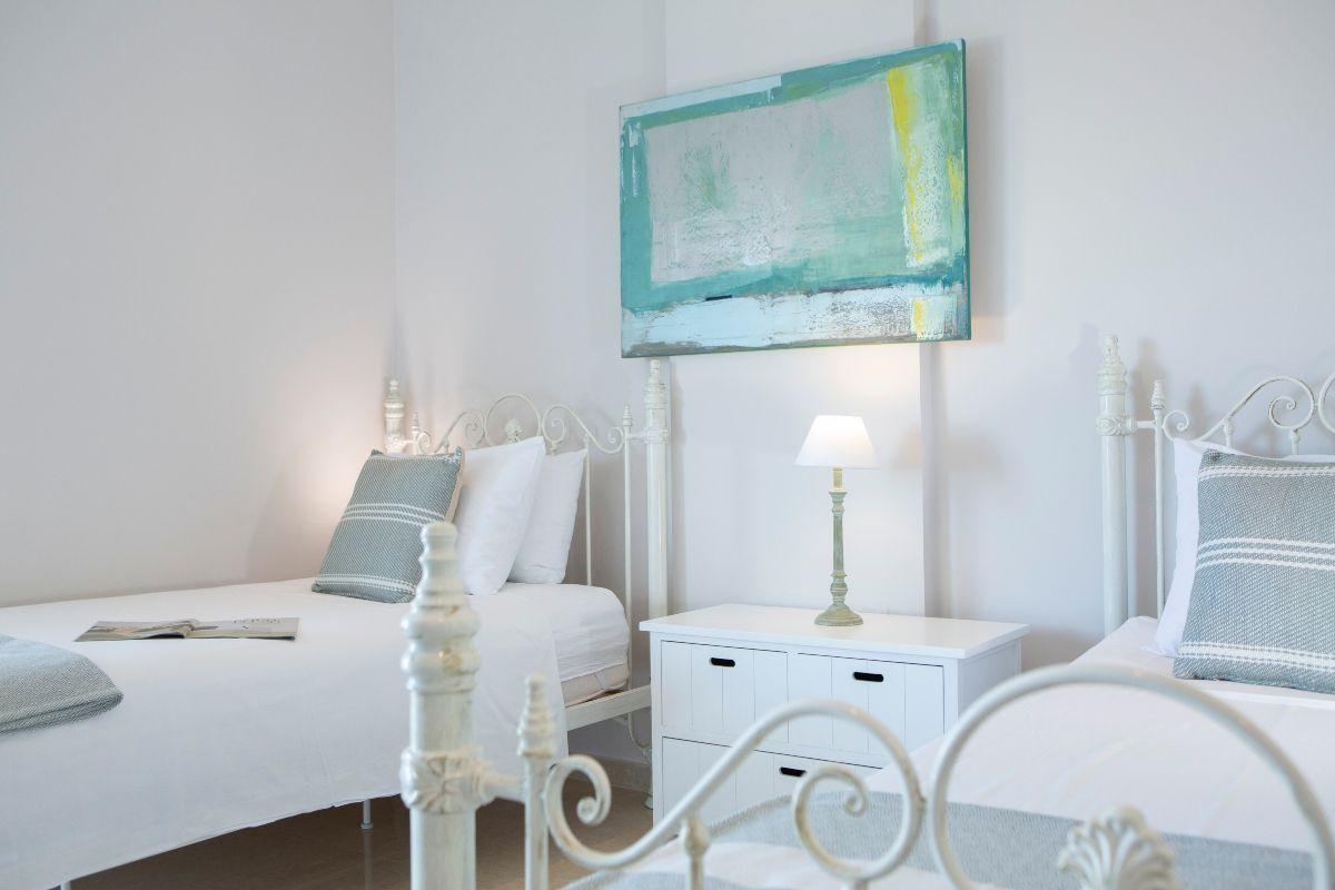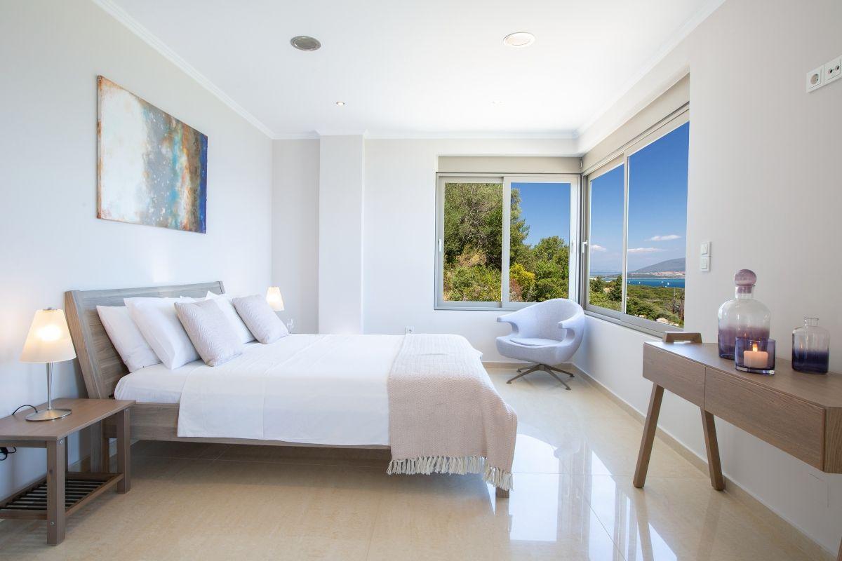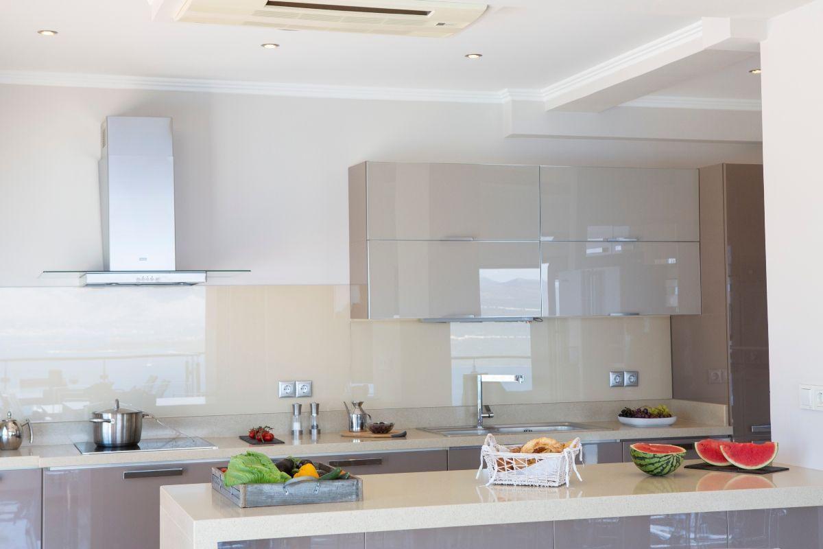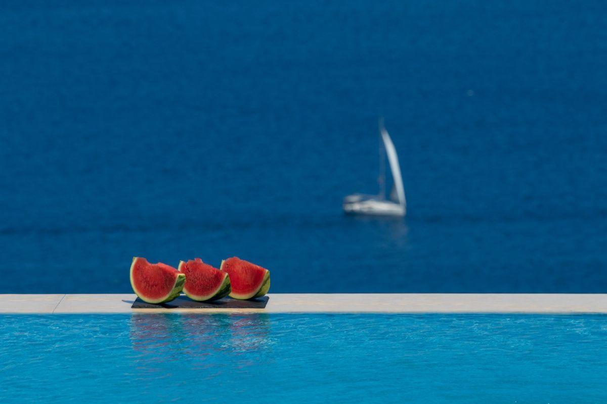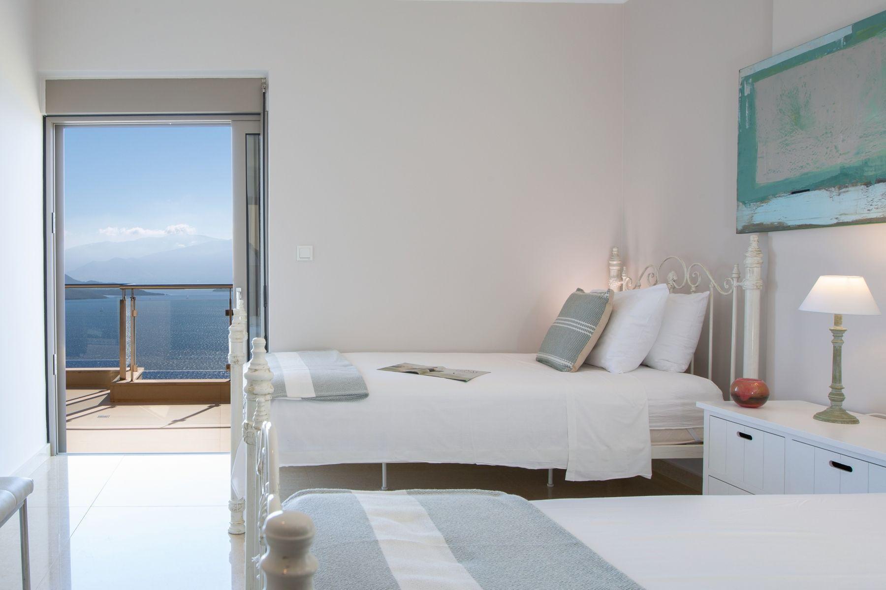 The interior of Villa Lilaea has been thoughtfully designed to offer comfort and elegance. The main living space boasts an open plan kitchen and living room with expansive sliding glass doors that seamlessly blend the indoor space with the outdoor pool area, allowing guests to fully enjoy the stunning sea views. The villa features five beautifully appointed bedrooms, each with en-suite facilities, to ensure privacy and convenience for all guests. The bedrooms vary from master doubles to double-twin setups, catering to various group or family compositions, and are spread out over three levels to provide ample space.
