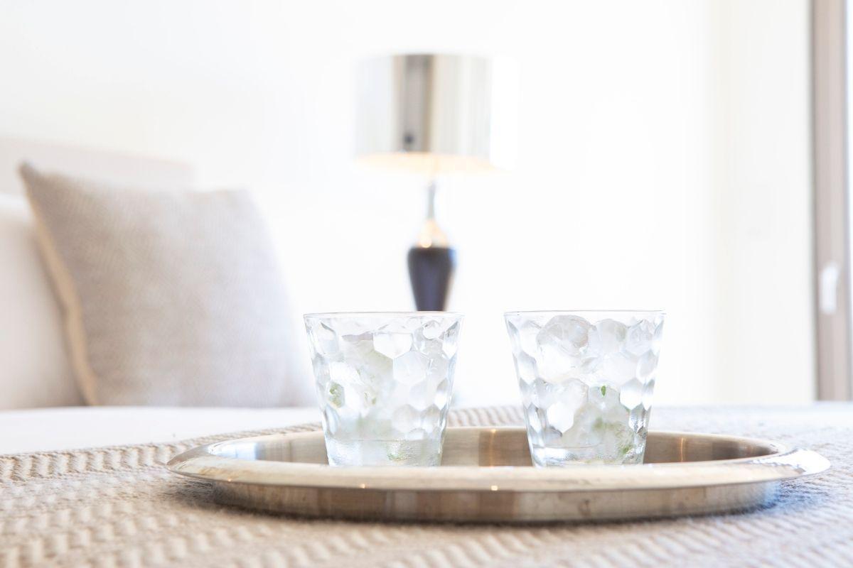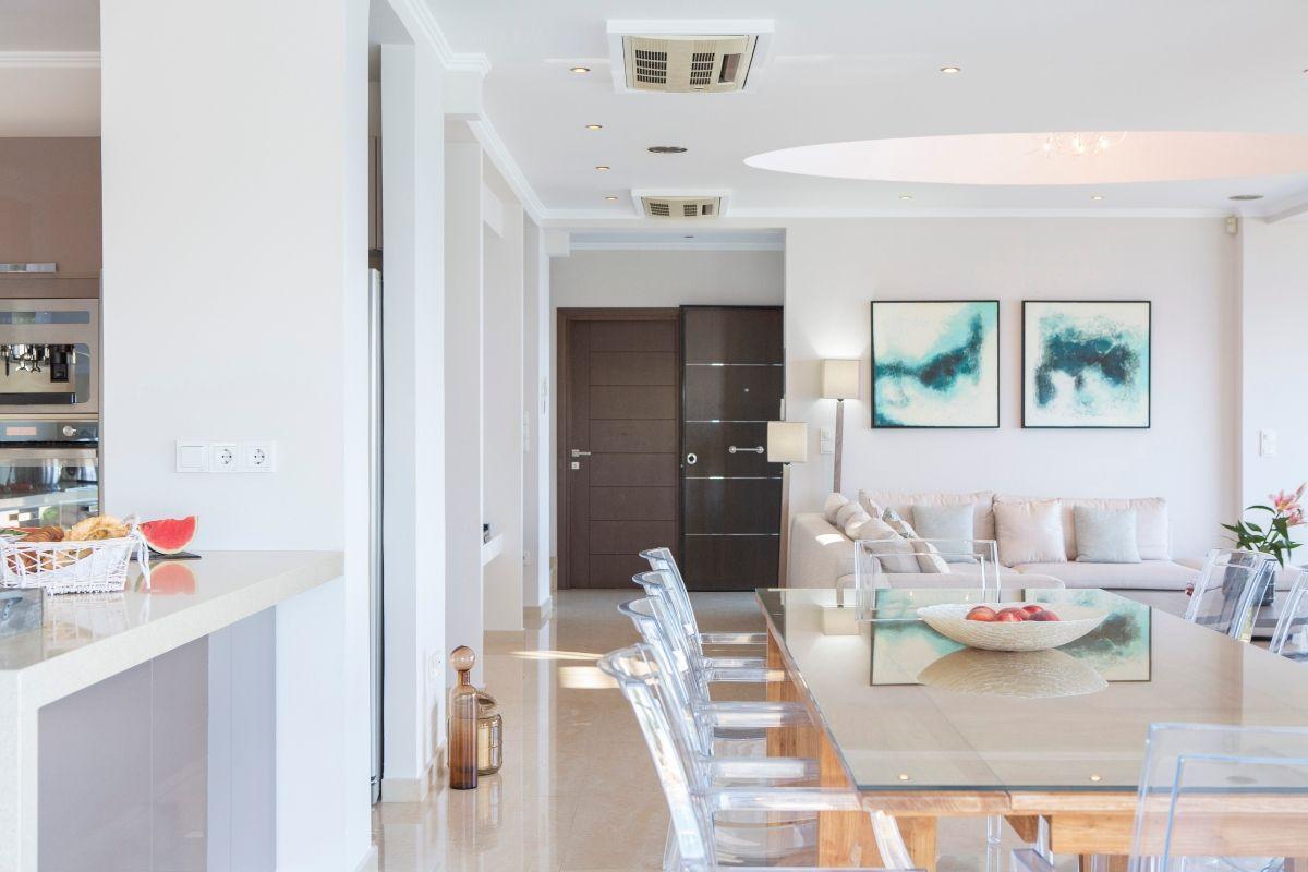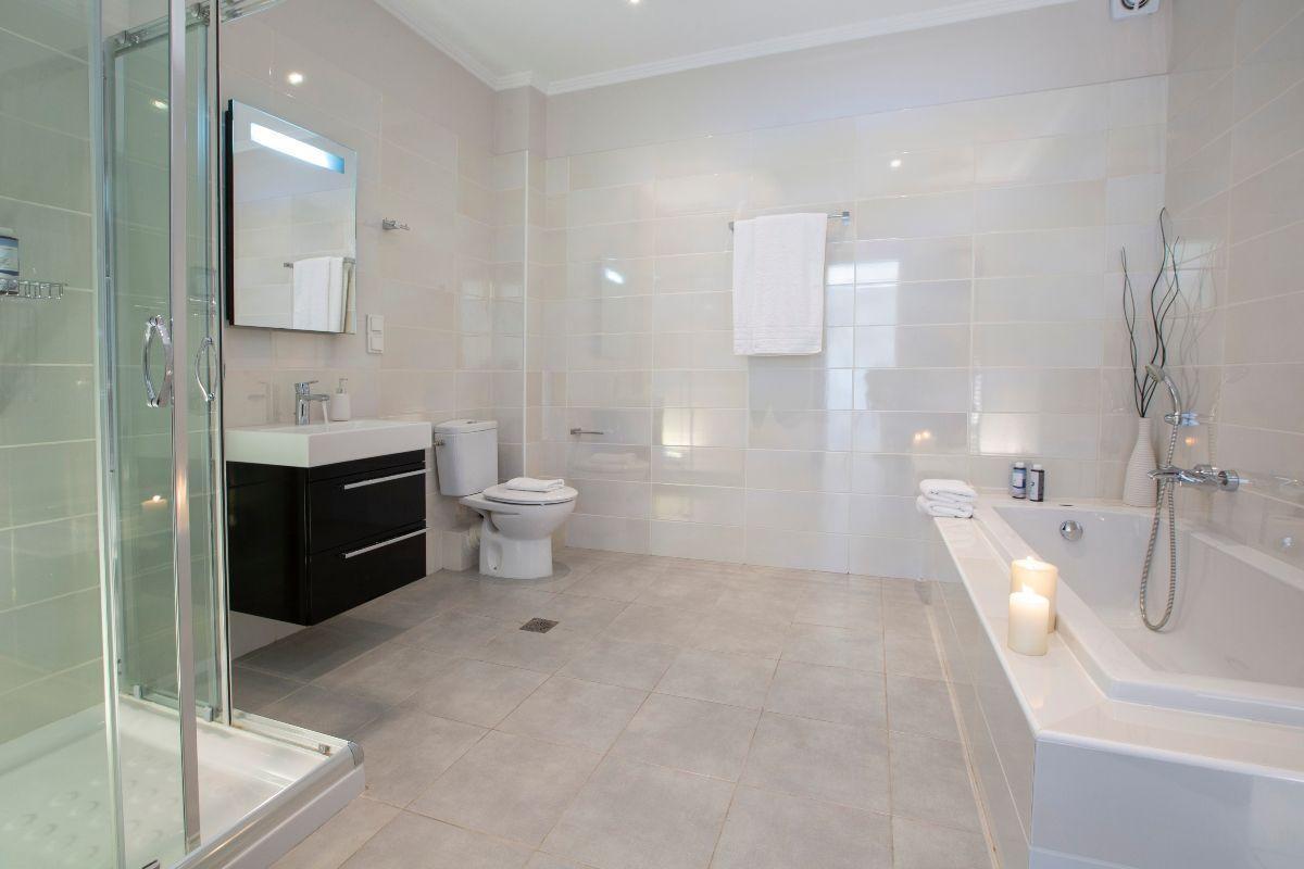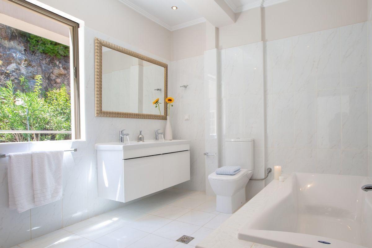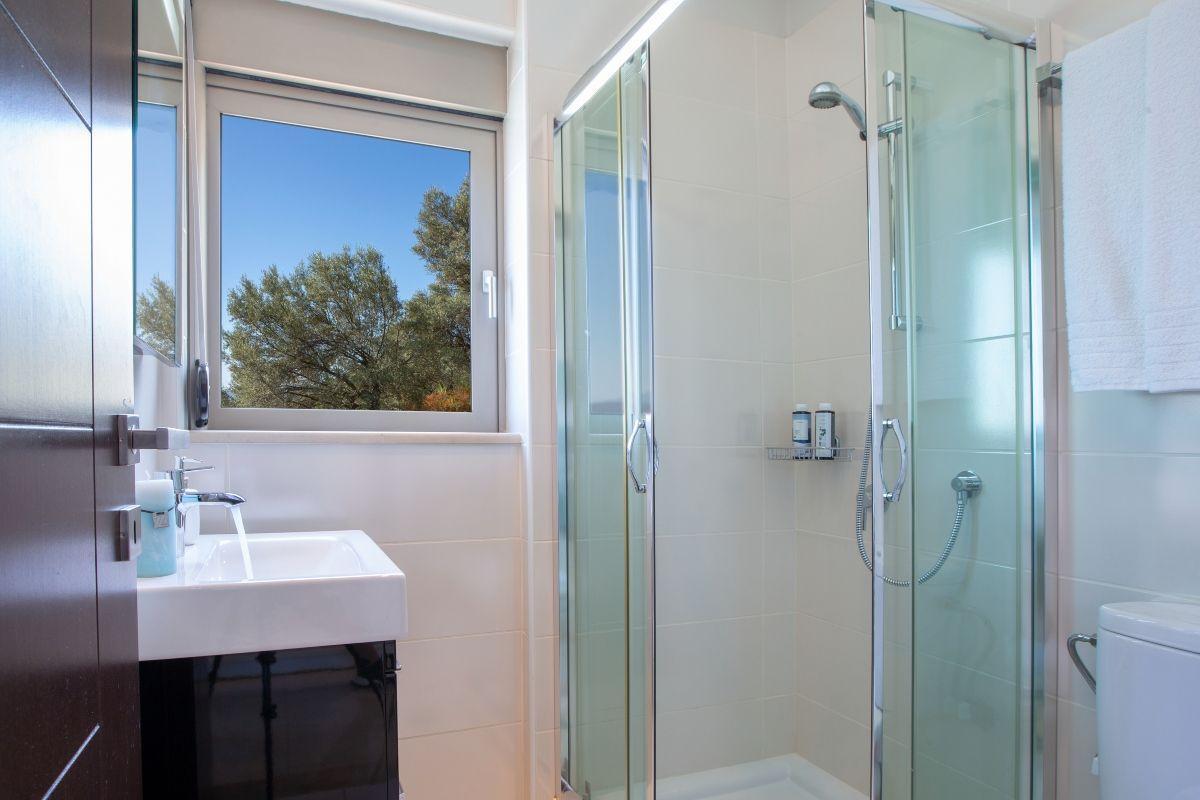 The interior of Villa Lilaea has been thoughtfully designed to offer comfort and elegance. The main living space boasts an open plan kitchen and living room with expansive sliding glass doors that seamlessly blend the indoor space with the outdoor pool area, allowing guests to fully enjoy the stunning sea views. The villa features five beautifully appointed bedrooms, each with en-suite facilities, to ensure privacy and convenience for all guests. The bedrooms vary from master doubles to double-twin setups, catering to various group or family compositions, and are spread out over three levels to provide ample space.