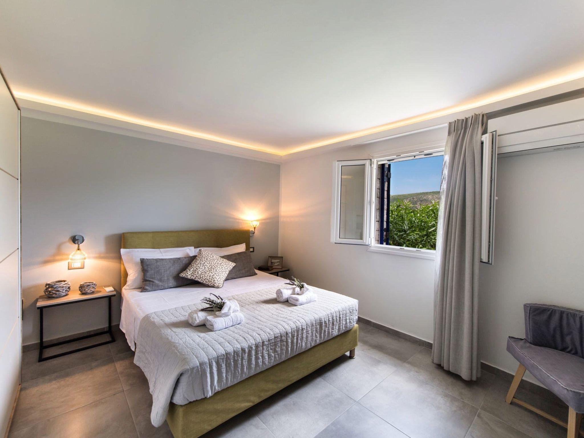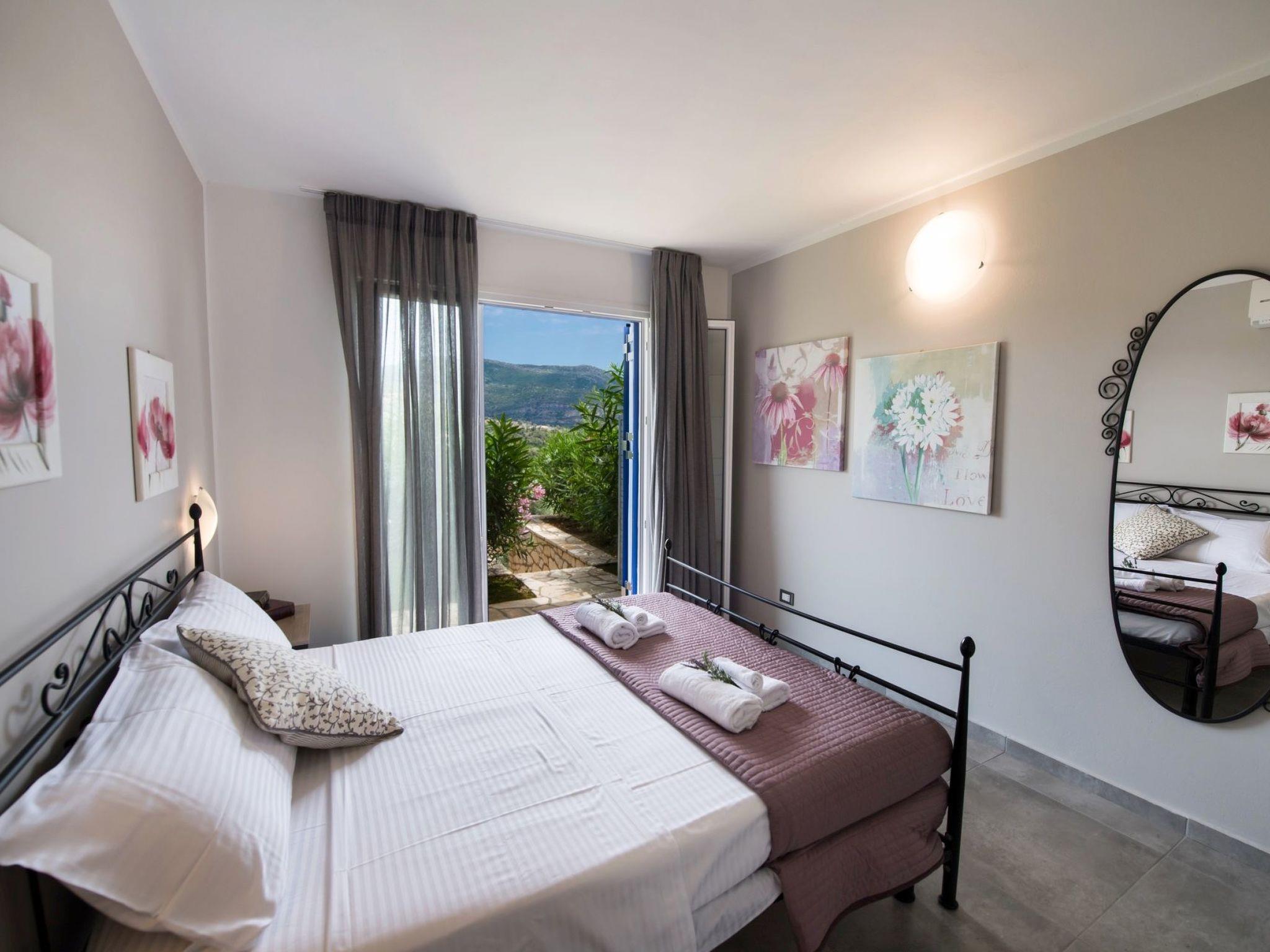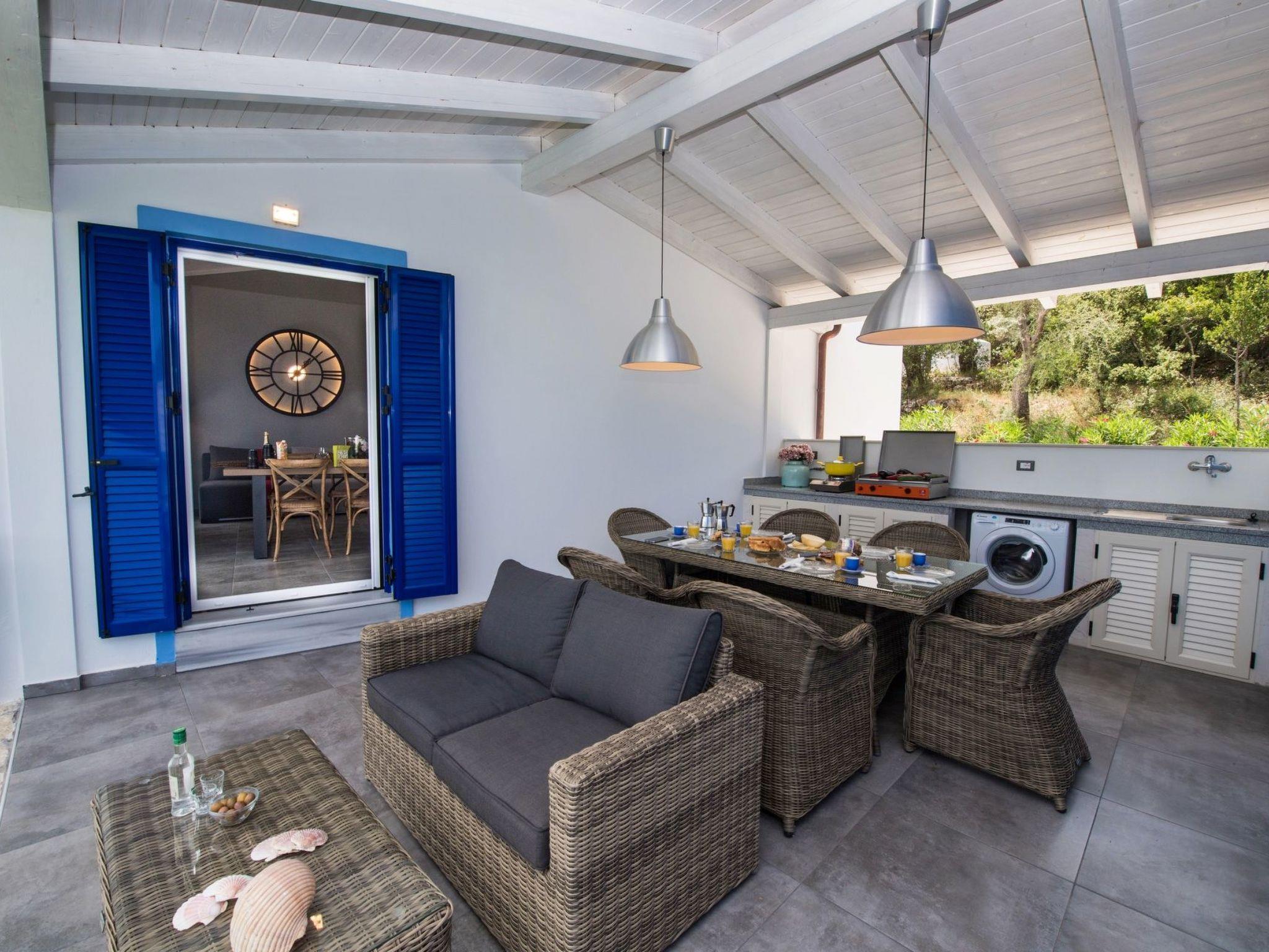 Villa Amantea3 is for 6 persons maximum, it consists of two floors of about 65 square metres each, on the first floor there is the living area, on the ground floor there are 2 double bedrooms, a half bedroom with bunk beds and storage room. There are 2 large bathrooms with showers. The living area has an equipped kitchen, a large table with 6 chairs, a comfortable sofa, and is communicating with a balcony and a large terrace both with a panoramic view of the bay of Sivota. The covered terrace is furnished with a second kitchen with gas barbecue, cooker and sink, table and sitting area. There are: Flat screen TV, Italian and American coffee machines, internet access, washing machine, dishwasher, an iron, and a generous supply of crockery and cutlery. Air conditioning in the living area and in the 2 double bedrooms.