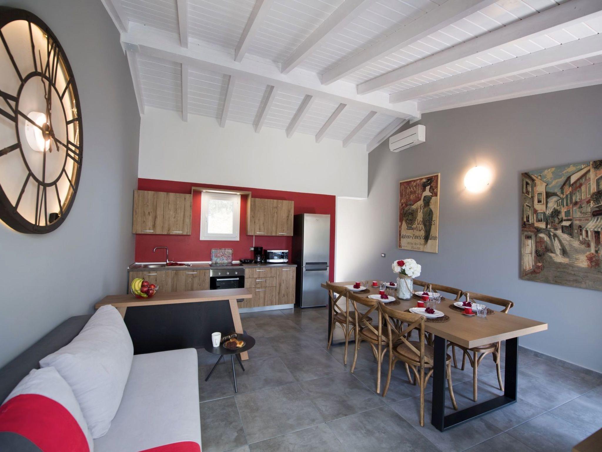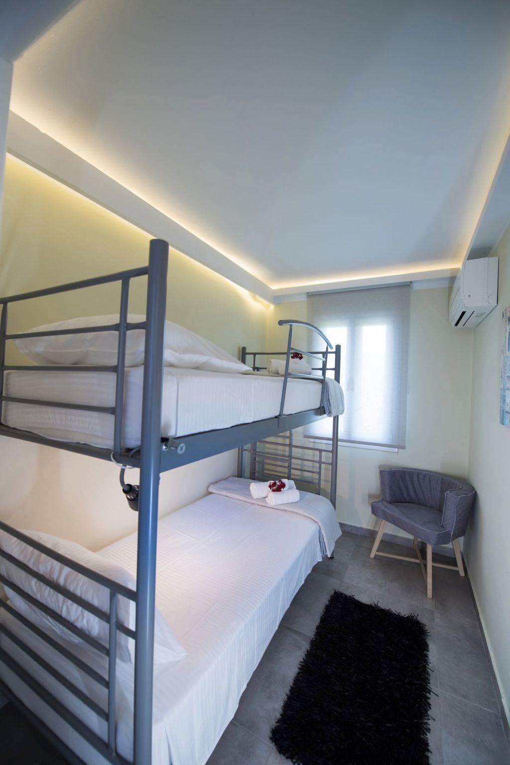 The Villa Amantea4 is for 4 persons maximum, it consists of two floors of about 65 square meters each, on the first floor we find the living area, on the ground floor there is 1 double bedroom, a half bedroom with bunk beds and storage room. There is 1 large bathroom with shower. The living area has an equipped kitchen, a large table with 6 chairs, a comfortable sofa, and is communicating with a balcony with a panoramic view over the bay of Sivota. There are: Flat screen TV, Italian and American coffee machines, internet access, washing machine, dishwasher, an iron, a generous supply of crockery and cutlery. Air conditioning in the living area and in the 2 double bedrooms.