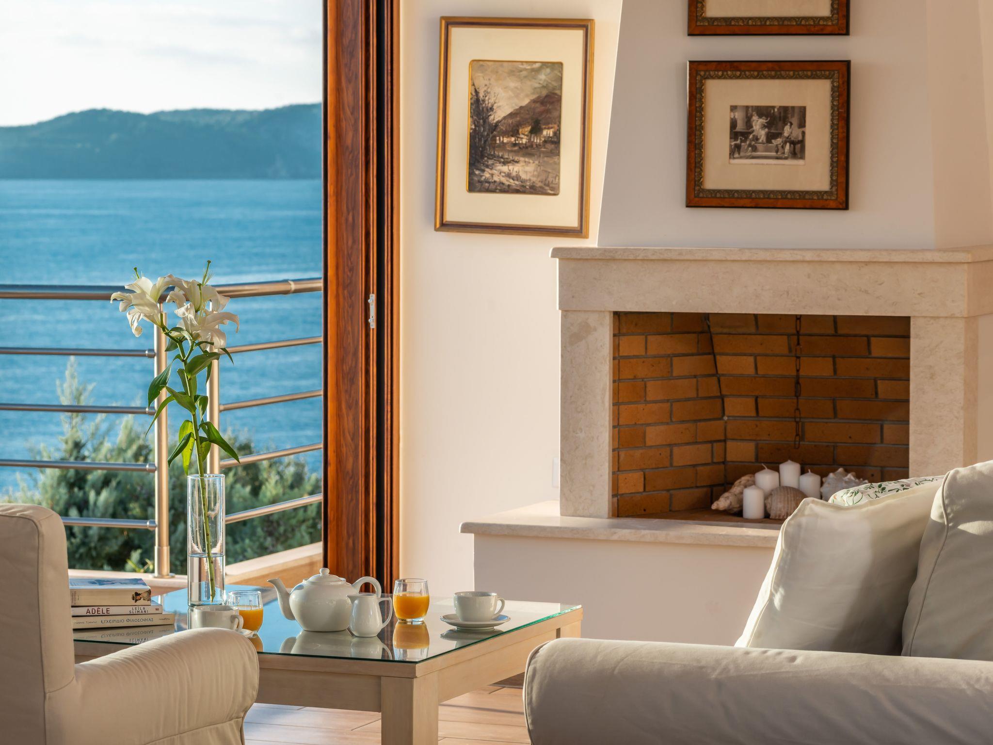 Bathed in Mediterranean sunlight, the interiors showcase tall glass openings, soft earth tones, and natural wood details that create a warm yet modern aesthetic. Every space invites the eye toward the shimmering Ionian horizon, blurring the boundary between indoors and outdoors.