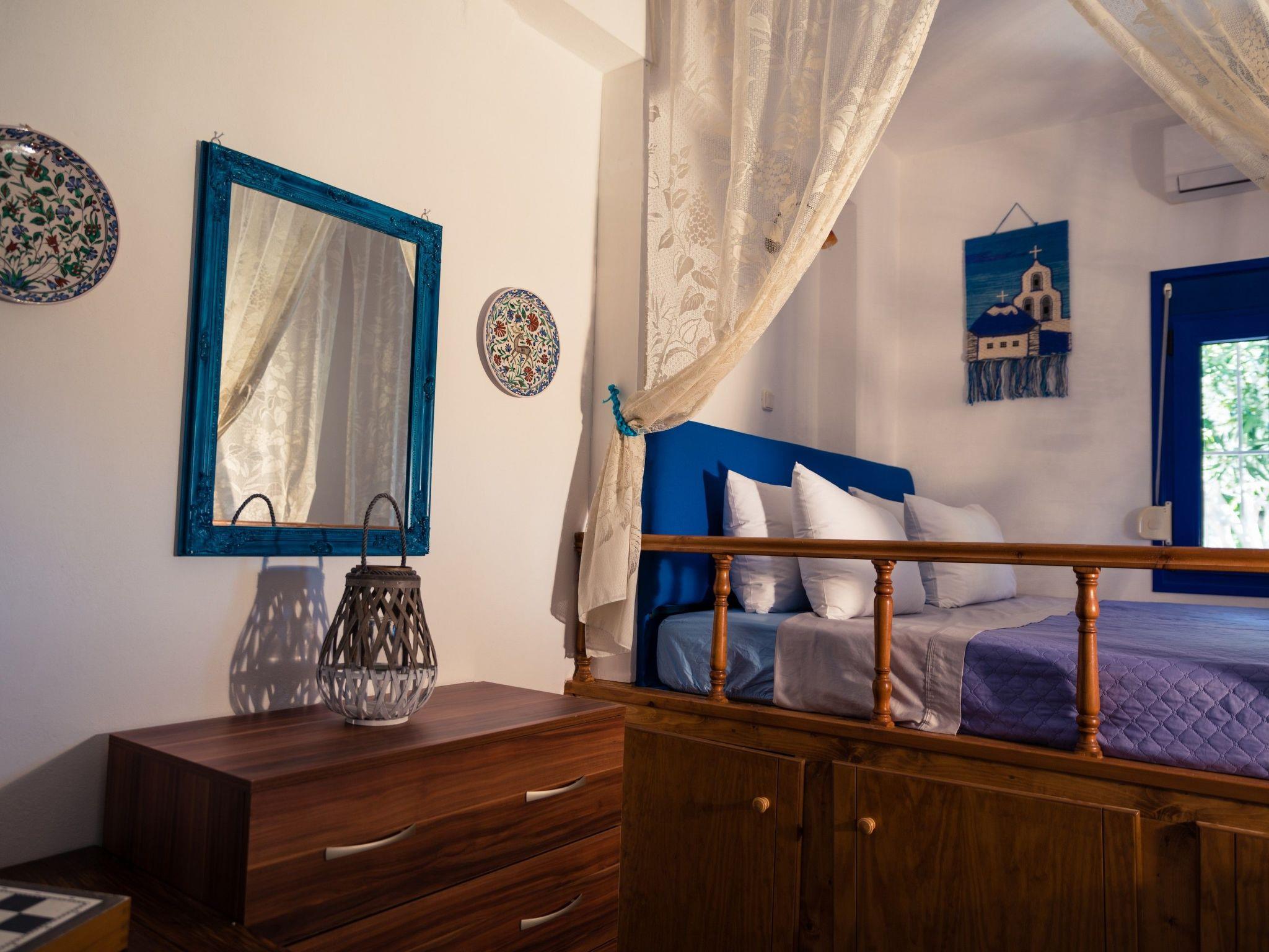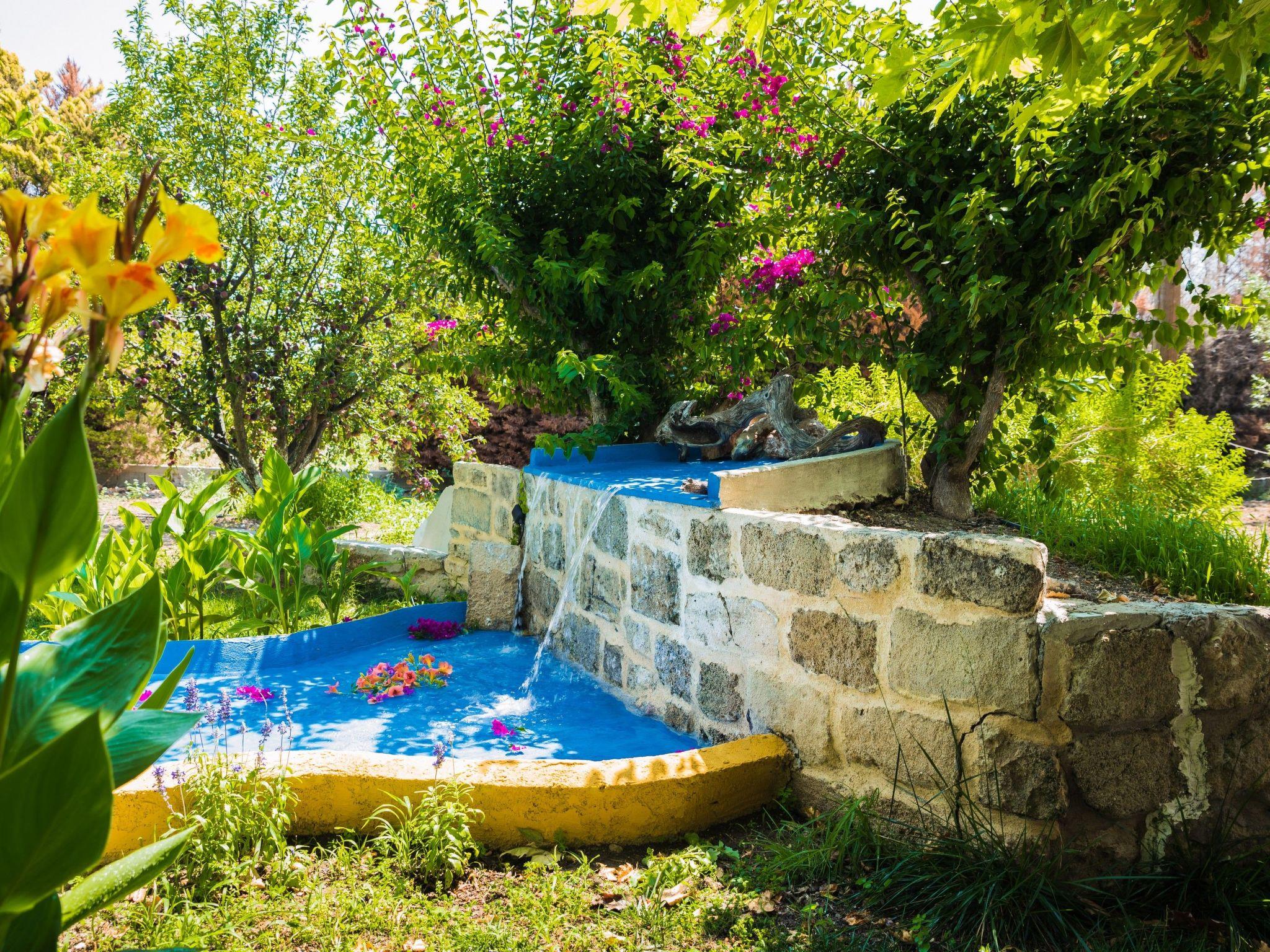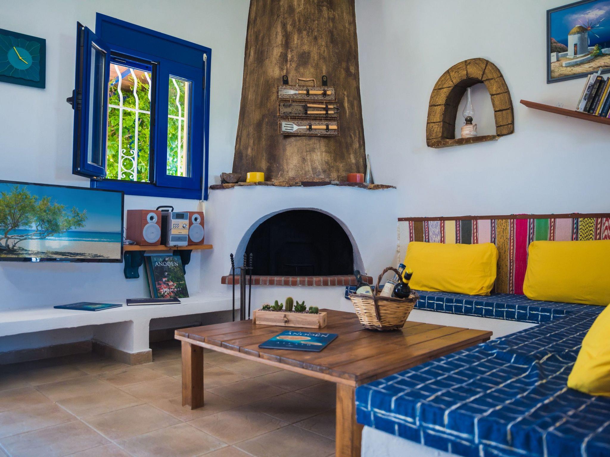 The interior of Villa Marqua includes two enchanting bedrooms fashioned in the customary island style with traditional handmade king size beds offering their occupants the tranquility and rest they need on their vacation. An open-plan room includes a spacious lounge area with fireplace, stereo sound system and flat screen television for countless moments of relaxation, as well as a fully equipped country style kitchen where our guests are invited to try out their culinary skills. A cozy rustic dining area is located in the same space.