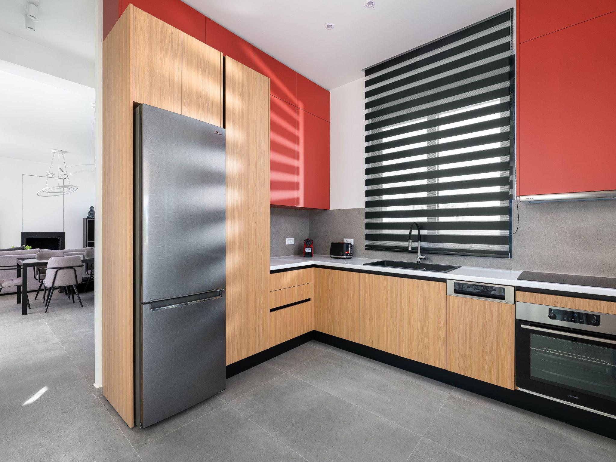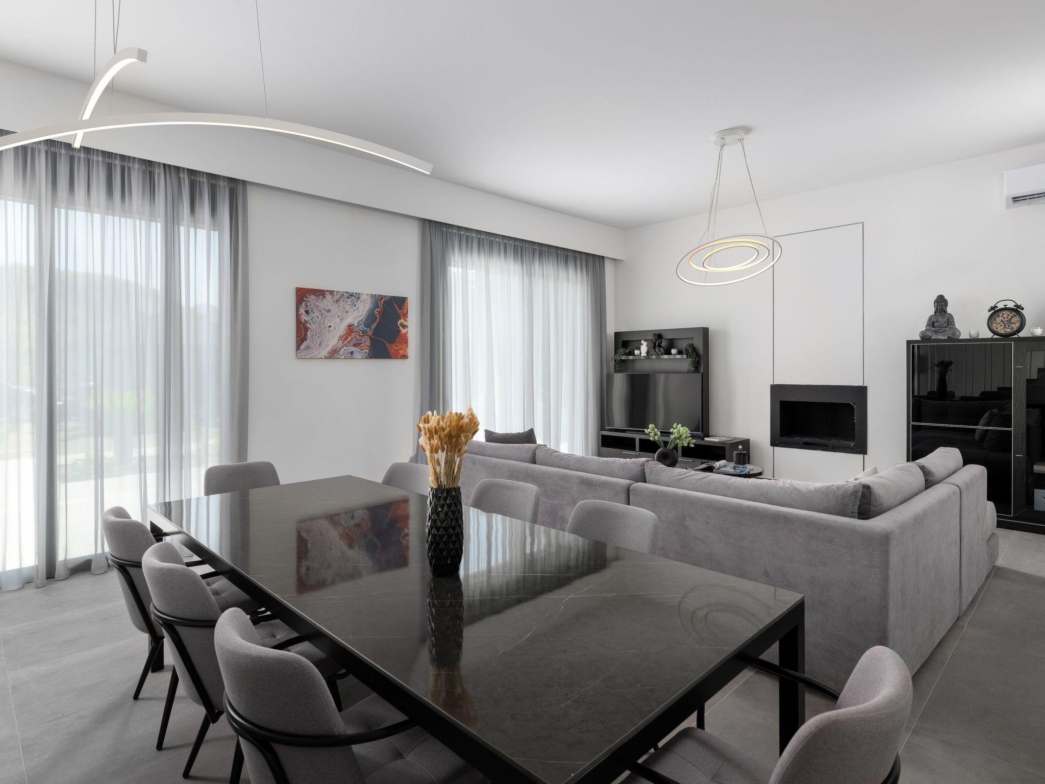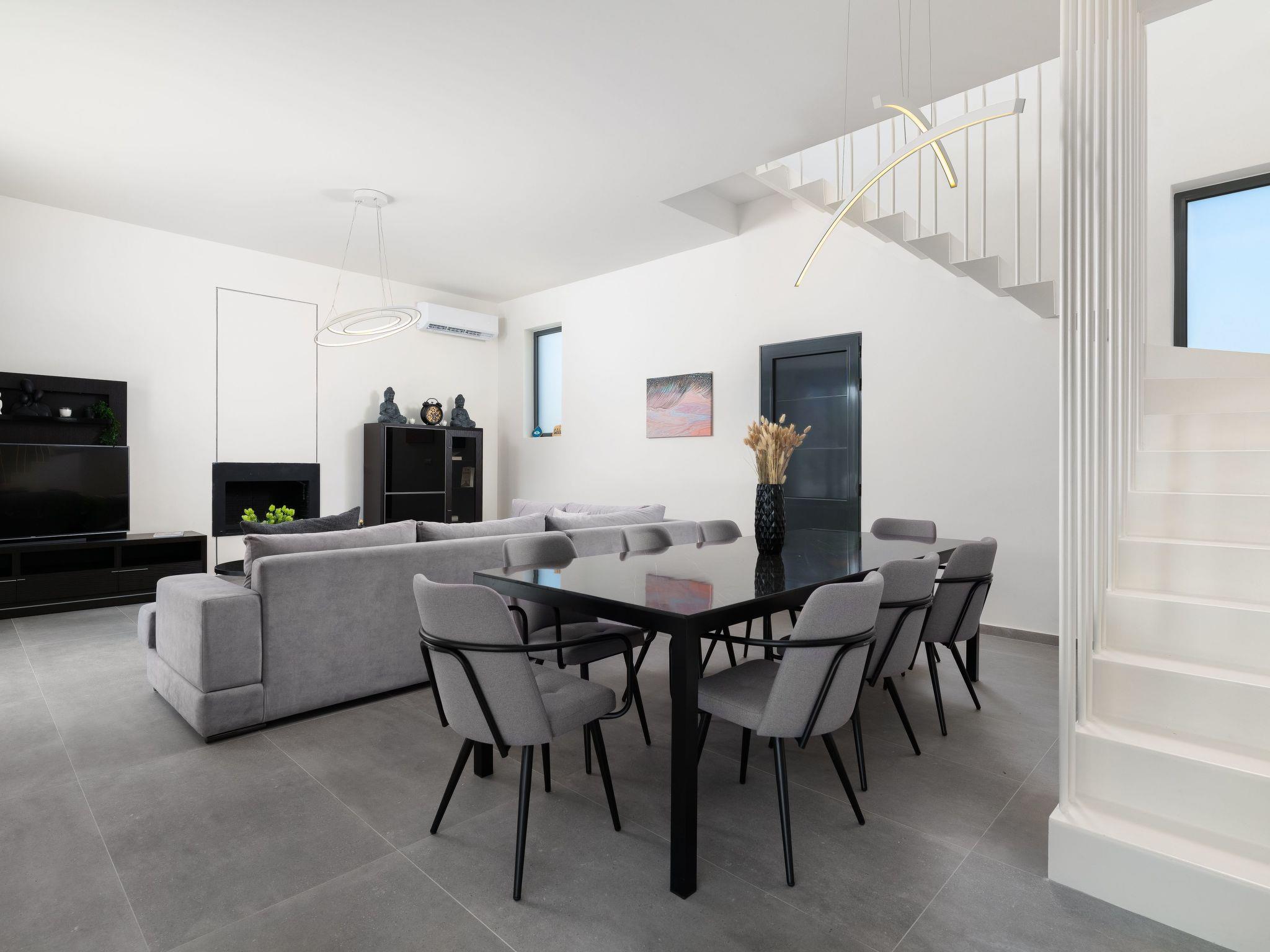 As you step onto the ground floor, be greeted by the warmth of the sun filtering through the oversized windows, illuminating the bright and welcoming living area. Sink into the plush comfort of the sofas by the fireplace, where cozy evenings and movie nights beckon. Adjacent, a modern dining area awaits, ready to host intimate gatherings of up to eight guests, while the fully equipped kitchen stands ready to inspire your culinary adventures, with direct access to the pool and barbecue area for seamless indoor-outdoor living.