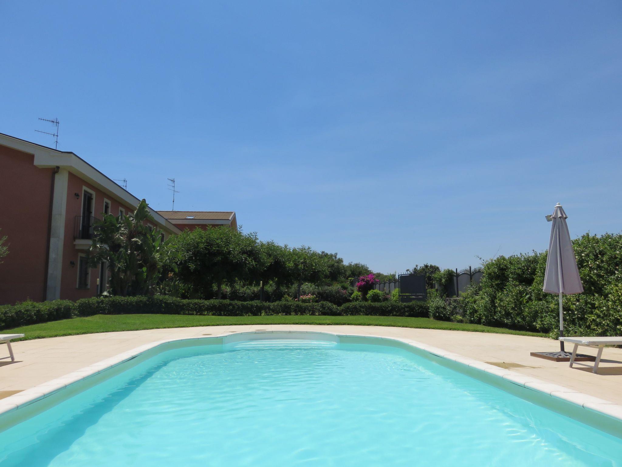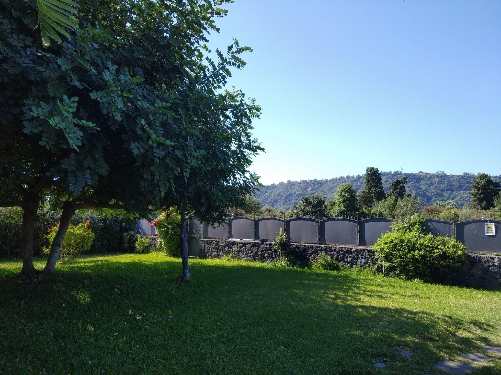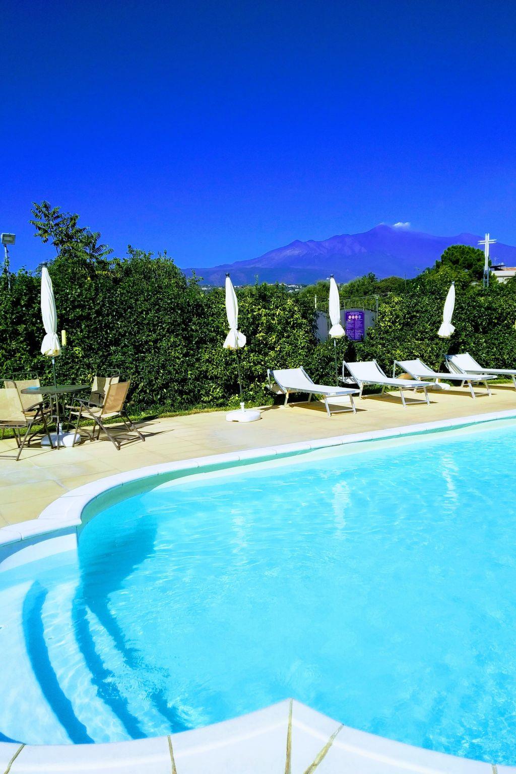 Swimming pool with sun loungers and parasols with Etna view, shared with the other guests of the residence (subject to use of headphones and closure during the hours of rest/silence)). Picnic area in the garden. Parking along the residence's private road.
