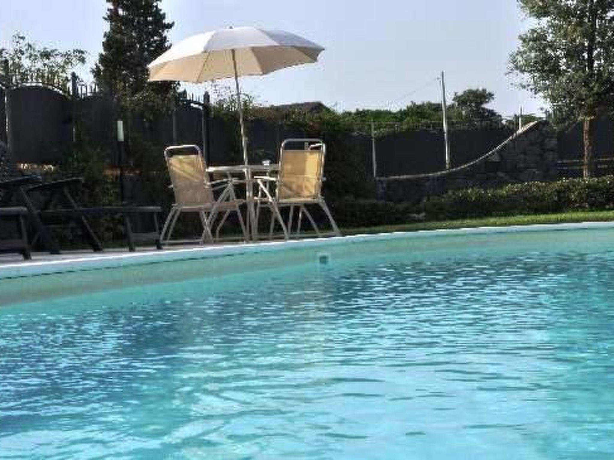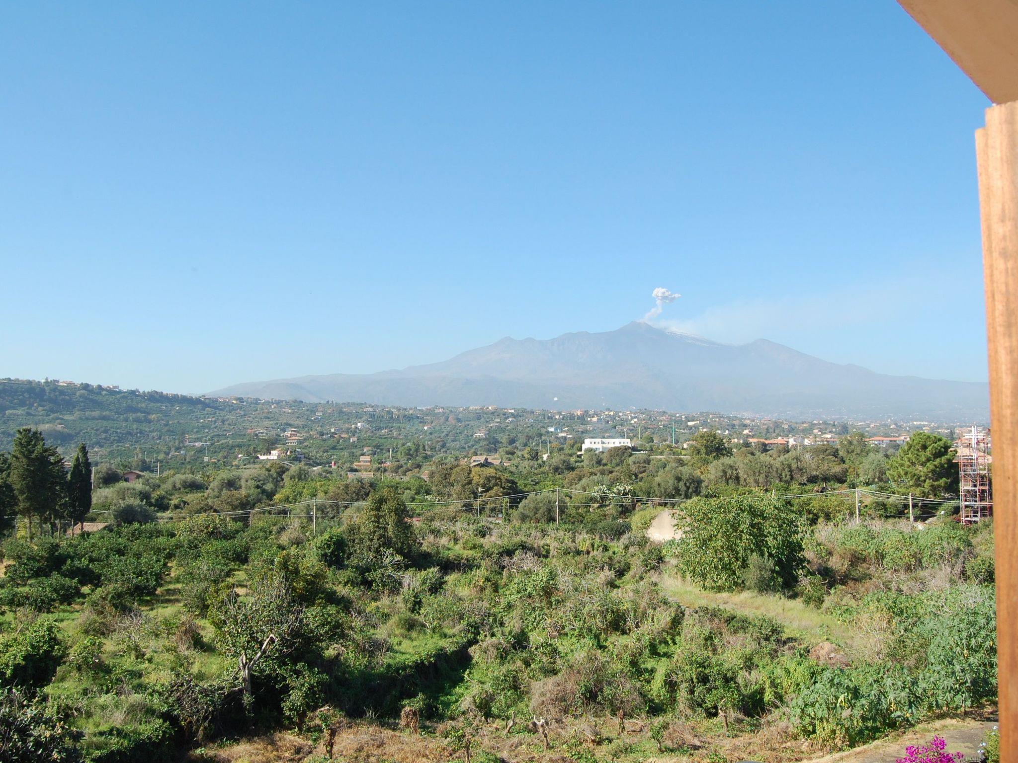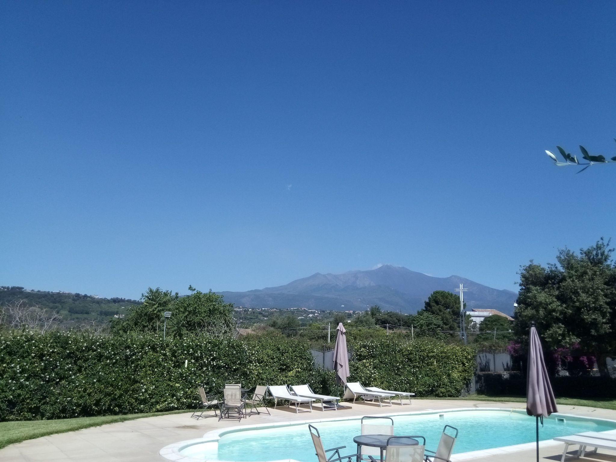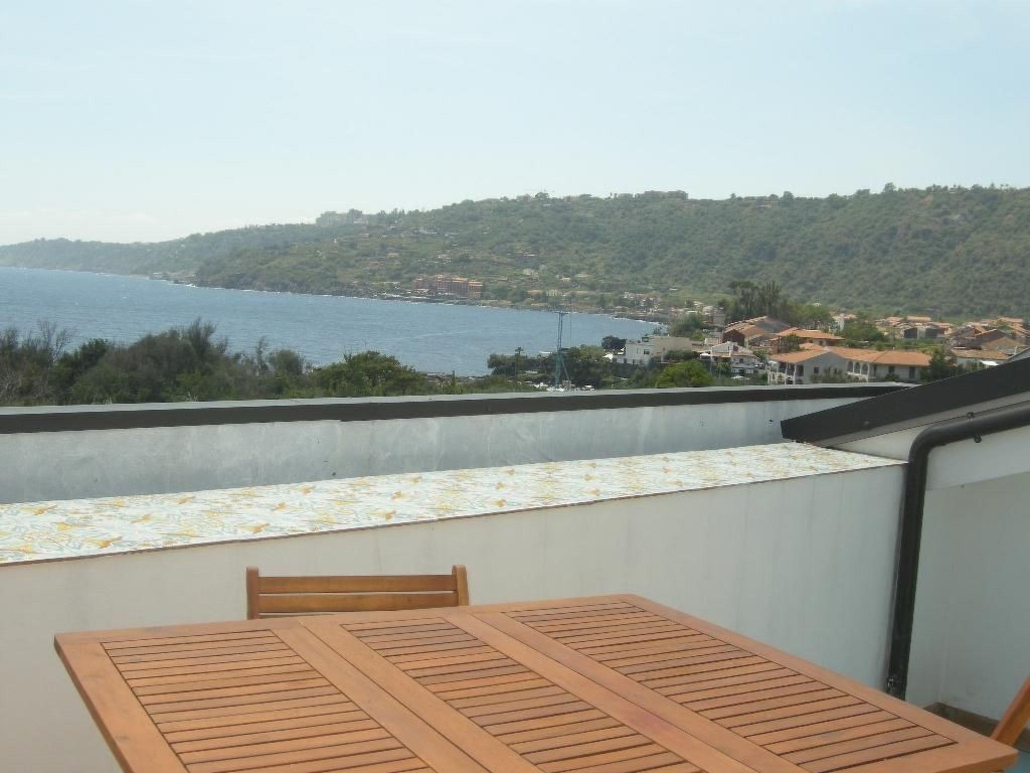 The terrace is furnished with a table and chairs. The apartment is on the same level as the garden and affords views of Etna, the sea and the garden of the residence.