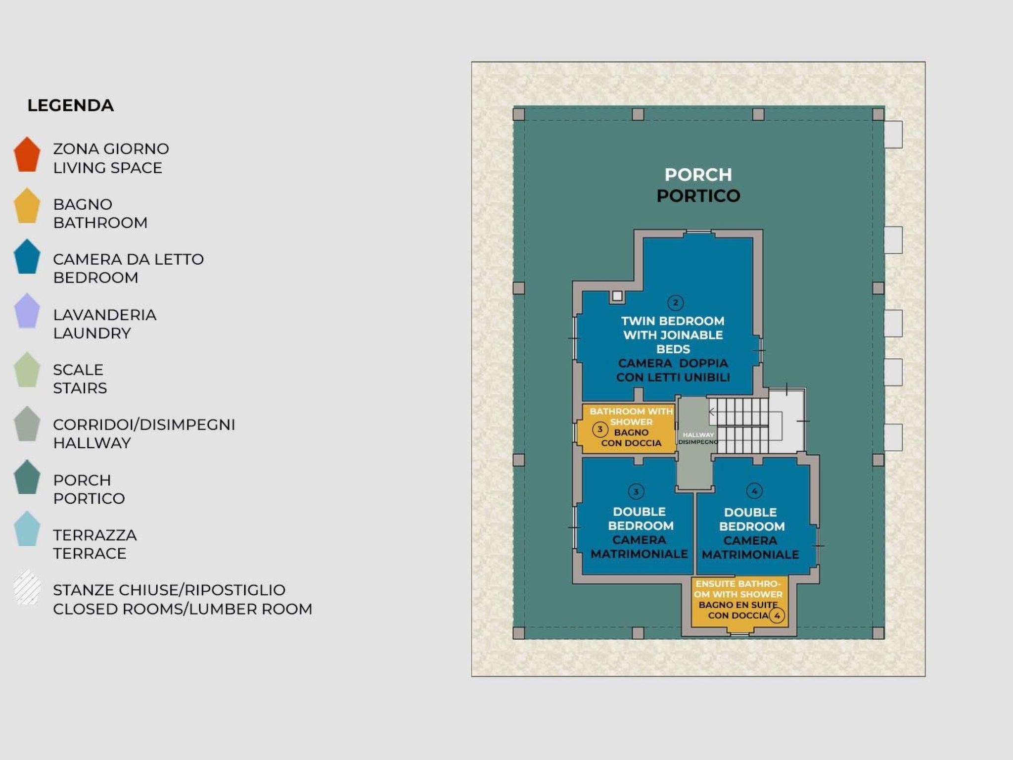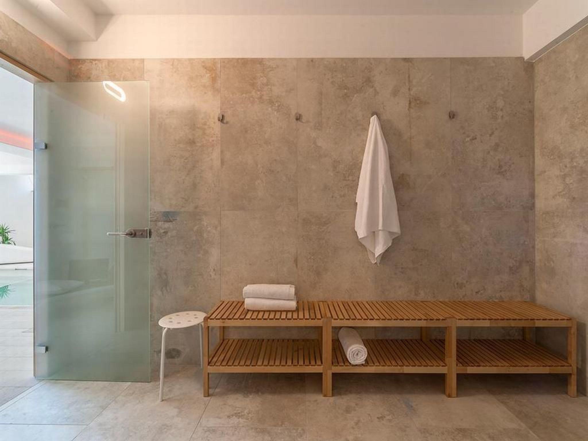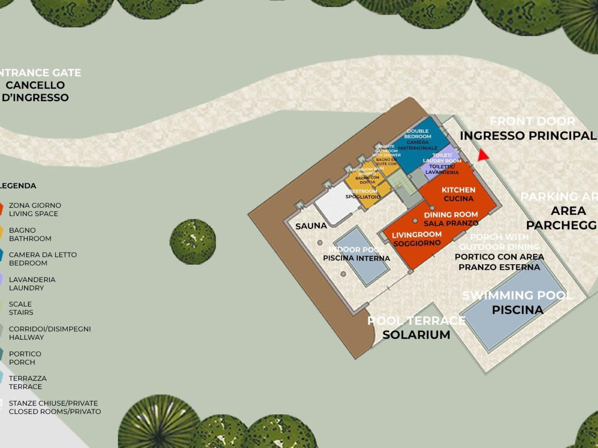 On the ground floor are the kitchen with island and living room with sofa, a double bedroom with bathroom, laundry room, indoor pool (heated on request) and sauna.