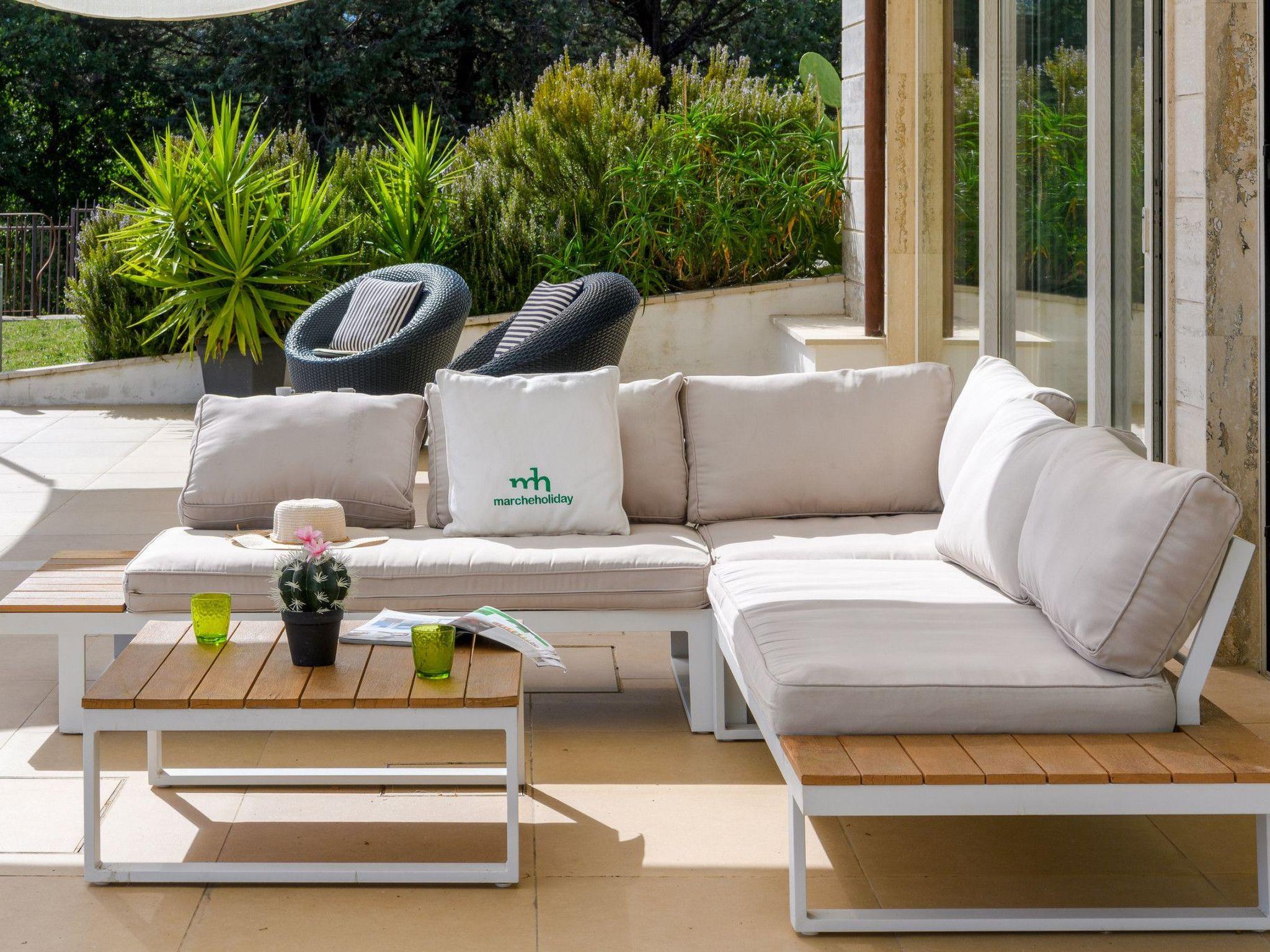 At'esterno ampio giardino con piscina e solarium con lettini.