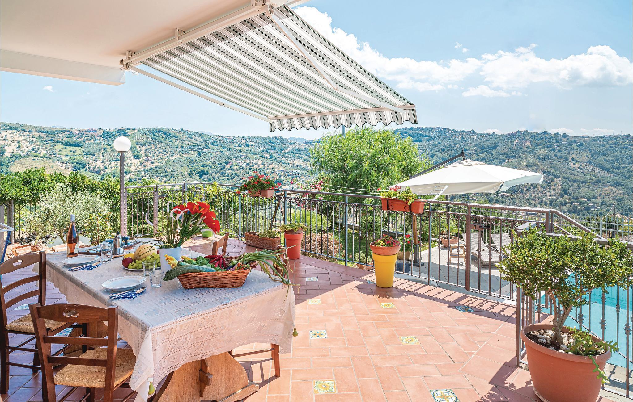 Del av et tofamiliehus med basseng og utsikt over den vakre Agropolibukten og sletten i Paestum.