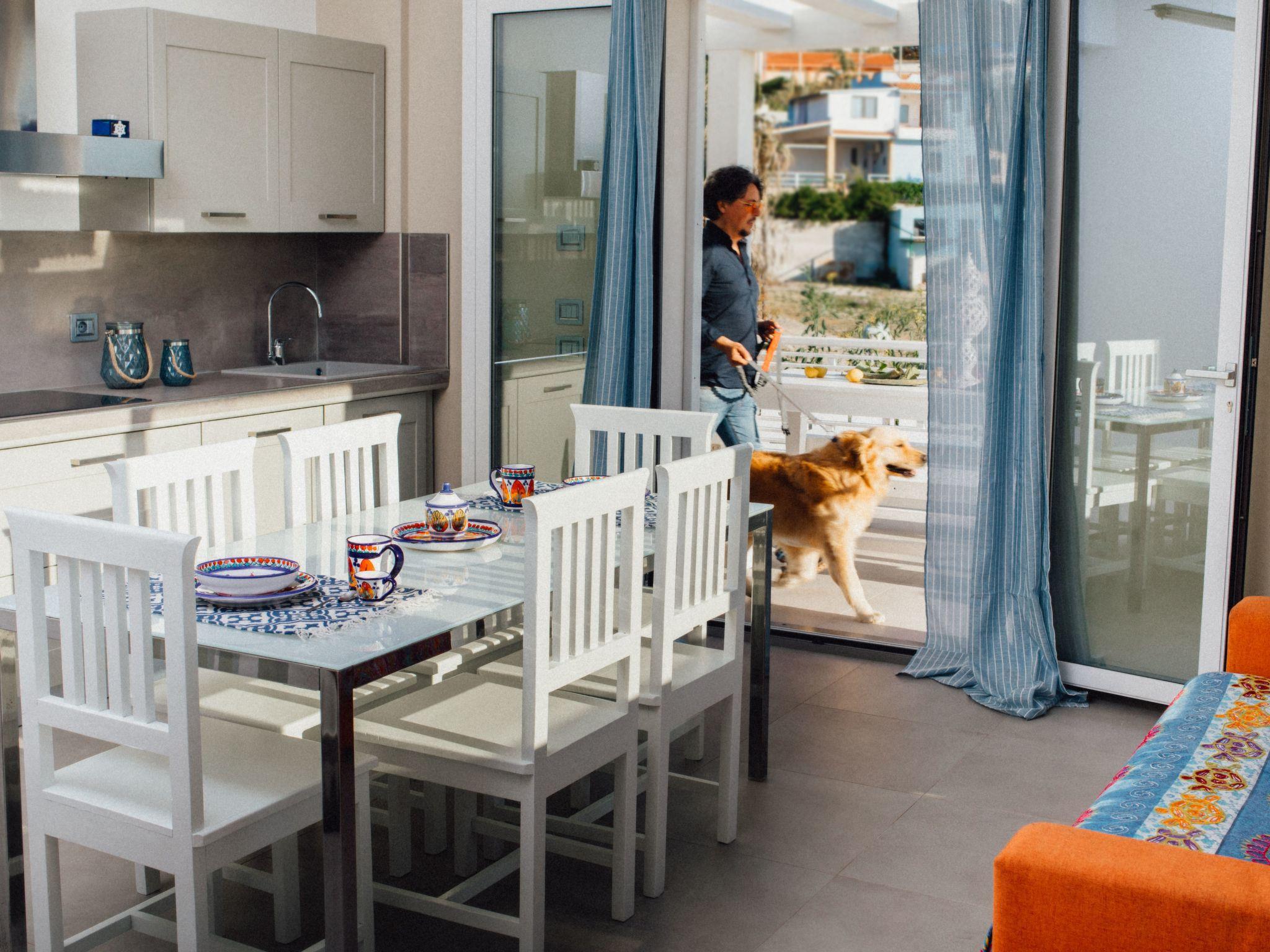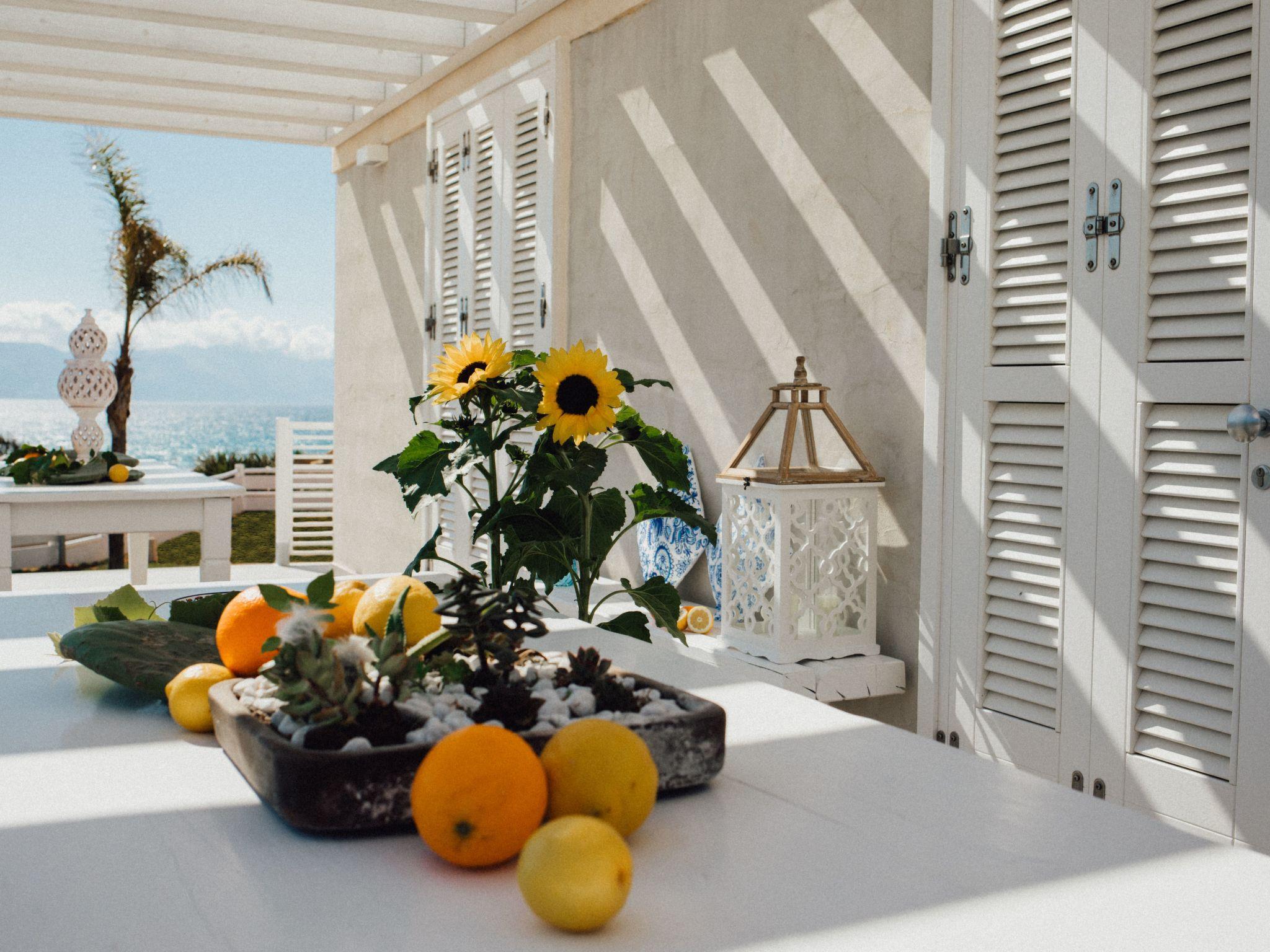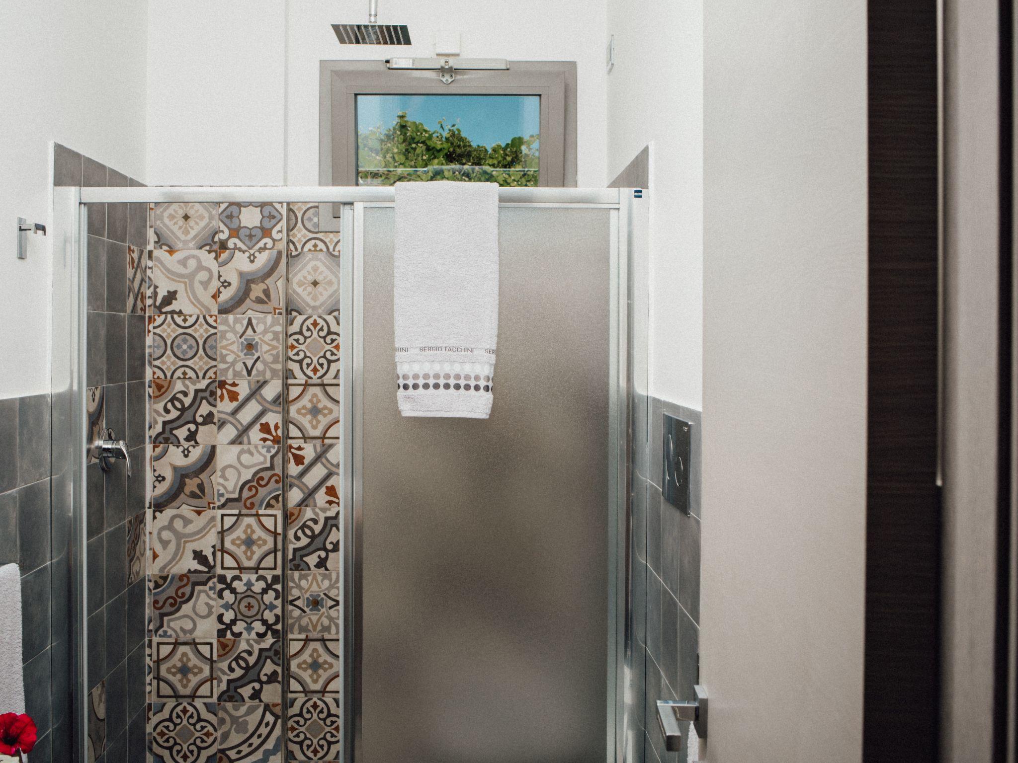 The Villa consists of 2 double bedrooms, a third bedroom can be arranged either with a double bed, or with two singles, according to the guest's needs. A sofa bed, sleeping two, is located in the living room. Every single bedroom has a window, in addition to the door/glass window that opens onto the small terrace, where you can relax in total relaxation; No. 2 shower rooms, bordering the bedrooms, the latter equipped with tablecloths, hair dryer, bidet, toilet, hanging washbasin; Access is from the living room/kitchen, where the glass window that opens onto the garden and the sea stands out;