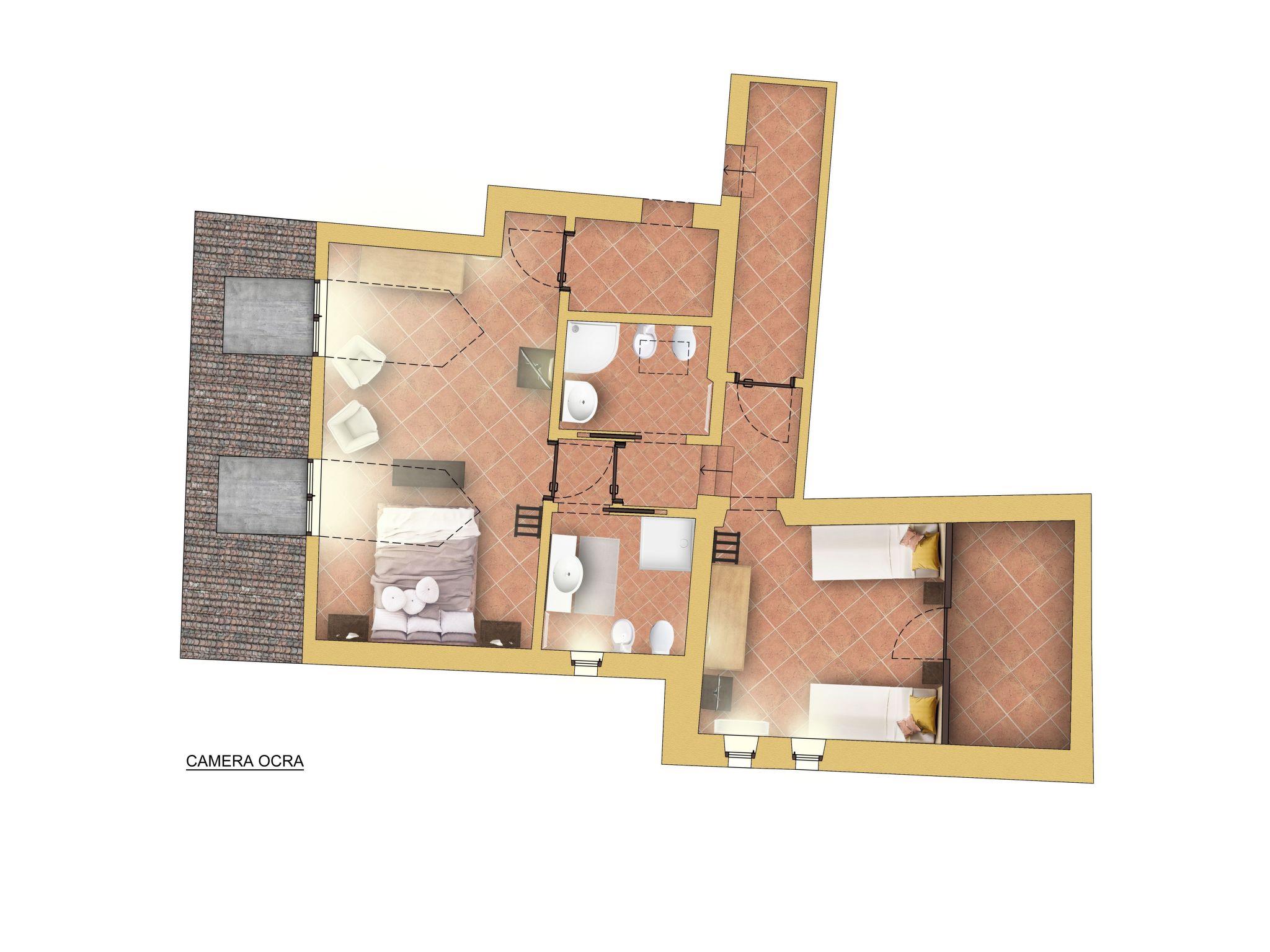 The Ocra family suite is located on the second floor and is about 40 square metres in size. It is a double room with a wooden roof with two windows, and can communicate with a smaller room with two single beds, two bathrooms both with window and shower, equipped with hairdryer, independent air conditioning, wi-fi internet, safe, TV. Bathrobes are available in the room.