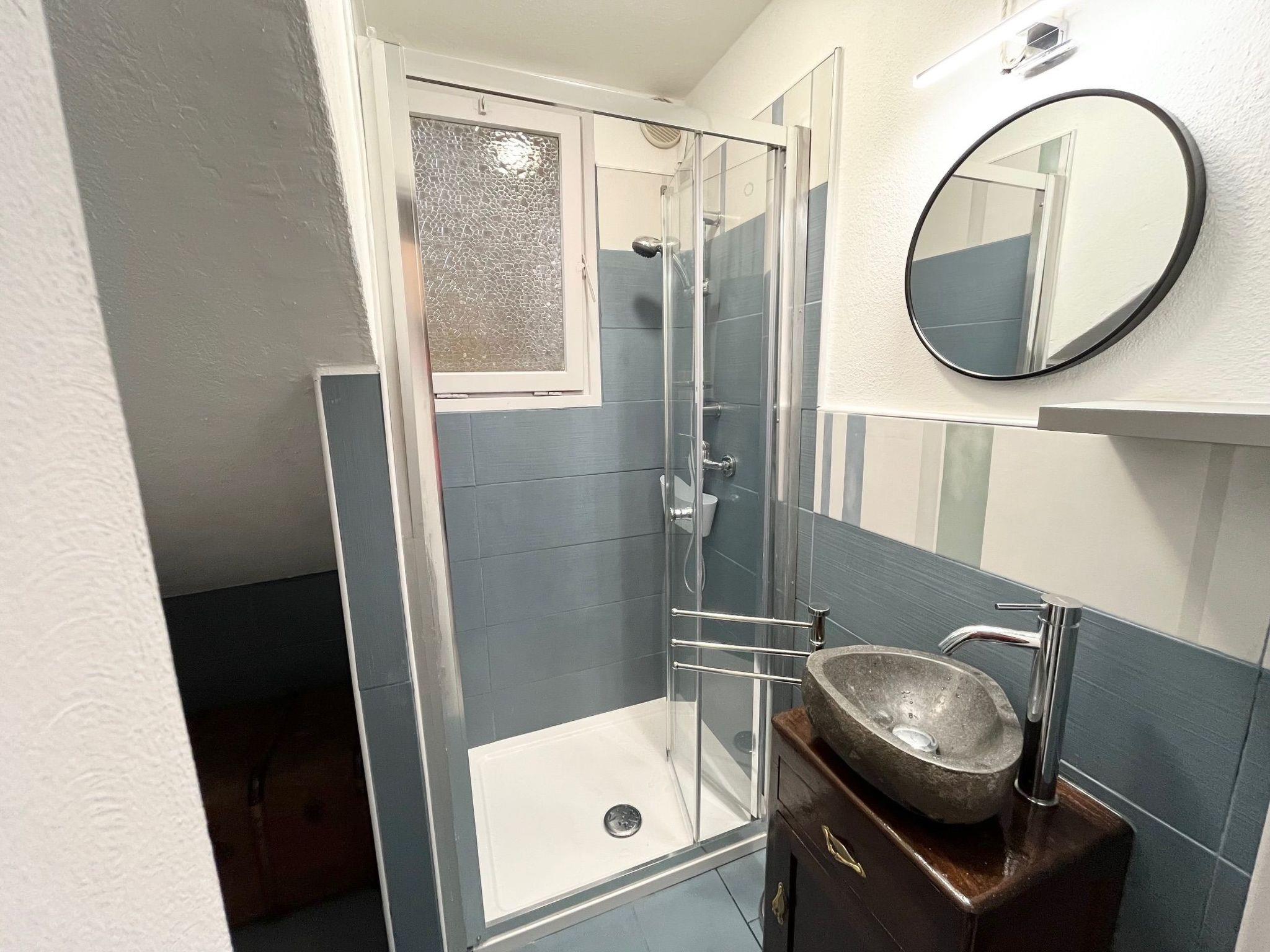 The kitchen is fully equipped, including a wood stove that adds a distinctive touch. Stone-adorned walls add a sense of authenticity, while the fireplace creates a cozy, relaxing atmosphere.