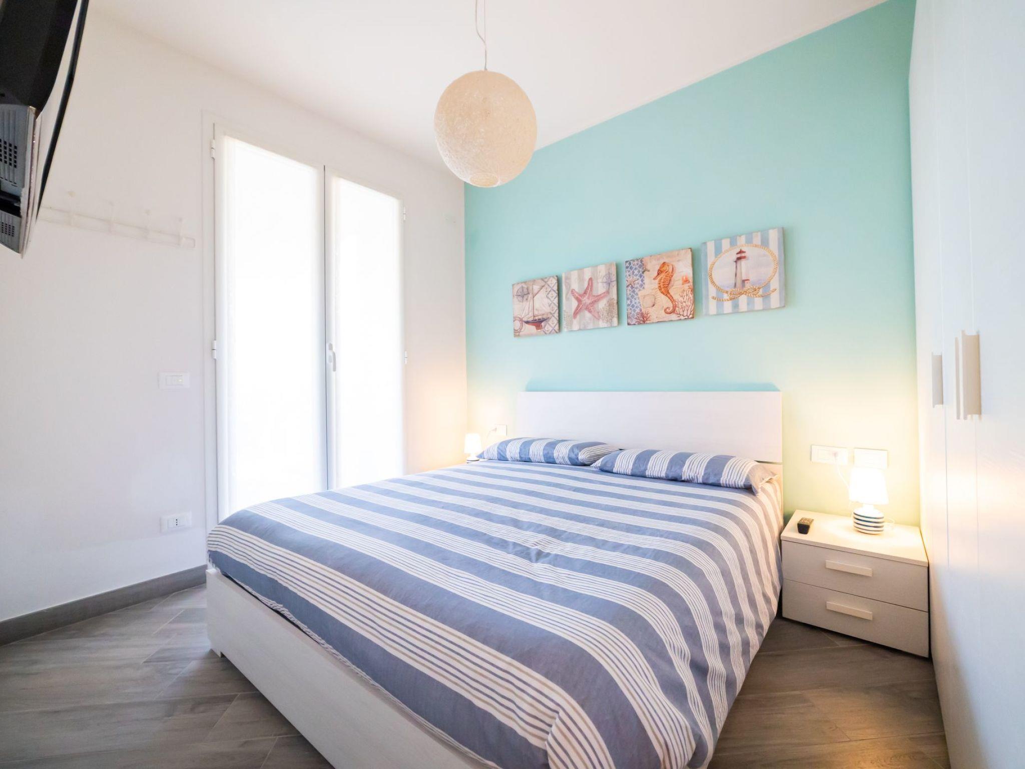 In the double bedroom, in which the white is matched by the sea green of the wall behind the bed, there is a full-wall wardrobe, bedside tables and a second flat-screen TV, hanging; in the ultra-modern bathroom with washing machine the shower cubicle has a resin floor, and the sanitary ware is suspended. Air conditioning and heating are provided by splits in each room. Residential parking space and unlimited Wi-Fi are available.