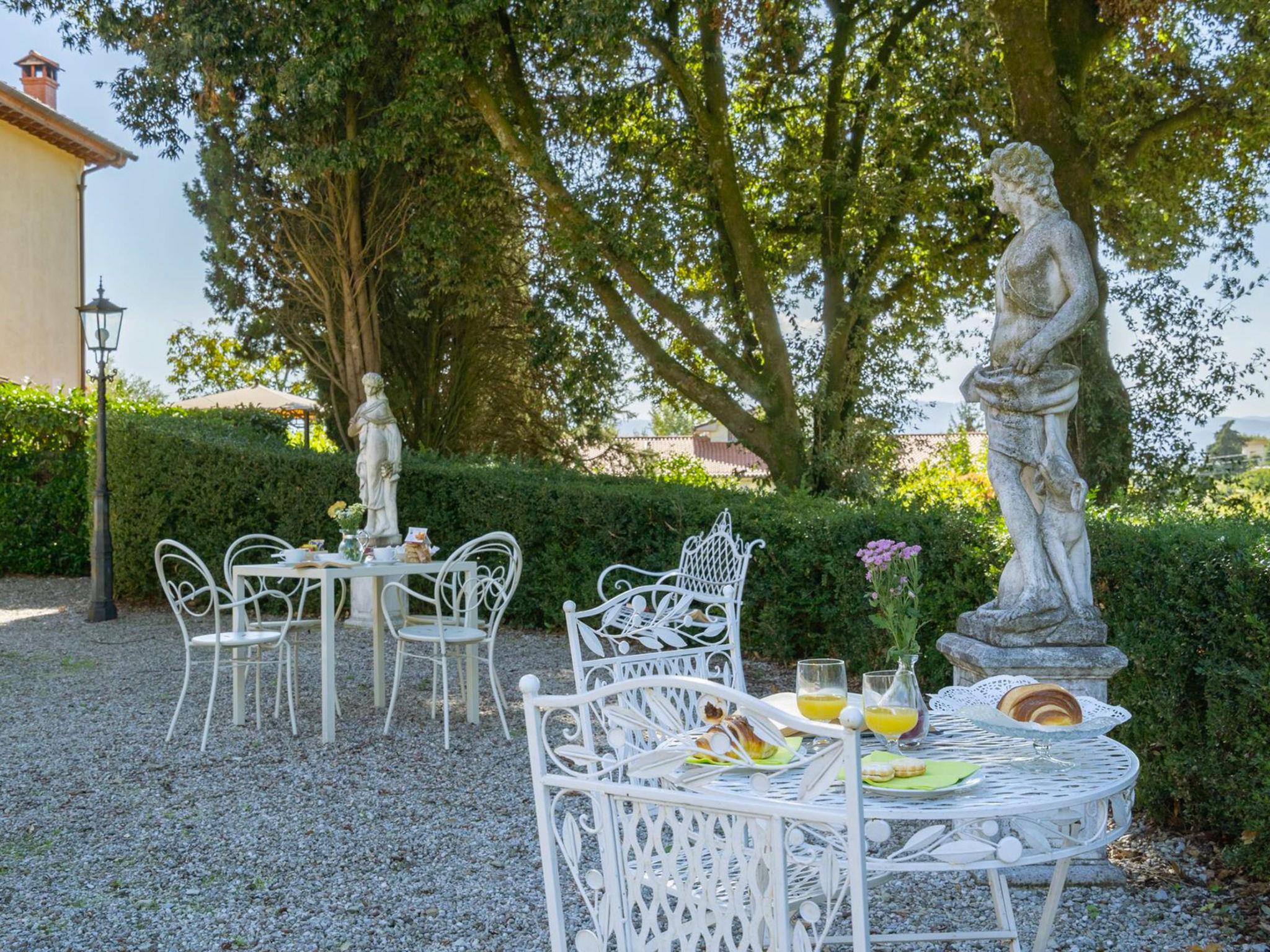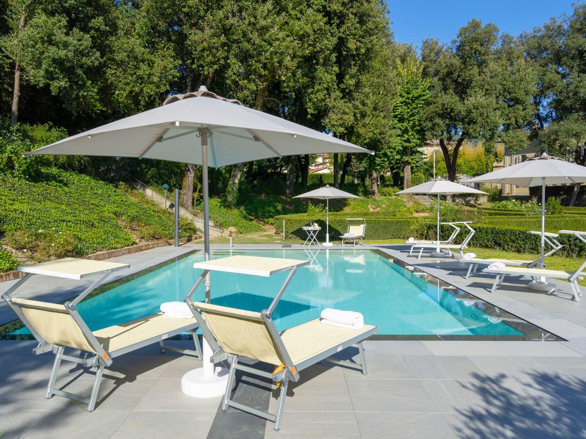 Villa Beatrice located in a hilly position half an hour by car and train from Florence (the train station is 1600 meters from the property) 10 minutes from the Mugello racetrack and the Golf %26 Country Club “Poggio dei Medici ”, an excellent starting point for visiting the surroundings of Mugello and the art cities of Tuscany. The villa, dating back to 1700 and recently renovated, is arranged on several levels and includes 6 autonomous units for a total of 26 people. The furnishings are finely cared for in detail, guaranteeing the atmosphere and authenticity of an eighteenth-century villa, with stylish furniture and antique elements. The structure lends itself very well to being rented as a single environment as on the ground floor there is a large dining room where you can all comfortably eat together, while on the first floor there is a fully equipped common professional kitchen. The use of the professional kitchen is permitted exclusively to the chef appointed by the property or to professionals with HACCP certification, subject to the property's approval. Villa "Beatrice", 600 m a.s.l., detached, built in 1700, renovated in 2018. 6.7 km from the centre of Borgo San Lorenzo, 12.5 km from the centre of Vicchio, 38 km from the centre of Firenze, in a secluded, quiet, sunny position on top of a hill, 20 km from the lake. Private: park (fenced), swimming pool (6 x 11 m, depth 150 cm, seasonal availability: 18.May. - 30.Sep.). Garden furniture, barbecue. In the house: central heating system, heating to be paid on the spot, heating available only from 01.Nov. - 04.Apr.. House maid daily on request (extra). Cook on request (extra). Parking on the premises. Shop 6 km, supermarket 15 km, restaurant 1.2 km, bus stop 300 m, railway station "Borgo San Lorenzo" 6 km, bathing lake "Bilancino" 20 km. Golf course (18 hole) 8 km. Nearby attractions: Autodromo del Mugello 11 km, Scarperia 17 km, Marradi 27 km, Firenzuola 30 km, Fiesole 31 km. Please note: suitable for families.