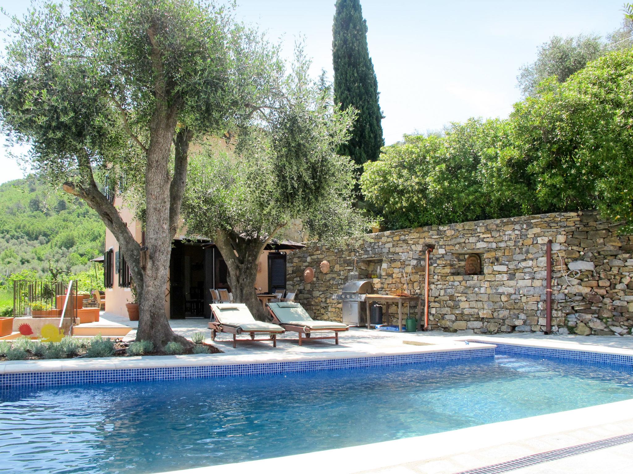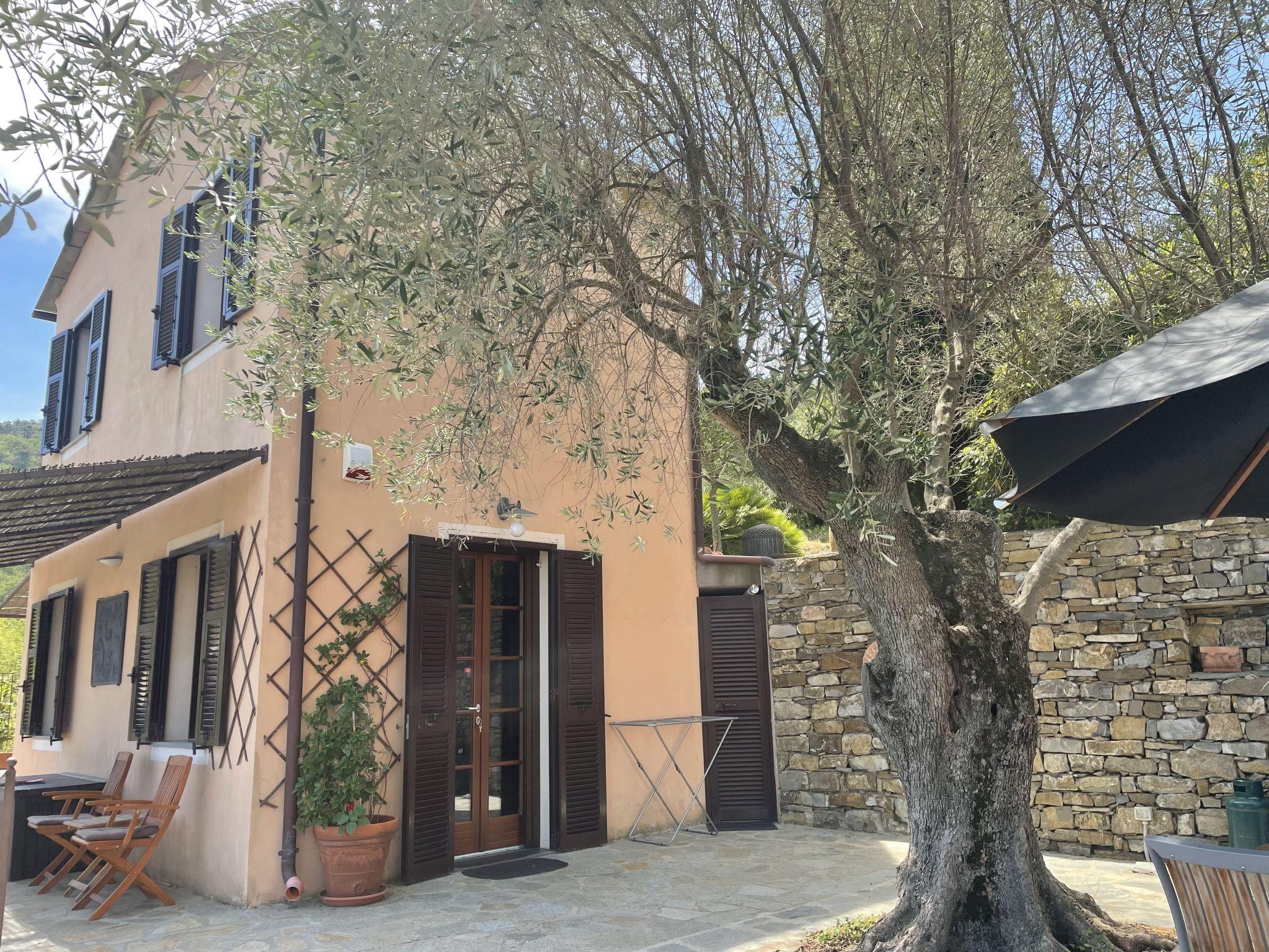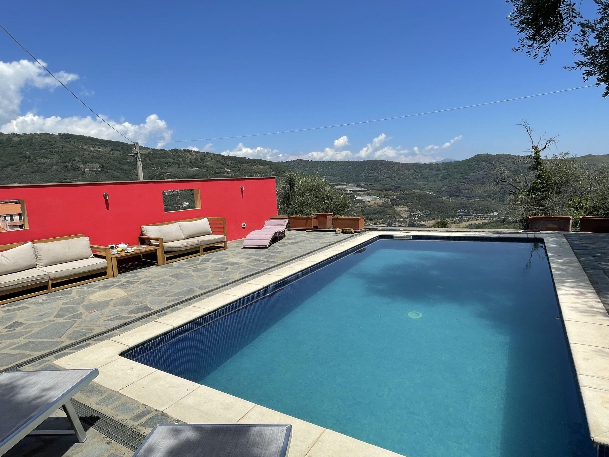 Comfortable single-family house "Il Rifugio", 380 m a.s.l., detached, built in 2011, surrounded by trees and fields. 300 m from the centre of Boscomare, on the outskirts, 9 km from the centre of San Lorenzo al Mare, 15 km from the centre of Imperia, 9 km from the sea. Private: beautiful, well-kept terraced garden, 300 m2 with wildlife garden and trees, swimming pool (7 x 3 m, depth 150 cm, seasonal availability: 15.May. - 01.Oct.). Outdoor shower, patio, terrace, garden furniture. In the complex: sun terrace. Stepped path (14 steps) to the house. Parking at the house. Shop 4 km, supermarket 9 km, restaurant, bus stop 200 m, railway station "Imperia Porto Maurizio" 15 km, sandy beach "San Lorenzo al Mare" 9 km, indoor swimming pool 15 km. Golf course (18 hole) 32 km.