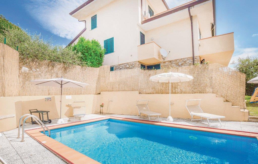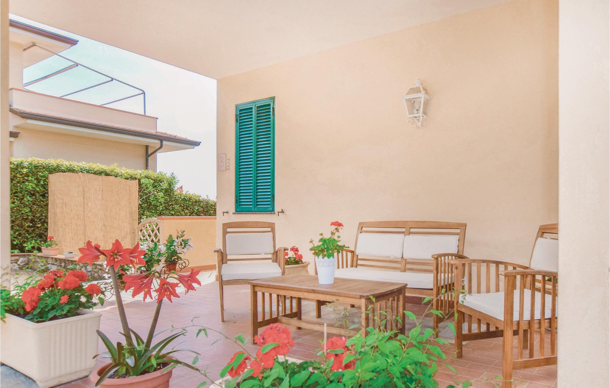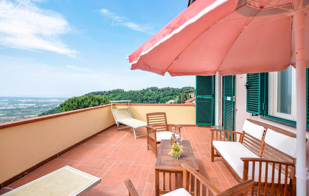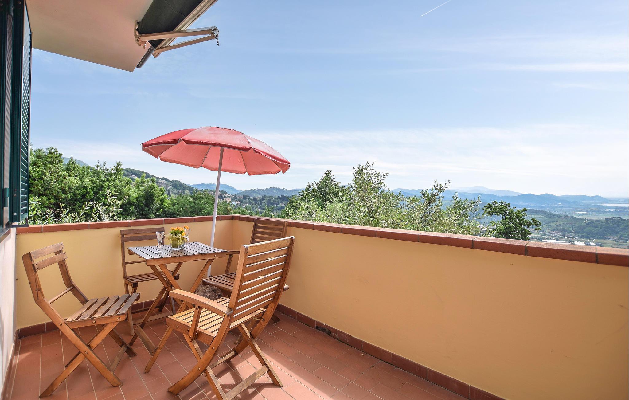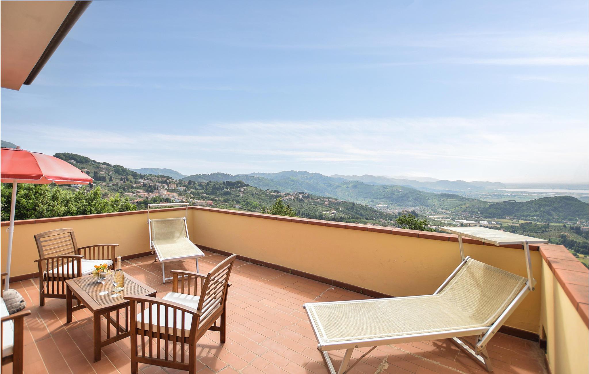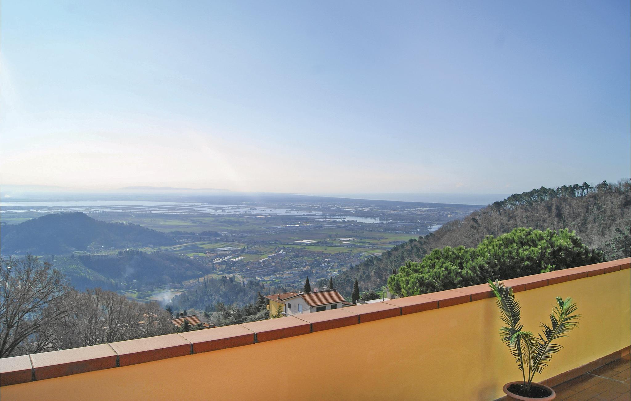 Vakkert feriehus i tre etasjer i en kupert beliggenhet (260 m.o.h.) med havutsikt i innlandet av Viareggio og over en liten landsby som heter Botrici. Fra feriehuset og eiendommen kan du nyte en panoramautsikt helt til havet, Massaciuccoli-sjøen og de skogkledde åsene. Rundt huset er det et uteområde på ca 200 m2, delvis skrånende, med bord, stoler, solstoler, barnespill og en mursteinsgrill. Du kan spise måltidene dine på den overbygde terrassen så vel som på en stor åpen terrasse med havutsikt. Bassenget er til din eksklusive disposisjon. I underetasjen finner du et utstyrt kjøkken, en spisestue med satellitt-TV, et dobbelt soverom, et dusjrom, et treningsrom og den overbygde terrassen. I første etasje finner du stuen med sovesofa og tilgang til den store utstyrte terrassen med havutsikt, et lite kjøkken, et dobbelt soverom og et dusjrom. I 1. etasje finner du et soverom med køyeseng, et dobbelt soverom med utgang til en stor terrasse med havutsikt og et bad med badekar. Avstander: 9 km Viareggio, kjent for sin vakre strandpromenade med edle butikker, restauranter og kinoer og også for karnevalet. I Pietrasanta (15 km) finner du kunstgallerier, restauranter, vinbutikker og butikker av alle slag. Men fremfor alt er det verdt å besøke San Martins katedral, San Agostino-kirken og byens teater. Du vil også finne verk av internasjonalt anerkjente skulptører overalt i gatene. Lucca (28 km) er kjent for sine historiske monumenter og sin intakte bymur fra 1500-tallet. 30 km Pisa, 78 km Cinque Terre-området, 101 km Firenze. 500 m matbutikk, 5 km supermarkeder og rideskole, 10 km tennis, 11 km gratis og utstyrte strender.