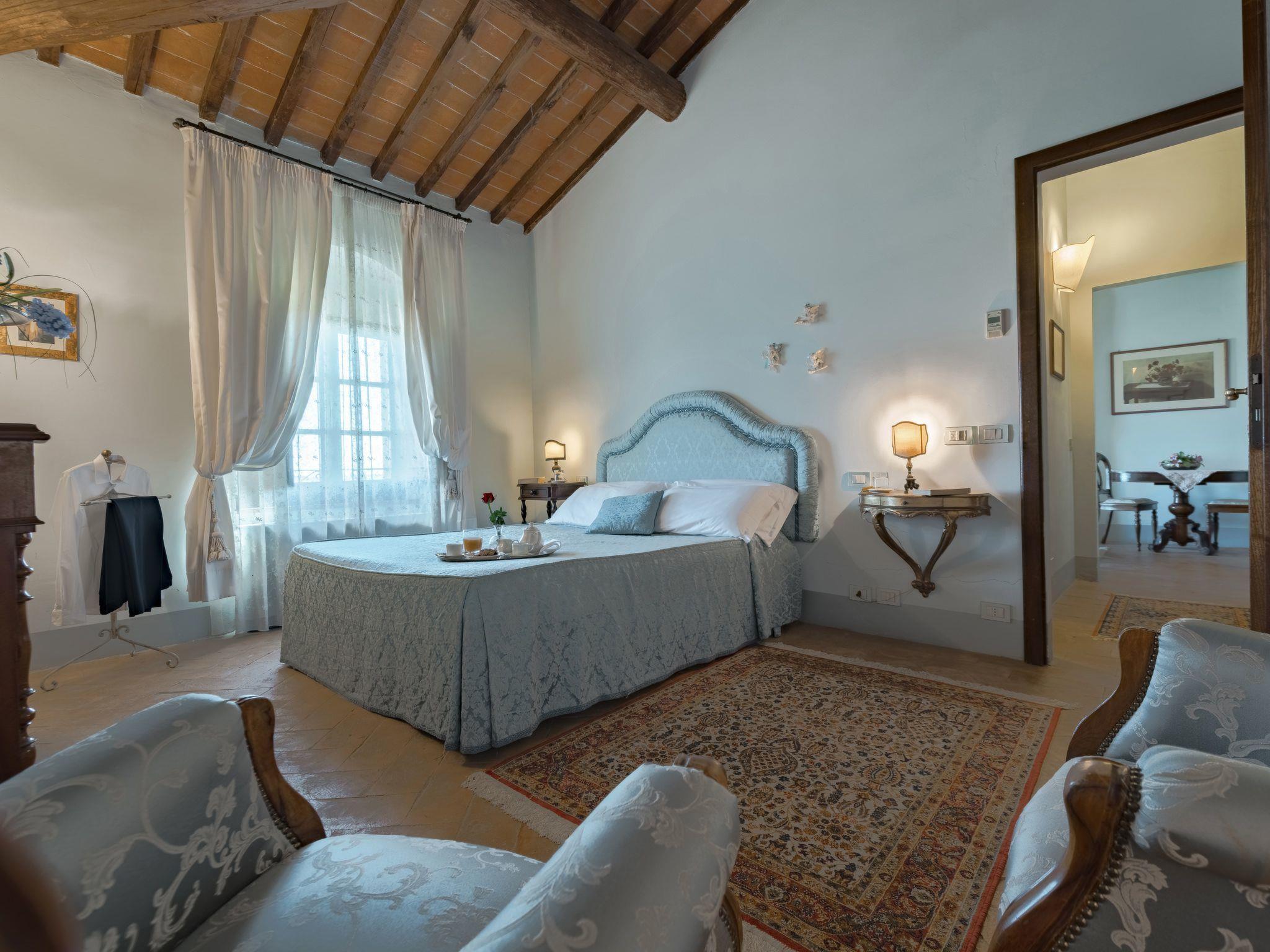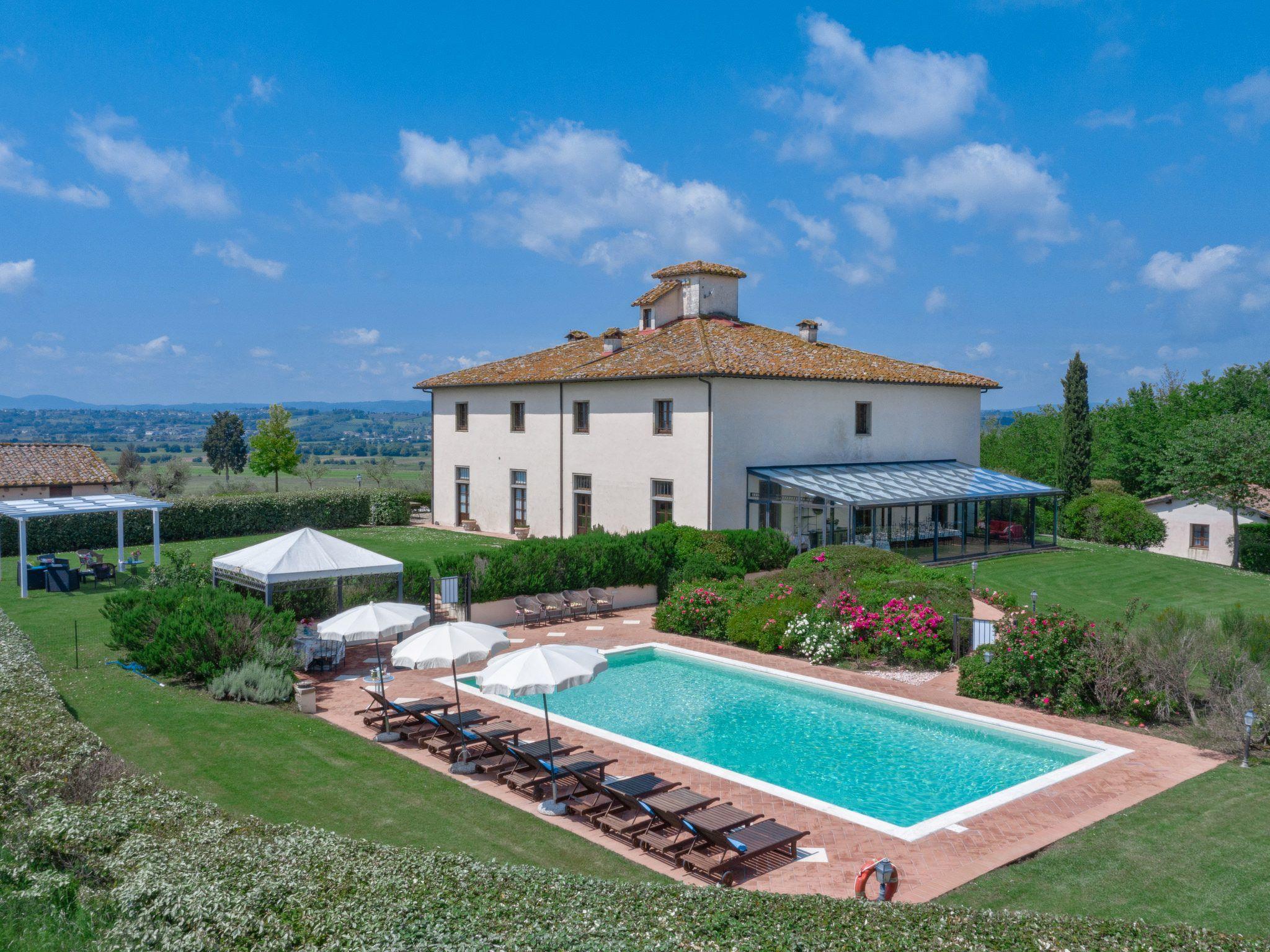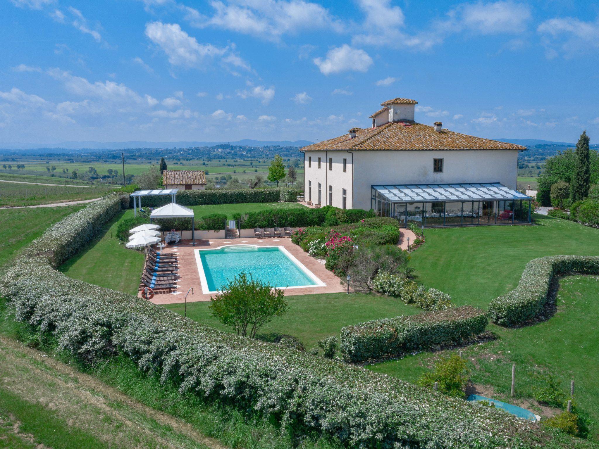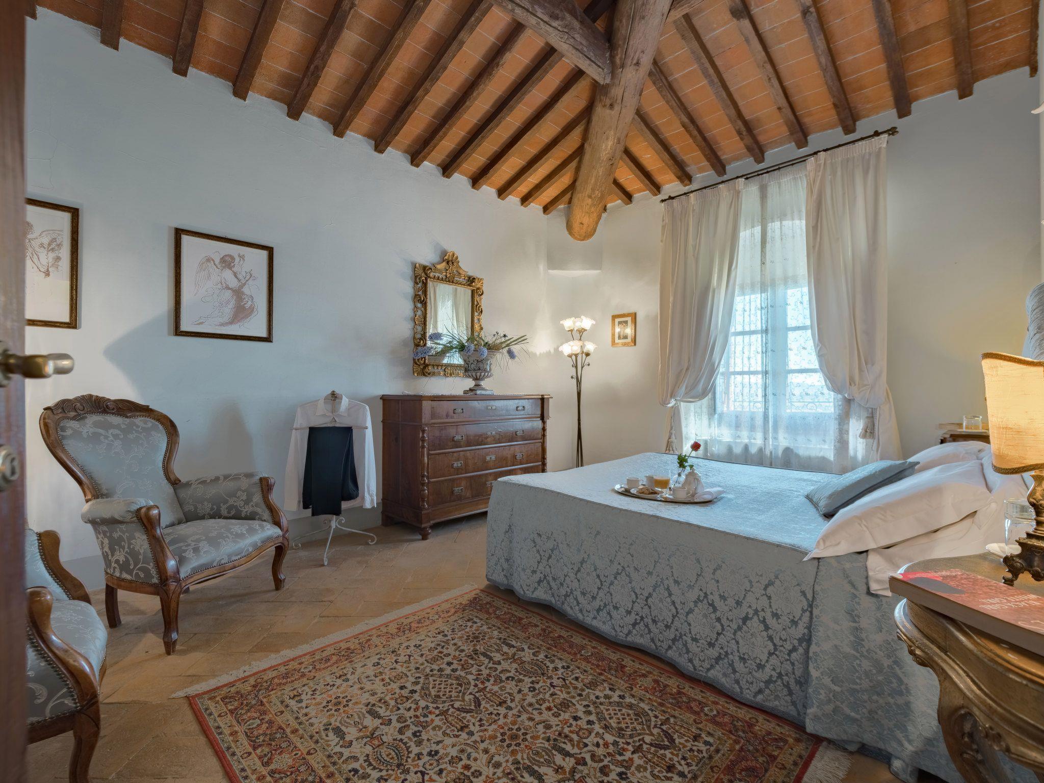 This fantastic villa is surrounded by olive groves and gardens and is ideal for an unforgettable, relaxing holiday in one of Tuscany's most beautiful landscapes: the Val di Chiana. Here you will be close to renowned cities of art and history such as Florence, Siena, Cortona, Assisi, Montepulciano and the Chianti area. The villa retains its original architectural style, with terracotta floors, doors and windows with stone frames and ceilings with wooden beams and bricks. The period furnishings of the interiors, enriched with vintage objects and attention to detail, contribute to creating an exclusive atmosphere.