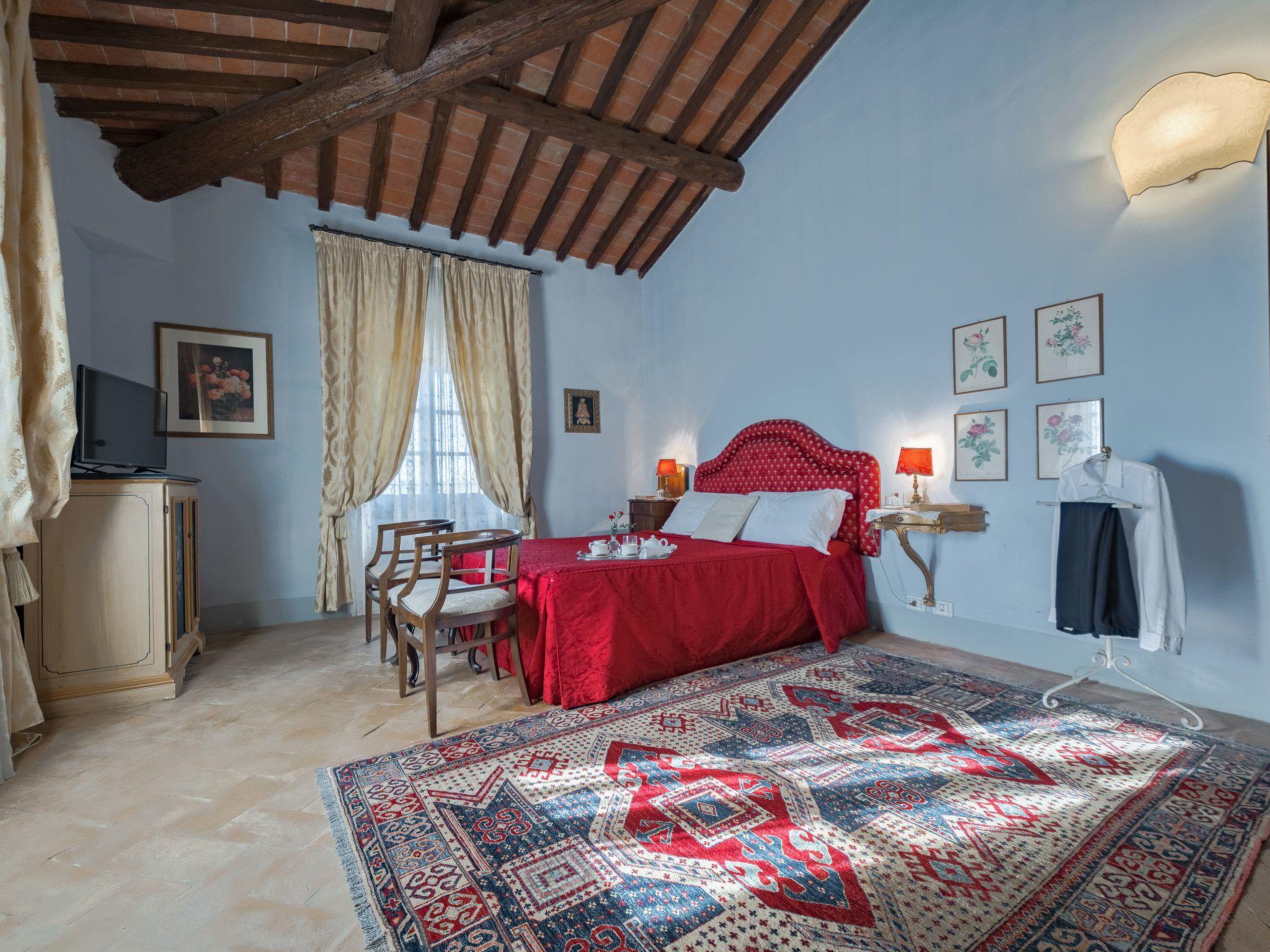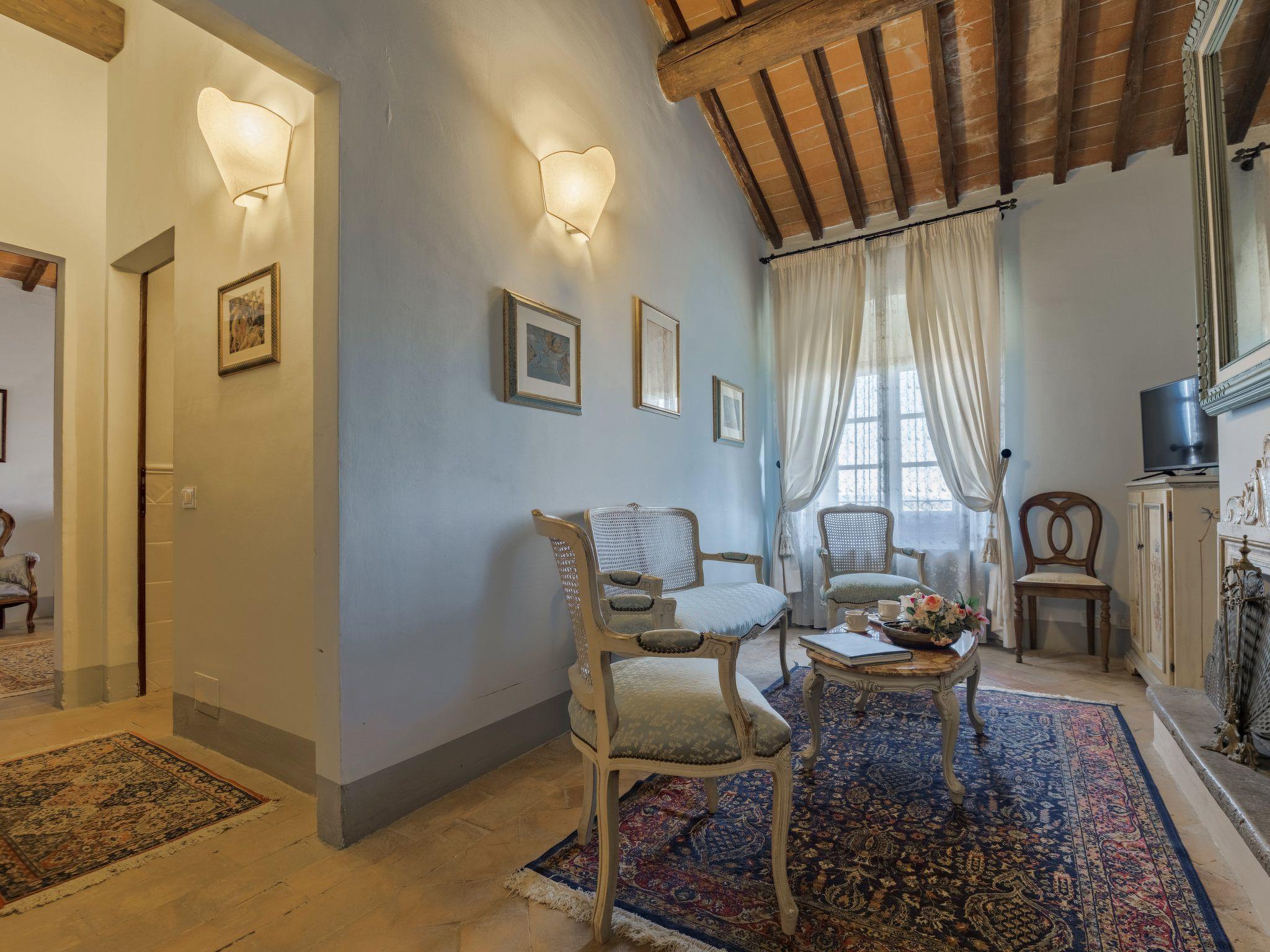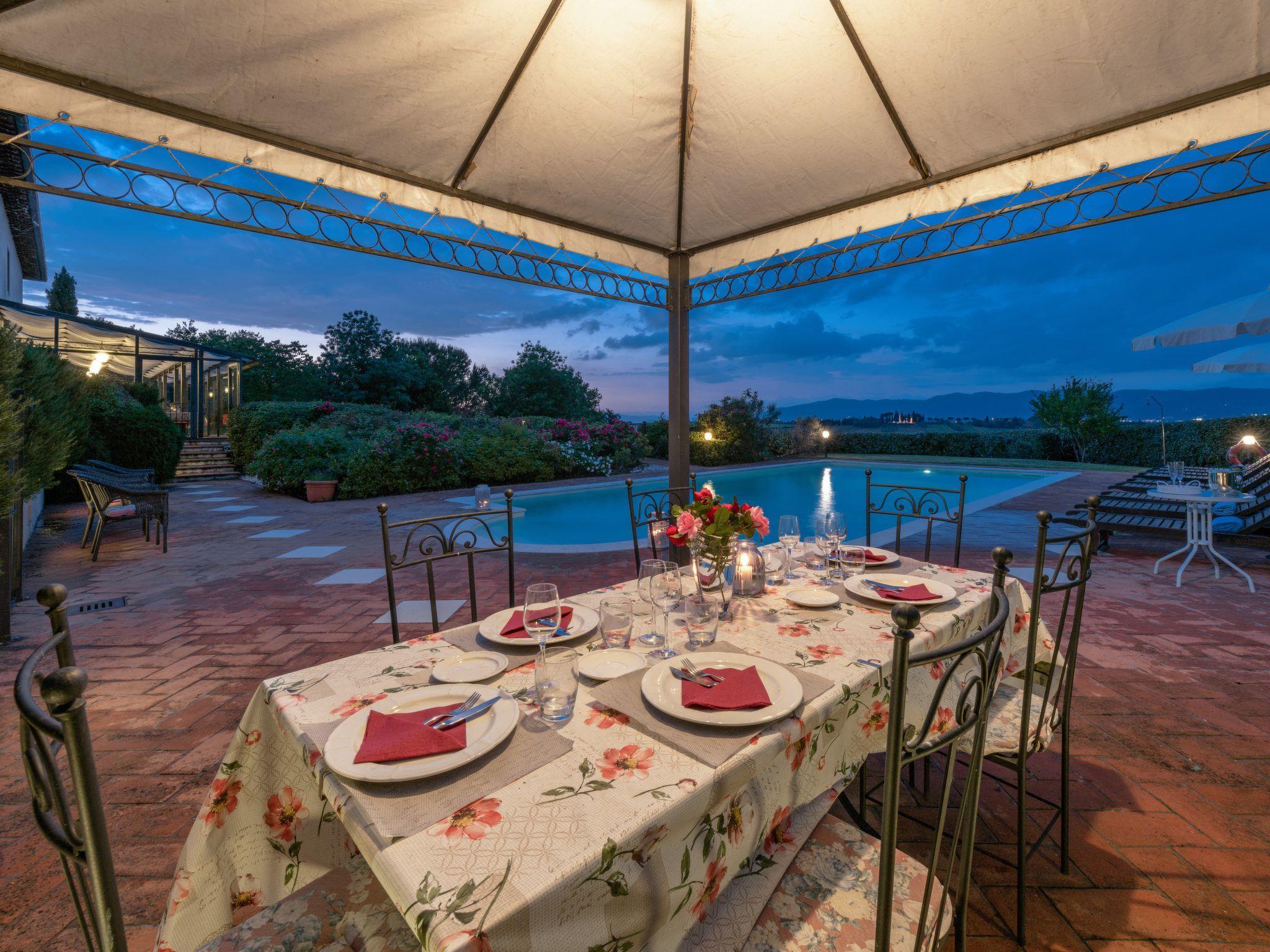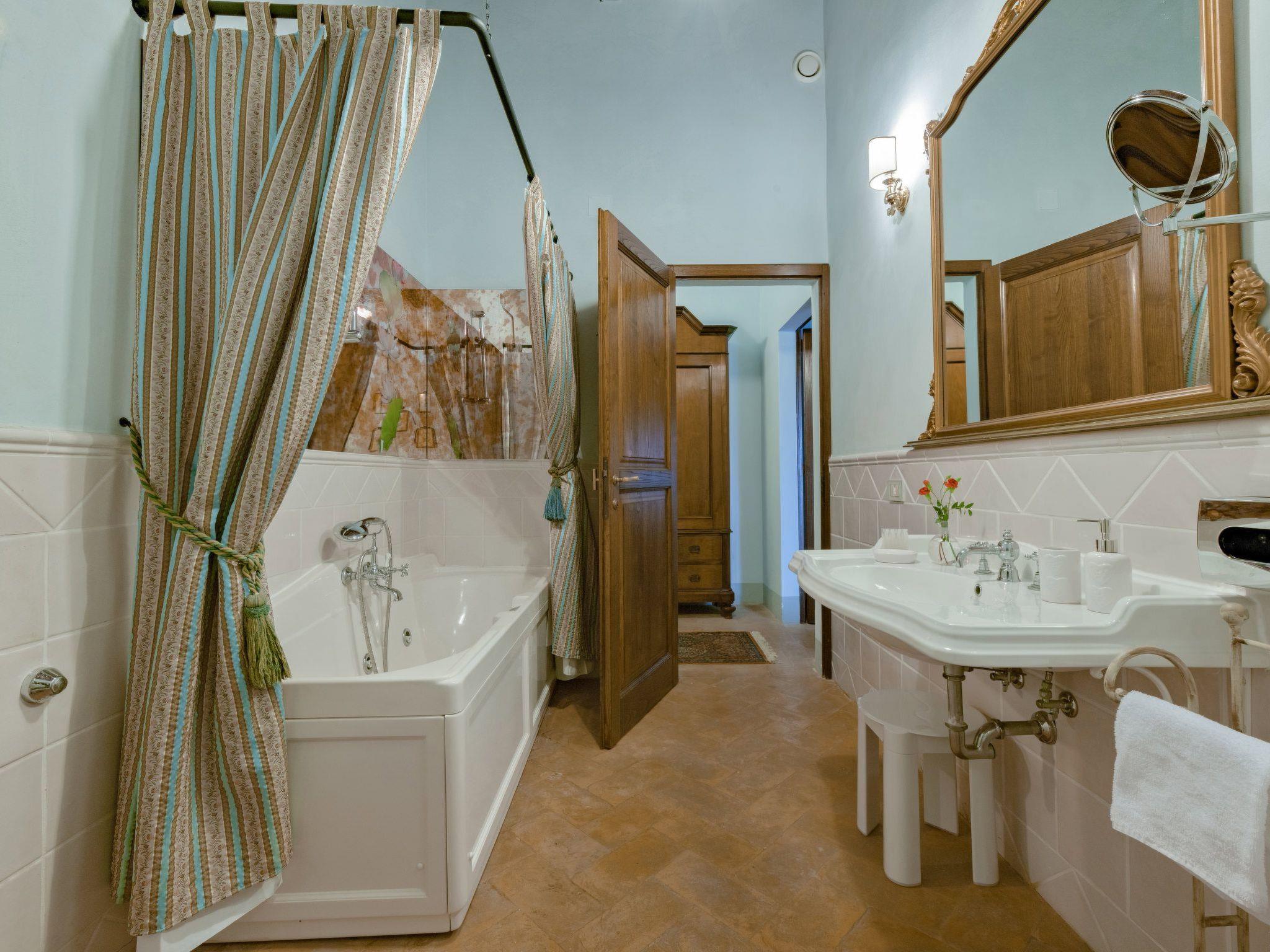 This fantastic villa is surrounded by olive groves and gardens and is ideal for an unforgettable, relaxing holiday in one of Tuscany's most beautiful landscapes: the Val di Chiana. Here you will be close to renowned cities of art and history such as Florence, Siena, Cortona, Assisi, Montepulciano and the Chianti area. The villa retains its original architectural style, with terracotta floors, doors and windows with stone frames and ceilings with wooden beams and bricks. The period furnishings of the interiors, enriched with vintage objects and attention to detail, contribute to creating an exclusive atmosphere.