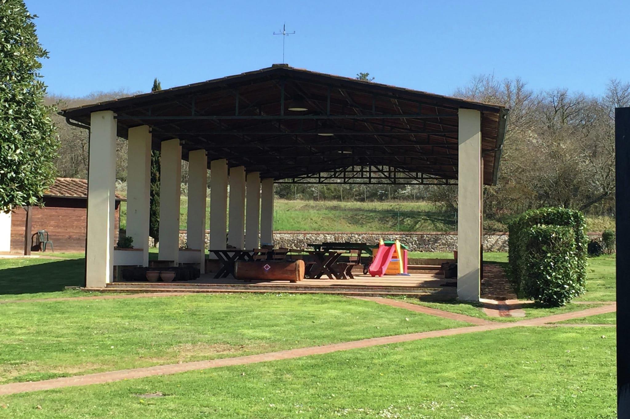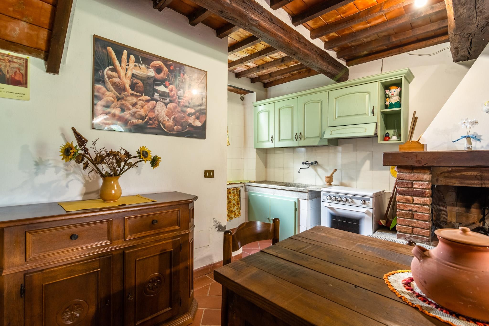 Dette sjarmerende gårdshuset ligger i det naturskjønne landskapet i Bucine, og er et ideelt tilfluktssted for en familie eller en gruppe på fire. Med 2 koselige soverom og et romslig kjøkken med sovesofa og peis, tilbyr hjemmet en varm og innbydende atmosfære. Gå inn på terrassen foran for rolig utsikt over tennisbanen og bassenget, perfekt for avslappende kvelder. Våningshuset er utstyrt med moderne bekvemmeligheter, inkludert TV, espressomaskin, kjøleskap med fryser og felles vaskemaskin. Gjestene kan nyte en rekke aktiviteter med tilgang til et felles svømmebasseng (15 x 7 m), en tennisbane, bordtennis, en boulebane og et lekeområde for barn. To kjæledyr er velkomne gratis, og oppvarming er tilgjengelig mot en nominell avgift. Bare 2 km fra Bucines sentrum og 3 km fra lokale butikker, er beliggenheten både fredelig og praktisk. Enten du slapper av i hagen med en toskansk solnedgang eller utforsker det nærliggende landskapet, tilbyr dette kjæledyrvennlige hjemmet med WiFi alt du trenger for en avslappende toskansk flukt.