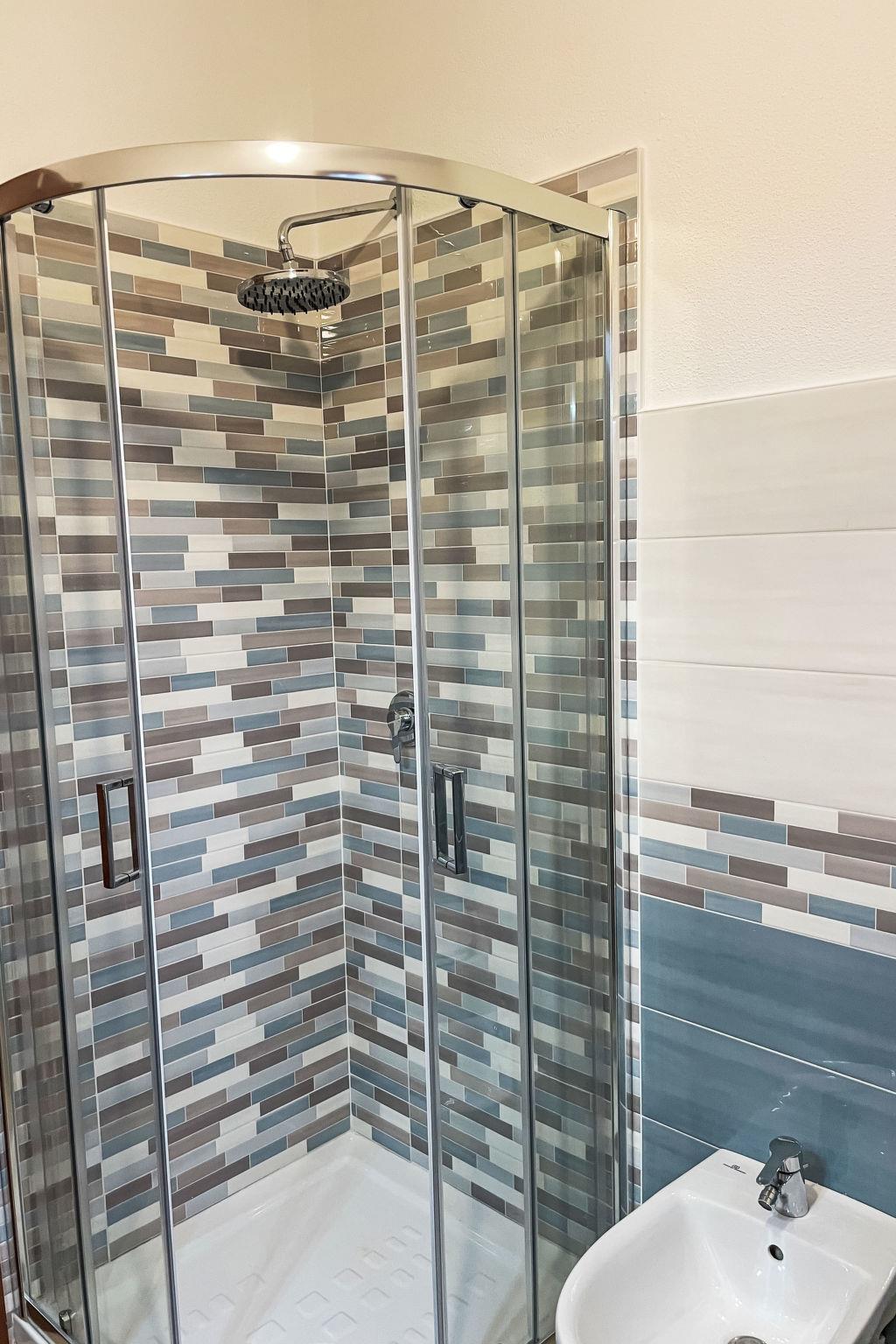 "Cielo Holiday House", 3-room apartment 70 m2 on 1st floor. Modern and stylish furnishings: living/dining room with 1 double sofabed, dining table and TV. 1 room with 1 double bed. 1 room with 2 beds. Open kitchen (oven, dishwasher, Gas stove, toaster, kettle, microwave, freezer, electric coffee machine). Shower/bidet/WC. Electric heating, air-conditioning. Terrace roofed. Terrace furniture. Partial view of the sea. Facilities: washing machine, children's high chair, hair dryer. Internet (WiFi, free). Please note: non-smokers only. Smoke alarm, fire extinguisher. IT90091B4000E2349